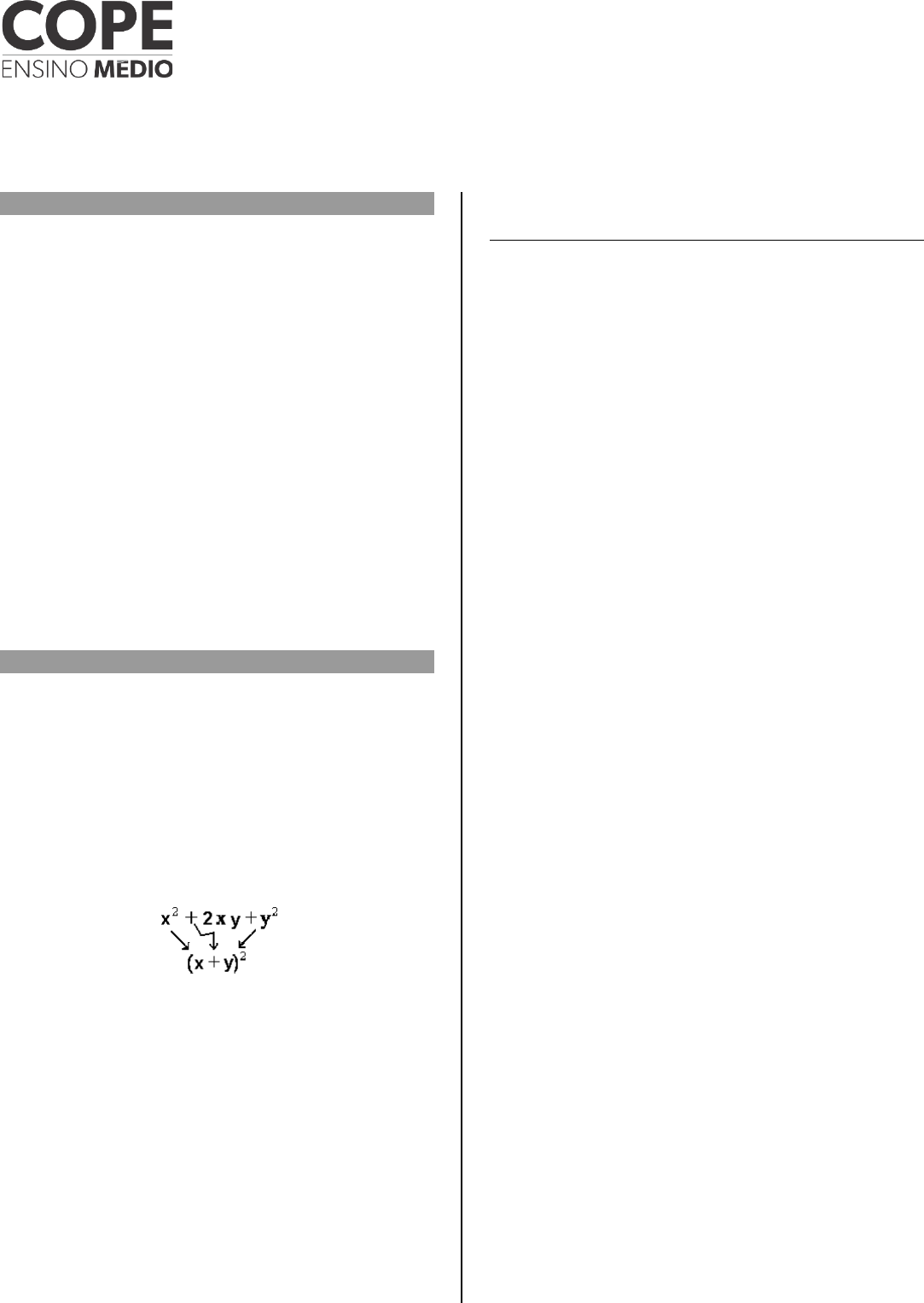LISTA DE EXERCÍCIOS PRODUTOS NOTÁVEIS E FATORAÇÃO PROFESSORA: ARACÉLI MARTINS PRODUTOS NOTÁVEIS 1) QUADRADO DA SOMA DE DOIS TERMOS (x + y)2 = x2 + 2xy + y2. 2) QUADRADO DA DIFERENÇA DE DOIS TERMOS (x – y)2 = x2 – 2xy + y2 3) PRODUTO DA SOMA PELA DIFERENÇA (x + y) . (x – y) = x2 – y2 4) CUBO DA SOMA DE DOIS TERMOS (x + y)3 = x3 + 3x2y + 3xy2 + y3. 5) CUBO DA DIFERENÇA DE DOIS TERMOS (x – y)3 = x3 – 3x2y + 3xy2 – y3. 6) QUADRADO DA SOMA DE TRÊS TERMOS (x + y + z)2 = x2 + y2 + z2 + 2xy + 2yz + 2xz FATORAÇÃO Fatorar uma expressão significa escrevê-la como o produto de dois ou mais fatores. 01) FATOR COMUM: ab ± ac = a(b± c) 02) AGRUPAMENTO: ax + by + ay + bx = a(x + y) + b(x + y) = (a + b) ⋅ (x + y) 03) TRINÔMIO QUADRADO PERFEITO 4) DIFERENÇA DE DOIS QUADRADOS x2 – y2 = (x + y) ⋅ ( x – y ) 05) DIFERENÇA DE DOIS CUBOS x3 – y3 = ( x – y ) ⋅ (x2 +xy + y2) 06) SOMA DE DOIS CUBOS x3 + y3 = ( x + y ) ⋅ (x2 – xy + y2) 07) TRINÔMIO DO SEGUNDO GRAU ax2 + bx + c = a(x – x’)( x – x”) Sendo: S = – b/a = x’ + x’’ P = c/a = x’ . x’’ 08) POLINÔMIO DO TERCEIRO GRAU x3 + 3x2.y + 3x.y2 + y3 = (x + y)3 Exercícios 01. Utilizando as regras dos produtos notáveis, calcule: a) (2x + 7)² = b) ( x – y)² = c) (9x + 1)(9x – 1) = d) (3y – 5)² = e) (a – 4y)² = f) (ab + a) (ab – a) = g) (2x + 3xy)² = h) ( 10x – ab)² = i) (x – 4)(x +4) j) (x + 2)(x – 2) = 02. Resolva os problemas abaixo usando produtos notáveis ou fatoração. a) Qual é o valor de x – y, sabendo que x + y = 7 e x² – y² = 42? b) Se (x + y)² = 144 e x² + y² = 104, determine o valor de x.y c) Se x + y = 9 e x – y = 5, então o valor de x² - y² é: 03. Aplicando os casos de fatoração estudados, fatore os polinômios, indicando o caso utilizado: a) xx 5 2 + = b) 9124 2 +− xx = c) 842 23 −+− xxx = d) 94 2 −x = e) 356 65 aaa +− = f) bbxaax −+− = g) 258064 2 ++ yy = h) 223 yxyyxx −+− = i) mama 23 2015 − = j) 𝑥𝑥3 − 9𝑥𝑥2 + 27𝑥𝑥 − 27 = k) 𝑥𝑥2 − 7𝑥𝑥 + 12 = l) 8𝑦𝑦3 + 12𝑦𝑦2 + 6𝑦𝑦 + 1 = m) 𝑥𝑥2 + 5𝑥𝑥 − 6 = n) 𝑥𝑥3 + 64 = o) 27𝑥𝑥3 − 8 = 05. Se x + x 1 = 3, então o valo de x3 + 3 1 x é: a) 9 b) 18 c) 27 d) 54 e) 40 06. Indagado sobre o número de processos que havia arquivado certo dia, um Técnico Judiciário, que gostava muito de Matemática, respondeu: _ O número de processos que arquivei é igual a (12,25)2 – (10,25)2 Chamando x o total de processos que ele arquivou, então é correto afirmar que: a) 38 < x < 42. b) x > 42 b) x < 20. c) 20 < x < 30. c) 30 < x < 38 07. Seja N o resultado da operação 3705² – 3704². A soma dos algarismos de N é: a) 18 b) 19 c) 20 d) 21 e) 22 08. Efetuando-se (579865)² – (579863)², obtém-se a) 4 b) 2 319 456 c) 2 319 448 d) 2 086 246 e) 1 159 728 09. Se x – y = 7 e xy = 60, então o valor da expressão x² + y² é: a) 53 b) 109 c) 169 d) 420 10. A expressão (x – y)² – (x + y)² é equivalente a: a) 0 b) 2y² c) -2y³ d) -4xy 11. Sabe-se que x e y são as medidas dos lados de um retângulo de área 32 e perímetro 24. Fatore a expressão 3x2y + 3xy2 e determine o seu valor numérico nas condições dadas. 12. Fatore a expressão, simplifique-a e calcule seu valor numérico, sendo a – b = 3,0. 22 22 22 44 . 2 ba ba baba ba + − ++ − 13. Após analisar as afirmações a seguir sobre produtos notáveis e fatoração, marque com (V) o que for verdadeiro e, com (F), o que for falso. ( ) (3a2 – 2b)2 = 9a4 – 12a2b + 4b2 ( ) (a – b)3 = a3 – b3 ( ) 64a2 – 49b2 = (8a – 7b)(8a + 7b) ( ) 4a2 – 16b2 = (2a – 4b)2 ( ) a3 + b3 = (a + b)(a2 – ab + b2) Assinale a alternativa que contém a ordem CORRETA de preenchimento dos parênteses, de cima para baixo. a) V,F,V,F,V b) V,V,F,F,F c) V,F,V,V,F d) F,F,V,V,V e) F,V,F,V,V 14. Uma indústria fabrica uma placa metálica no formato de um retângulo de lados (ax + by) e (bx + ay). Encontre, de forma fatorada, o perímetro deste retângulo. a) 2(a + b)(x + y). b) 4(a + b)(x + y). c) 2(a – b)(x – y). d) 4(a – b)(x – y). e) (a + b)(x + y). 15. Assinale a alternativa que apresenta o valor de x, sendo x2 = √4 + 1026.1022 a) 16 b) 32 c) 1024 d) 36 e) 24 16. A diferença entre o quadrado da soma e o quadrado da diferença entre dois números reais é igual a: a) a diferença dos quadrados dos dois números. b) a soma dos quadrados dos dois números. c) a diferença dos dois números. d) ao dobro do produto dos números. e) ao quádruplo do produto dos números. Gabarito: 01. a) (2x + 7)² = 4x² + 28x + 49 b) ( x - y )² = x² - 2xy + y² c) (9x + 1)(9x – 1 ) = 81x² - 1 d) (3y – 5)² = 9y² - 30y + 25 e) (a - 4y)² = a² - 8ay + 16y² f) (ab + a) (ab – a) = (ab)² - a² g) (2x + 3xy)² = 4x² + 12x²y + 9x²y² h) ( 10x – ab)² = 100x² - 20abx + a²b² i) (x – 4)(x +4) = x² - 16 j) (x + 2)(x – 2) = x² - 4 02. a) x – y) = 6 b) xy = 20 c) 45 = x² - y² 03. a) xx 5 2 + = x (x + 5) FC b) 9124 2 +− xx = (2x – 3)² TQP c) 842 23 −+− xxx = (x – 2) . (x² + 4) AG d) 94 2 −x = (2x – 3) . (2x + 3) DQ e) 356 65 aaa +− = a³ (a³ - 5² + 6 ) FC f) bbxaax −+− = ( x – 1 ) . ( a + b) AG g) 258064 2 ++ yy = (8y + 5) ² TQP h) 223 yxyyxx −+− = (x² + y) . (x – y) AG i) mama 23 2015 − = 5a²m (3a – 4) FC j) 𝑥𝑥3 − 9𝑥𝑥2 + 27𝑥𝑥 − 27 = (x – 3)3 CD k) 𝑥𝑥2 − 7𝑥𝑥 + 12 = (x – 3).(x – 4) T2oGrau l) 8𝑦𝑦3 + 12𝑦𝑦2 + 6𝑦𝑦 + 1 = (2y + 1)3 CS m) 𝑥𝑥2 + 5𝑥𝑥 − 6 = (x + 6).(x – 1) T2oGrau n) 𝑥𝑥3 + 64 = (x + 4).(x2 – 4x + 16) SC 𝑜𝑜) 27𝑥𝑥3 − 8 = (3x – 2).(9x2 + 6x + 4) 05. B 06. B 07. C 08. B 09. C 10. D 11. 278 12. 9,0 13. A 14. E 15. B 16. E PRODUTOS NOTÁVEIS FATORAÇÃO Fatorar uma expressão significa escrevê-la como o produto de dois ou mais fatores. 01) FATOR COMUM: ab ac = a(bc) 03) TRINÔMIO QUADRADO PERFEITO