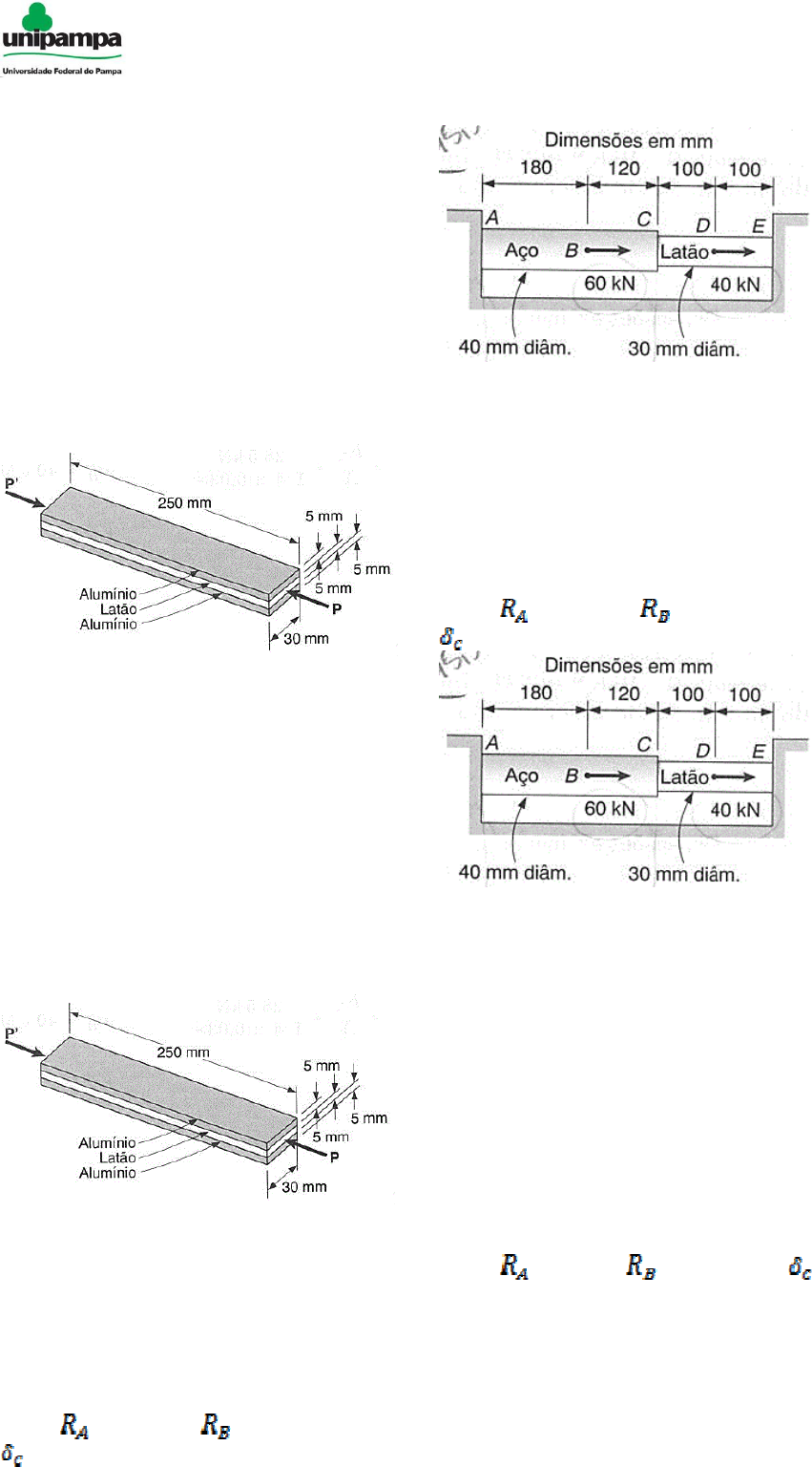 Resistência dos Materiais I LISTA DE EXERCÍCIOS V Deformação e Deformação Térmica 2.34 Uma barra de 250 mm de comprimento, com secção transversal retangular de 15 x 30 mm, consiste de duas lâminas de alumínio (E = 70 GPa), de 5 mm de espessura, e no centro de uma lâmina de latão (E = 105 GPa), com a mesma espessura. Se ela está sujeita a uma força centrada, P = 30 kN, determinar a tensão normal (a) nas lâminas de alumínio; (b) na lâmina de latão. R: (a) – 57,1 MPa; (b) – 85,7 MPa. Fig. P2.34 2.35 Uma barra de 250 mm de comprimento, com secção transversal retangular de 15 x 30 mm, consiste de duas lâminas de alumínio (E = 70 GPa), de 5 mm de espessura, e no centro de uma lâmina de latão (E = 105 GPa), com a mesma espessura. Se ela está sujeita a uma força centrada, P = 45 kN, determinar a deformação desta barra composta. R: � = - 306 mm. Fig. P2.35 2.38 Duas barras cilíndricas, uma de aço (E = 200 GPa) e outra de latão (E = 105 GPa), são ligadas em C e engastadas em A e E. Para o carregamento indicado, determinar: (a) as reações em A e E; (b) a deflexão no ponto C. R: (a) = 62,8 kN; = 37,2 kN; (b) = 46,3 µm. Fig. P2.38 2.39 Duas barras cilíndricas, AC de latão (E = 105 GPa) e outra CE aço (E = 200 GPa), são ligadas em C e engastadas em A e E. Para o carregamento indicado, determinar: (a) as reações em A e E; (b) a deflexão no ponto C. R: (a) = 45,5 kN; = 54,5 kN; (b) = 48,8 µm. Fig. P2.39 2.44 Duas barras cilíndricas, AC de latão (E = 105 GPa) e outra CE de aço (E = 200 GPa), são ligadas em C. A barra composta é engastada em A, enquanto que existe uma folga de 0,12 mm entre a extremidade E e a parede vertical. Uma força de 60 kN é aplicada em B, e uma de 40 kN em D, ambas horizontais e dirigidas para a direita (como mostrada na Fig. P2.39). Determinar: (a) as reações de apoio em A e E; (b) a deflexão no ponto C. R: (a) = 78 kN; = 22 kN; (b) = 0,1228 mm. Resistência dos Materiais I LISTA DE EXERCÍCIOS V Deformação e Deformação Térmica Fig. P2.44 2.49 Cada um dos parafusos de aço AD e CE (E = 200 GPa) tem um diâmetro de 8 mm e tem suas extremidades superiores rosqueadas, com rosca simples e de passo igual a 2 mm. Sabendo-se que a porca em A, depois de ser perfeitamente ajustada, é apertada de duas voltas completas, determinar: (a) a tração em cada barra; (b) a deflexão no ponto A da barra rígida ABC. R: (a) = 6,24 kN; = 8,32 kN; (b) = 2,76 mm. Fig. P2.49 2.54 A montagem mostrada consiste em um tubo de alumínio (E = 70 GPa; � = 23,6 x /ºC) preenchido com núcleo de aço (E = 200 GPa; � = 11,7 x /ºC) e, com ausência de tensão a uma temperatura de 20ºC. Considerando somente deformações axiais, determine a tensão no tubo de alumínio quando a temperatura atingir 180ºC. R: = - 47 MPa. Fig. P2.54 2.55 A montagem mostrada consiste em um tubo de alumínio (E = 70 GPa; � = 23,6 x /ºC) preenchido com núcleo de latão (E = 105 GPa; � = 20,9 x /ºC) e, com ausência de tensão a uma temperatura de 20ºC. Considerando somente deformações axiais, determine a tensão no tubo de alumínio quando a temperatura atingir 180ºC. R: = - 6,72 MPa. Fig. P2.55 2.58 Uma barra composta de duas porções cilíndricas AB e BC é engastada em ambas as extremidades. A porção AB é de aço (E = 200 GPa; � = 11,7 x /ºC) e a porção BC é de latão (E = 105 GPa; � = 20,9 x /ºC). Sabendo-se que a barra está inicialmente sem tensão, determinar: (a) as tensões normais induzidas nas porções AB e BC, por uma temperatura de 50ºC; (b) a correspondente deflexão no ponto B. R: (a) = -202 MPa; = - 72,6 MPa; (b) = 0,106 mm. Resistência dos Materiais I LISTA DE EXERCÍCIOS V Deformação e Deformação Térmica Fig. P2.58 2.61 Uma barra de alumínio (E = 70 GPa; � = 23,6 x /ºC) e uma haste de aço (E = 200 GPa; � = 11,7 x /ºC) tem as dimensões mostradas, a uma temperatura de 20ºC. A haste de aço é aquecida até que a barra de alumínio possa ser ajustada livremente nela. A temperatura de toda a montagem é então elevada para 150ºC. Determinar a tensão final: (a) na barra; (b) na haste. R: (a) = -122,8 MPa; (b) = 108,5 MPa. Fig. P2.61 2.62 Duas barras cilíndricas, AC de aço (E = 200 GPa; � = 11,7 x /ºC) e outra CE de latão (E = 105 GPa; � = 20,9 x /ºC), são ligadas em C. A barra composta é engastada em A, enquanto que existe uma folga de 0,12 mm entre a extremidade E e a parede vertical. A temperatura da barra composta é aumentada para 80ºC e sabendo-se que nenhuma força é aplicada nela. Determinar: (a) as tensões normais nas porções AC e CE; (b) a deformação na porção AC. R: (a) = -101,3 MPa; = -180,2 MPa; (b) = 0,1288 mm. Fig. P2.62 2.65 Cada um dos parafusos de aço AD e CE (E = 200 GPa; � = 11,7 x /ºC) tem um diâmetro de 8 mm e tem suas extremidades superiores rosqueadas, com rosca simples e de passo igual a 2 mm. Sabendo-se que as porcas em A e C, depois de serem perfeitamente ajustadas, são afrouxadas de meia volta. A temperatura de ambas as barras é então diminuída de 60ºC. Determinar a tensão final: (a) na barra AD; (b) na barra CE. R: (a) = 43,8 MPa; (b) = 58,4 MPa. Fig. P2.65