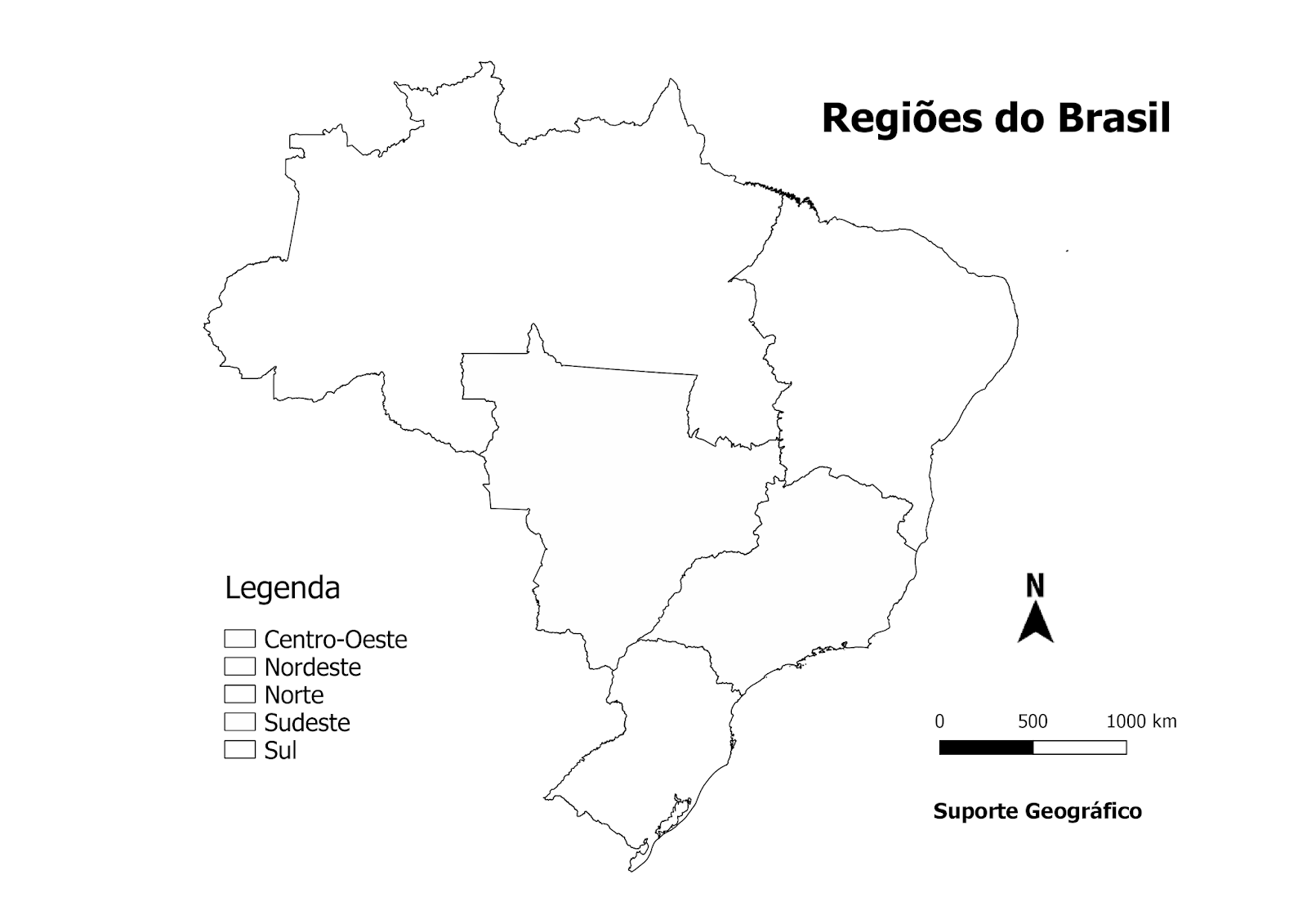 Regiões do Brasil Legenda N Centro-Oeste Nordeste Norte Sudeste 0 500 1000 km Sul Suporte Geográfico