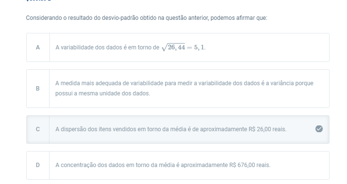 Considerando resultado do desvio-padrão obtido na questão anterior, podemos afirmar que: A A variabilidade dos dados é em torno de A medida mais adequada de variabilidade para medir a variabilidade dos dados é a variância porque B possui a mesma unidade dos C A dispersão dos itens vendidos em torno da média é de aproximadamente 26,00 reais. D A concentração dos dados em torno da média é aproximadamente R$ 676,00