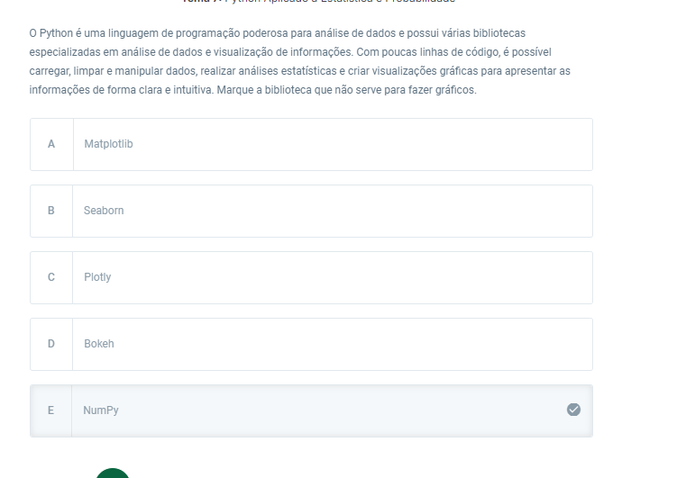 0 Python é uma linguagem de programação poderosa para análise de dados e possui bibliotecas especializadas em análise de dados e visualização de informações. Com poucas linhas de código, é possível carregar, limpar e manipular dados, realizar análises estatísticas e criar visualizações gráficas para apresentar as informações de forma clara e intuitiva. Marque a biblioteca que não serve para fazer gráficos. A Matplotlib B Seaborn C Plotly D Bokeh E NumPy
