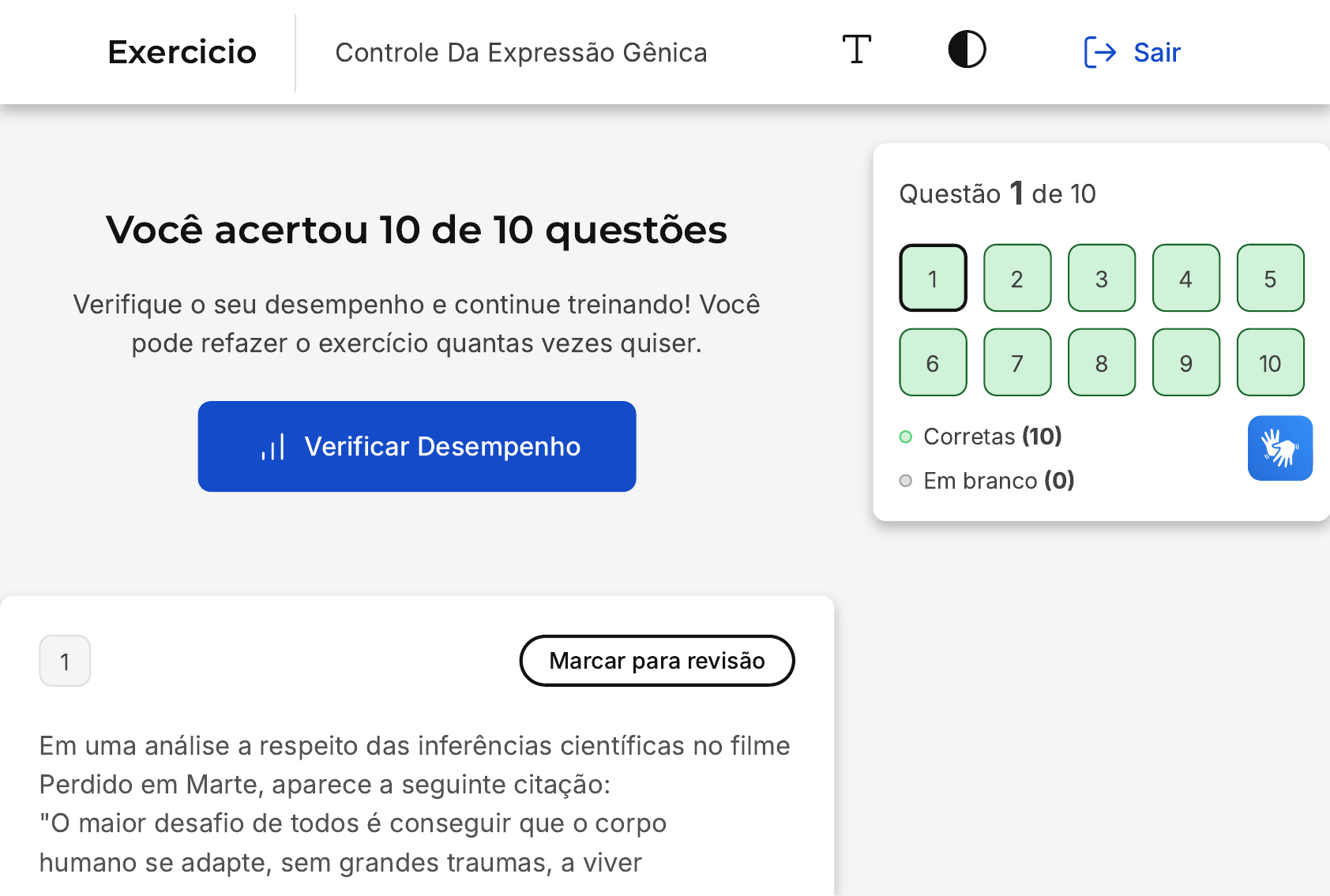 Você acertou 10 de 10 questões Verifique o seu desempenho e continue treinando! Você pode refazer o exercício quantas vezes quiser. Verificar Desempenho 1 Marcar para revisão Em uma análise a respeito das inferências científicas no filme Perdido em Marte, aparece a seguinte citação: "O maior desafio de todos é conseguir que o corpo humano se adapte, sem grandes traumas, a viver Questão 1 de 10 Corretas �10� Em branco �0� 1 2 3 4 5 6 7 8 9 10 Exercicio Controle Da Expressão Gênica Sair A B por longos períodos em condições completamente diferentes daquelas em que foi moldado". Ciência Hoje, nº 333. Com relação à ideia de que o corpo humano ... foi moldado, citada no texto, analise as afirmativas a seguir. I. As condições ambientais selecionaram, no indivíduo, os genes adequados e eliminaram os inadequados. II. As condições ambientais provocaram, no indivíduo, mutações adequadas ao ambiente em que ele se desenvolveu. III. As condições ambientais interferiram na regulação gênica no genoma do indivíduo, ligando e desligando genes, levando à sua formação (modelagem). Qual das alternativas abaixo está correta? apenas I apenas a II C D E apenas a III apenas II e III todas as afirmativas estão corretas. Resposta correta Parabéns, você selecionou a alternativa correta. Confira o gabarito comentado! Gabarito Comentado A afirmativa I está incorreta, pois as condições ambientais não têm a capacidade de eliminar os genes inadequados. O que ocorre é que o ambiente pode favorecer os indivíduos que possuem genes mais adaptáveis a determinadas condições. A afirmativa II também está incorreta, pois sugere que o ambiente seria capaz de gerar mutações adequadas para a sobrevivência do indivíduo, o que não é verdadeiro. O ambiente pode sim provocar mutações, como danos ao núcleo por radiação, por exemplo, mas essas mutações são aleatórias e nem sempre favoráveis. É a seleção natural que determina se um organismo irá ou não sobreviver e garantir a perpetuação de determinada marcação genética. Por fim, a afirmativa III está correta, pois o ambiente pode, de fato, afetar a regulação gênica de maneira reversível, ligando e desligando genes, contribuindo para a formação (modelagem) do indivíduo. 2 Marcar para revisão �Adaptada de FIOCRUZ�2010� Com relação à herança epigenética, ou seja, às informações passadas a nível epigenético, considere as afirmativas a seguir: I. É uma alteração herdável na função gênica relacionada a variações na sequência de bases do DNA. A B C D E II. É uma alteração herdável na função gênica que pode estar relacionada ao padrão de metilação do DNA. III. A inativação do cromossomo X em mamíferos é um exemplo de herança epigenética. IV. O imprinting genômico ou imprinting parental é um exemplo de herança epigenética. Somente as afirmativas I e III estão corretas. Somente as afirmativas II, III e IV estão corretas. Somente a afirmativa I está correta. Somente a afirmativa II está correta. Somente a afirmativa III está correta. Resposta correta Parabéns, você selecionou a alternativa correta. Confira o gabarito comentado! Gabarito Comentado A herança epigenética não está relacionada com variações na sequência das bases do DNA, como mencionado na afirmativa I, tornando-a incorreta. Por outro lado, a herança epigenética pode estar associada ao padrão de metilação do DNA, como afirmado na alternativa II. Além disso, a inativação do cromossomo X em mamíferos e o imprinting genômico ou parental, mencionados nas afirmativas III e IV, respectivamente, são exemplos clássicos de herança epigenética. 3 Marcar para revisão A B �PC�PF�2012� Uma nova proposta para estimativa de idade da vítima, que não está ainda em uso, é a avaliação de modificações epigenéticas. Todos os tecidos de um organismo são afetados pela idade, e esse processo aparentemente está associado a modificações epigenéticas. Trabalho recente com avaliação do perfil de metilação de DNA de determinados genes em diferentes tecidos mostrou que há o que está sendo chamado de "assinatura epigenética de idade". Com a continuação desses estudos, é provável que, no futuro, seja possível extrapolar a idade de uma vítima pela análise do perfil epigenético de tecidos específicos. O que acontece quando ocorre a metilação? Mutação no gene. Silenciamento do gene. C D E Produção constitutiva do gene. Aumento da taxa de reparo no gene. Aumento da taxa de transcrição do gene. Resposta correta Parabéns, você selecionou a alternativa correta. Confira o gabarito comentado! Gabarito Comentado O enunciado da questão se refere a um estudo recente que avalia o perfil de metilação de DNA de determinados genes em diferentes tecidos, o que está sendo chamado de "assinatura epigenética de idade". A metilação é uma A B C modificação epigenética que, quando ocorre em um gene, geralmente resulta no seu silenciamento. 4 Marcar para revisão O operon TRP é um exemplo clássico de regulação gênica em bactérias, que controla a síntese de enzimas envolvidas na biossíntese do aminoácido triptofano. O que é necessário para que o operon TRP seja expresso? Alta concentração de triptofano Baixa concentração de triptofano Presença de um ativador transcricional D E Ligação de um repressor ao promotor Ausência de um repressor alostérico Resposta correta Parabéns, você selecionou a alternativa correta. Confira o gabarito comentado! Gabarito Comentado O operon TRP é expresso quando a concentração de triptofano é baixa, pois nesse caso, o repressor alostérico não está ligado à região operadora, permitindo a transcrição. A B C 5 Marcar para revisão �Adaptado de UFF�BIOLOGIA�2018� O Nobel de Medicina ou Fisiologia de 2006 contemplou os cientistas Andrew Fire e Craig Mello pela descoberta da técnica de interferência 