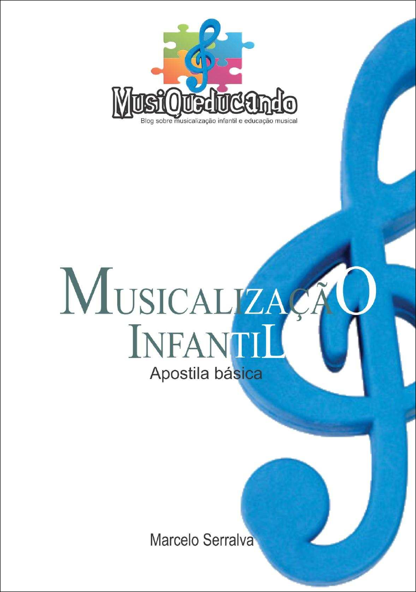www.musiqueducando.com.br Apostila de Musicalização Infantil _____________________________________________________ ________________________________ www.musiqueducando.com.br 2 Musicalização Infantil Apostila básica Esta apostila contém material básico para o desenvolvimento de uma aula de música na pré-escola. Contém cinco exemplos de atividades desenvolvidas pelo autor em sala de aula no ano de 2012, além de 25 cantigas de rodas cifradas. Este material foi desenvolvido como parte do site Musiqueducando, voltado para divulgação de material para educação musical nas escolas e musicalização infantil, e é gratuito. Apostila de Musicalização Infantil _____________________________________________________ ________________________________ www.musiqueducando.com.br 3 Planejamento inicial Um bom começo para uma boa aula de música é o planejamento prévio. Este planejamento pode solucionar e prever questões como utilização do espaço físico, material necessário, tempo utilizado para as atividades. Para isso, o educador deve utilizar uma ferramenta fundamental: o plano de aula. O plano de aula deve conter o tema, objetivos, tempo estimado para execução da atividade, resultados, etc. Um plano de aula pode ser dividido nos seguintes elementos: Número Elemento Descrição 1 TEMA O assunto. Conteúdo que será trabalhado. 2 JUSTIFICATIVA O motivo de se trabalhar determinado assunto. 3 OBJETIVOS GERAIS Os objetivos gerais a serem alcançados: o que os alunos irão conseguir atingir com esse trabalho. 4 OBJETIVOS ESPECÍFICOS Os objetivos elacionados a cada uma das etapas de desenvolvimento do trabalho. 5 ETAPAS As etapas previstas: uma previsão de tempo, onde o professor organiza tudo que for trabalhado em pequenas etapas. 6 METODOLOGIA A forma como irá trabalhar, os recursos didáticos que auxiliarão a promover o aprendizado e a circulação do conhecimento no plano da sala de aula. 7 AVALIAÇÃO A forma como o professor irá avaliar, se em prova escrita, participação do aluno, trabalhos, pesquisas, tarefas de casa, etc. 8 BIBLIOGRAFIA As referências bibliográficas de todo o material que o professor utilizou para fazer o seu planejamento. Apostila de Musicalização Infantil _____________________________________________________ ________________________________ www.musiqueducando.com.br 4 A aplicação da aula Munido do plano de aula, o educador agora deve executar a aula propriamente dita. Detalhes como a utilização ou não de um instrumento para acompanhamento, como um violão ou teclado, o espaço disponível para a aula – se há sala de música própria, ou o espaço é a sala de aula normal – serão diferentes em cada escola e para cada educador. A primeira coisa a ser feita é conhecer a realidade de sua própria escola e alunos. Esses detalhes influenciarão a abordagem, os temas a serem trabalhados, a linguagem a ser utilizada. Entretanto, algumas características serão as mesmas em todas as realidades encontradas. Vamos abordar então estas características em comum. Na pré-escola normalmente trabalha-se com crianças de 02 a 6 anos. Nesta idade as aulas devem ser curtas – em torno de 20 minutos, para que se possa manter o interesse e a atenção dos alunos. Dentro dos 20 minutos de aula, é interessante utilizar atividades curtas encadeadas umas às outras, para não entediar as crianças. Quando se fala em atividades, o que realmente funciona são brincadeiras, uma forma lúdica das crianças interagirem com a música. Pode-se utilizar instrumentos como chocalhos, pandeirinhos, instrumentos infantis de percussão para que as crianças possam trabalhar noções como ritmo, percepção, etc. É interessante possuir uma música de abertura e uma música de finalização, para delimitar o espaço de tempo da aula. Este recurso ajudará às crianças a desenvolverem a noção de tempo. Canto de Entrada: é o canto que acolhe e saúda as crianças. O canto de entrada avisa que a aula vai começar. Canto de despedida: tão importante quanto o canto de entrada, avisa que a aula acabou . Todos podem recolher suas coisas, seus instrumentos, ajudar a arrumar a sala, dar um beijo e se despedir. Apostila de Musicalização Infantil _____________________________________________________ ________________________________ www.musiqueducando.com.br 5 Tipos de atividades Vivências Sonoras: A aula de música para crianças envolvem atividades de apreciação musical, desenvolvendo a percepção e musicalidade. Estas atividades podem ser divididas em músicas,jogos e brincadeiras. De uma forma lúdica, a criança vivenciará o mundo musical e poderá aprender, através de brincadeiras,as propriedades do som como altura (grave e agudo), duração (curto e longo), intensidade (forte e fraco) e timbre (característica específica de cada som que faz com que ele não seja igual ao outro, ex.: violino e flauta têm sons diferentes). Também se inclui aqui o trabalho com andamento (rápido e devagar), células rítmicas, forma (partes da música) etc. Atividades de Registro: Interessante para o educador é implementar esta atividade que é usual na educação infantil. São as famosas "folhinhas" de atividade, com exercícios para pintar, circular, etc. As folhas de atividade devem trabalhar e reforçar o tema apresentado na aula., servindo até como uma forma de avaliação (não deve ser a principal). Atividade Livre: São dividas em Histórias, Cirandas, Brincadeiras ou Relaxamentos: Histórias: podem ser em livros ou em CD ou até contadas pelo professor. Não devem ser longas e o ideal é que o professor se utilize de recursos visuais (gravuras, fantoches etc) para prender a atenção das crianças. As histórias podem trabalhar elementos musicais, como por ex. Cachinhos Dourados, que trabalha a altura do som (papai urso=som grave, mamãe ursa=som médio e filhote urso=som agudo). Cirandas: As cantigas de roda de domínio público e musicais atuais, do repertório in
