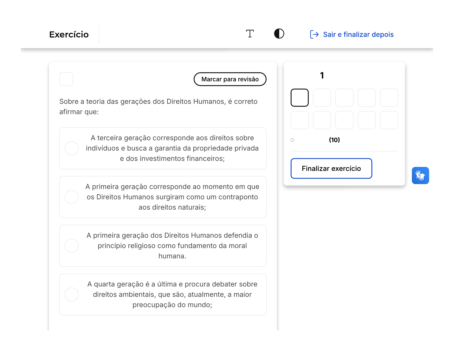A B C D 1 Sobre a teoria das gerações dos Direitos Humanos, é correto afirmar que: A terceira geração corresponde aos direitos sobre indivíduos e busca a garantia da propriedade privada e dos investimentos financeiros; A primeira geração corresponde ao momento em que os Direitos Humanos surgiram como um contraponto aos direitos naturais; A primeira geração dos Direitos Humanos defendia o princípio religioso como fundamento da moral humana. A quarta geração é a última e procura debater sobre direitos ambientais, que são, atualmente, a maior preocupação do mundo; Questão de 10 Em branco 1 2 3 4 5 6 7 8 9 10 Educação Para Os Direitos Humanos Firefox https://estacio.saladeavaliacoes.com.br/exercicio/66bdfb92ceae25261ca500fc/ 1 of 12 15/08/2024, 14:11 E A B C A segunda geração reafirmou as ideias da primeira geração e procurou construir a ideia de igualdade entre todos os seres humanos; 2 Sobre a Constituição vigente no Brasil e os Direitos Humanos, é correto afirmar que: A Constituição de 1889 cria no Brasil o princípio de uma República respeitadora dos Direitos Humanos, desde o início da República. Nossa Constituição é mais antiga do que a Declaração Universal dos Direitos Humanos e, por isso, não conseguimos garantir muitos direitos; A Constituição atual foi escrita durante a Guerra Fria e, por isso, houve uma grande preocupação em garantir direitos liberais, esquecendo-se de garantir os Direitos Humanos; Firefox https://estacio.saladeavaliacoes.com.br/exercicio/66bdfb92ceae25261ca500fc/ 2 of 12 15/08/2024, 14:11 D E Escrevemos a atual Constituição ao final do regime militar, e por garantir uma série de direitos inéditos ao povo, ela é conhecida como Constituição Cidadã; A atual Constituição foi escrita durante o regime militar e não fala sobre Direitos Humanos, esses foram garantidos somente em 1990 com emendas parlamentares. 3 No início, as declarações de direitos fundamentais concentravam-se principalmente na preservação da liberdade e da igualdade. Contudo, ao longo do século XX, emergiu outro princípio essencial: o respeito à dignidade humana. O artigo inaugural da Declaração Universal dos Direitos Humanos das Nações Unidas, adotada em 1948, proclama: "Todos os seres humanos nascem livres e iguais em dignidade e direitos". Sobre a ideia da dignidade da pessoa humana, podemos afirmar que Firefox https://estacio.saladeavaliacoes.com.br/exercicio/66bdfb92ceae25261ca500fc/ 3 of 12 15/08/2024, 14:11 A B C D E o conceito de dignidade da pessoa humana é uma série de necessidades debatidas e aprovadas por uma Corte internacional das Nações Unidas e que se valida ao ser aceito por mais de 150 países do mundo. não há um consenso sobre quais seriam as condições necessárias para se assegurar a dignidade da pessoa humana, cada sociedade possui suas necessidades que variam, inclusive, com o tempo. a dignidade da pessoa humana é um termo extremamente contestado por antropólogos que apontam que determinar condições de dignidade inferioriza populações que vivem abaixo da linha da pobreza. o termo dignidade da pessoa humana apareceu pela primeira vez na Declaração de Independência dos Estados Unidos que procurava justificar o desrespeito a essas condições como motivo do rompimento com a Inglaterra. a ideia de dignidade da pessoa humana é um conceito social aplicado juridicamente aos direitos fundamentais, sendo a base de todo recurso. Firefox https://estacio.saladeavaliacoes.com.br/exercicio/66bdfb92ceae25261ca500fc/ 4 of 12 15/08/2024, 14:11 A B C D 6 O século XX passou por duas guerras mundiais em um curto espaço de tempo que fizeram o mundo refletir sobre a necessidade de uma declaração de direitos que alcançasse todos os homens e mulheres sem distinção. Nesta declaração: Existem duras punições aos países que praticarem políticas discriminatórias que possam resultar em novos regimes totalitários; Há a assinatura apenas dos países europeus, pois foram eles que iniciaram os dois conflitos e que precisavam reestruturar suas legislações; Há a assinatura de todos os países do mundo, o que mostra um consenso sobre a ideia dos Direitos Humanos mesmo que nem sempre eles sejam respeitados; Foi criado o conceito de família humana, reforçando a igualdade entre todos e incentivando a empatia entre as pessoas; Firefox https://estacio.saladeavaliacoes.com.br/exercicio/66bdfb92ceae25261ca500fc/ 7 of 12 15/08/2024, 14:11 E A B C O direito à guerra é retirado, as fronteiras passam a ser cristalizadas pela soberania nacional. 7 Para garantir o sucesso da garantia dos Direitos Humanos a todos os integrantes da família humana, foi necessário: Intimar os países derrotados na Segunda Guerra Mundial para se comprometerem ao cumprimento da Carta; Criar um amplo sistema de fiscalização que esteja presente em todos os países do mundo, usando, inclusive, de espionagem, se preciso for; Intimar países com boas condições financeiras a contribuir com o desenvolvimento econômico de países abaixo da linha da pobreza; Firefox https://estacio.saladeavaliacoes.com.br/exercicio/66bdfb92ceae25261ca500fc/ 8 of 12 15/08/2024, 14:11 D E A B Criar sistemas de proteção regionais e realizar, constantemente, novas reuniões e tratados para que os direitos se mantenham atualizados. É impossível garantir a ação dos Direitos Humanos, afinal eles são um princípio filosófico. 8 Sobre a proteção dos Direitos Humanos universais no Brasil, é correto afirmar que: Demoramos muitos anos para fazer parte das Nações Unidas, porém, atualmente, temos um consistente sistema de proteção a todos os Direitos Humanos. Apesar das constantes violações de direitos que acontecem no Brasil, nós nos comprometemos com vários acordos e compomos o Sistema Interamericano de Direitos Humanos. Firefox https://estacio.saladeavaliacoes.com.br/exercicio/66bdfb92ceae25261ca500fc/ 9 of 12 15/08/2024, 14:11 C D E A Somos considerados ref