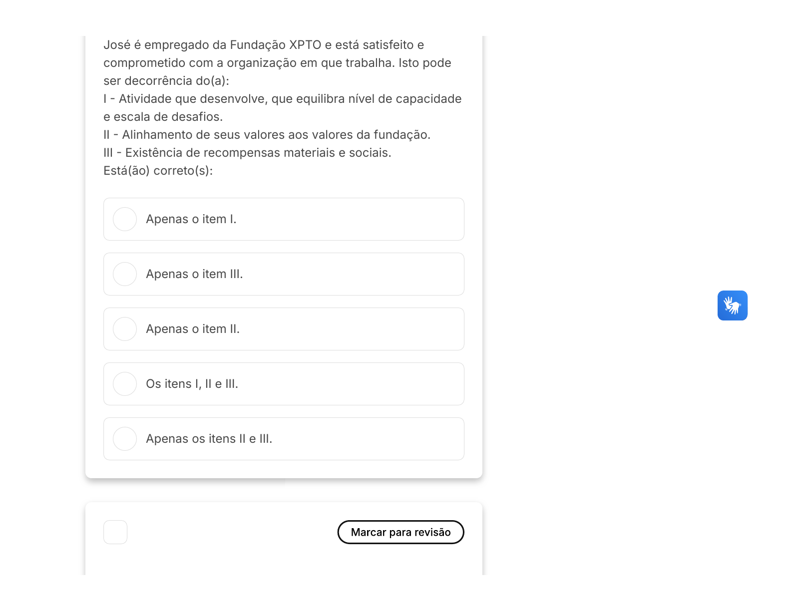 A B C D E José é empregado da Fundação XPTO e está satisfeito e comprometido com a organização em que trabalha. Isto pode ser decorrência do(a): I � Atividade que desenvolve, que equilibra nível de capacidade e escala de desafios. II � Alinhamento de seus valores aos valores da fundação. III � Existência de recompensas materiais e sociais. Está(ão) correto(s): Apenas o item I. Apenas o item III. Apenas o item II. Os itens I, II e III. Apenas os itens II e III. 5 Firefox https://estacio.saladeavaliacoes.com.br/exercicio/66be3933d4608bb3483042f0/ 5 of 12 15/08/2024, 14:21 Highlight