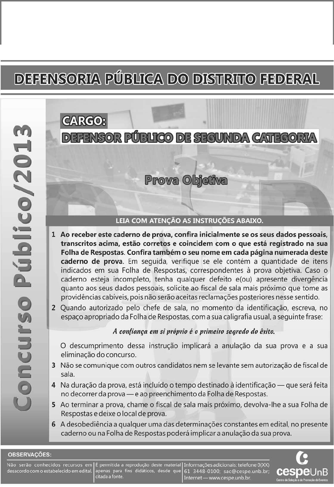 www.pciconcursos.com.br ||DPDF13_001_01N252891|| CESPE/UnB – DPDF/2013 • De acordo com o comando a que cada um dos itens a seguir se refira, marque, na folha de respostas, para cada item: o campo designado com o código C, caso julgue o item CERTO; ou o campo designado com o código E, caso julgue o item ERRADO. A ausência de marcação ou a marcação de ambos os campos não serão apenadas, ou seja, não receberão pontuação negativa. Para as devidas marcações, use a folha de respostas, único documento válido para a correção da sua prova objetiva. • Sempre que utilizadas, as siglas subsequentes devem ser interpretadas com a significação associada a cada uma delas, da seguinte forma: ACP = ação civil pública; ADI = ação direta de inconstitucionalidade; CDC = Código de Defesa do Consumidor; CF = Constituição Federal de 1988; CLDF = Câmara Legislativa do Distrito Federal; CP = Código Penal; CPC = Código de Processo Civil; CPI = comissão parlamentar de inquérito; CPP = Código de Processo Penal; CTN = Código Tributário Nacional; DF = Distrito Federal; DP = defensoria pública ou defensor público, conforme o contexto; DP/DF = Defensoria Pública do Distrito Federal; DPG = defensor público-geral; DPU = Defensoria Pública da União; ECA = Estatuto da Criança e do Adolescente; IPTU = imposto sobre a propriedade predial e territorial urbana; ISS = imposto sobre serviços; ITBI = imposto sobre a transmissão inter vivos, a qualquer título, por ato oneroso, de bens imóveis, por natureza ou acessão física; MP = Ministério Público; OEA = Organização dos Estados Americanos; RGPS = regime geral de previdência social; STF = Supremo Tribunal Federal; STJ = Superior Tribunal de Justiça; TCU = Tribunal de Contas da União. PROVA OBJETIVA Acerca dos elementos e normas constitucionais, julgue os itens seguintes. 1 As normas materialmente constitucionais referem-se ao conteúdo próprio da Constituição, devendo todas elas, obrigatoriamente, figurar no texto constitucional, a exemplo das normas relativas ao exercício e à distribuição do poder político e à garantia dos direitos fundamentais. 2 Consideram-se elementos limitativos da Constituição as normas constitucionais que compõem o catálogo dos direitos e garantias individuais. Em relação aos direitos e deveres individuais e coletivos, ao habeas data e aos princípios de interpretação das normas constitucionais, julgue os itens subsequentes. 3 Na hipótese de eventual conflito aparente de normas constitucionais decorrente da implantação de um empreendimento empresarial que possa vir a causar danos ao meio ambiente, aplica-se o princípio da unidade constitucional, pelo qual as normas que consagram princípios ― como o da livre inciativa, inserido no capítulo dos princípios gerais da ordem econômica ― devem prevalecer sobre as que disponham sobre interesses de ordem prática, como os relacionados à defesa da fauna e da flora. 4 Para o exercício do direito de reunião em locais públicos, faz-se necessário apenas que os interessados dirijam à autoridade competente pedido de autorização prévia, como forma de evitar que frustrem outra reunião anteriormente convocada para o mesmo local. 5 Qualquer pessoa é parte legítima para impetrar habeas data, em seu favor ou de outrem, visando conhecer ou retificar informações constantes de registros ou bancos de dados de entidades governamentais ou de caráter público. Considerando as disposições constitucionais acerca da administração pública e de seus servidores, julgue os itens a seguir. 6 Os mesmos direitos sociais assegurados na CF aos trabalhadores urbanos e rurais são garantidos aos servidores públicos civis, mas não aos militares. 7 Como regra, compete ao Congresso Nacional dispor sobre a criação, transformação ou extinção de cargos, empregos ou funções públicas, mesmo que a iniciativa para sua proposição seja do Poder Judiciário ou do chefe do Poder Executivo. 8 Servidor público da administração direta, autárquica ou fundacional eleito vereador poderá acumular o exercício de seu cargo público com o do mandato. Entretanto, sendo ele eleito para os demais cargos eletivos, deverá ficar afastado de seu cargo, emprego ou função pública. Com relação ao Poder Legislativo, julgue os itens subsequentes. 9 Uma CPI poderá ser instalada mediante requerimento de um terço dos membros da Câmara dos Deputados, não se exigindo que o requerimento seja submetido a deliberação plenária da Casa. 10 O projeto de lei aprovado nas comissões para as quais tenha sido enviado, na forma e prazo regimentalmente estabelecidos, deve, necessariamente, seguir para votação no plenário da respectiva Casa legislativa, pois o modelo constitucional brasileiro não admite a aprovação de leis por meio de órgãos fracionários da Câmara dos Deputados ou do Senado Federal. 11 Inserem-se nas competências do TCU a fiscalização das contas nacionais das empresas supranacionais de cujo capital a União participe, nos termos do tratado constitutivo, e a fiscalização de aplicação de quaisquer recursos repassados pela União a estado, ao DF ou a município. 12 Na CF, é expressamente estabelecido que cada legislatura tenha a duração de quatro anos. Julgue os itens a seguir, que versam sobre o Poder Judiciário, o MP e a DP, conforme o disposto na CF. 13 Segundo o STF, as DPs dos estados podem ter relação de vinculação, mas não de subordinação, a órgãos do Poder Executivo, desde que o vínculo seja estabelecido pela própria Constituição estadual e não afete sua autonomia funcional e administrativa. 14 A regra constitucional que proíbe o magistrado de exercer a advocacia no juízo ou no tribunal do qual se tenha afastado, antes de decorrido o período de três anos, contados do afastamento do cargo, aplica-se tanto ao Poder Judiciário estadual quanto ao federal de qualquer instância, incluindo-se o STF, o STJ e