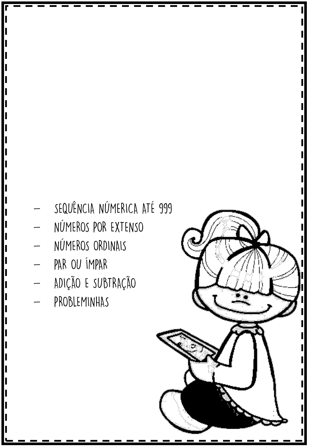 EXERCÍCIOS DE MATEMÁTICA Material produzido por www.profrafaelak.blogspot.com 123456789 NOME: DATA: / / NÚMEROS POR EXTENSO 10 12 13 14 15 16 17 18 19 D E Z Q W E D O Z E A S D F O N Z E D A E V T R E Z E T U I O N G G D V Q U A T O R Z E Q U I N Z E B J T S D Z X D E Z E S S E I S D E Z E N O V E Q W E C V B D E Z O I T O R V D E Z E S S E T E T www.profrafaelak.blogspot.com NOME: DATA: / / SEQUÊNCIA NUMÉRICA 0 1 2 9 10 14 17 22 23 40 49 56 64 72 77 80 91 98 100 www.profrafaelak.blogspot.com NOME: DATA: / / ANTECESSOR E SUCESSOR 35 47 20 61 84 12 59 98 73 11 w w w .profrafaelak.blogspot.com NOME: DATA: / / SEQUÊNCIA NUMÉRICA www.profrafaelak.blogspot.com NOME: DATA: / / SEQUÊNCIA NUMÉRICA 369 500 210 482 622 980 799 857 www.profrafaelak.blogspot.com NOME: DATA: / / NÚMEROS POR EXTENSO 54 1 Quinhentos e e um. 824 e vinte e quatro. 925 Novecentos e vinte e . 237 Duzentos e e sete. 753 cinquenta e três. 1 69 Cento e sessenta e . 672 Seiscentos e e dois. 485 e oitenta e cinco. 396 Trezentos e noventa e . w w w .profrafaelak.blogspot.com NOME: DATA: / / NÚMEROS ORDINAIS www.profrafaelak.blogspot.com NOME: DATA: / / PAR OU ÍMPAR 1 13 437 5 49 3 631 875 37 123 35 87 7 975 542 76 154 98 972 5 125 567 983 25 10 17 21 1 68 130 8 367 9 237 16 857 1 1 845 11 4 981 457 6 18 34 362 7 782 29 7 81 3 124 975 1 763 9 90 78 46 2 w w w .p ro fr af ae la k. bl og sp ot .c om NOME: DATA: / / ADIÇÃO w w w .p ro fr af ae la k. bl og sp ot .c om NOME: DATA: / / ADIÇÃO www.profrafaelak.blogspot.com NOME: DATA: / / SUBTRAÇÃO 4 9 25 - 3 4 15 35 6 8 52 - 1 6 72 32 9 7 56 - 6 5 98 32 5 6 5 - 5 1 107 55 4 5 78 - 3 3 12 15 6 4 11 - 5 2 106 12 7 3 94 - 2 1 64 52 8 2 32 - 5 2 134 30 9 1 61 - 3 0 60 45 www.profrafaelak.blogspot.com NOME: DATA: / / ADIÇÃO E SUBTRAÇÃO w w w .p ro fr af ae la k. bl og sp ot .c om NOME: DATA: / / SUBTRAÇÃO 2 6 5 _ 1 2 5 9 3 7 _ 5 3 4 8 7 9 _ 1 5 4 4 7 9 _ 3 2 5 8 6 1 _ 4 5 7 2 5 7 _ 2 1 9 8 7 0 _ 3 4 9 5 9 2 _ 2 3 8 5 1 7 _ 2 4 3 6 2 4 _ 5 8 4 3 5 9 _ 1 7 5 6 0 8 _ 1 9 5 www.profrafaelak.blogspot.com NOME: DATA: / / ADIÇÃO 2 6 5 + 1 2 5 9 3 7 + 3 4 8 0 4 + 1 5 9 4 1 9 + 3 2 5 3 6 1 + 4 5 3 2 1 7 + 2 9 0 8 3 0 + 3 8 9 5 9 2 + 2 3 4 5 1 7 + 2 4 3 6 2 4 + 5 8 4 3 5 3 + 1 8 5 4 9 8 + 1 0 5 www.profrafaelak.blogspot.com NOME: DATA: / / PROBLEMAS www.profrafaelak.blogspot.com NOME: DATA: / / PROBLEMINHAS www.profrafaelak.blogspot.com