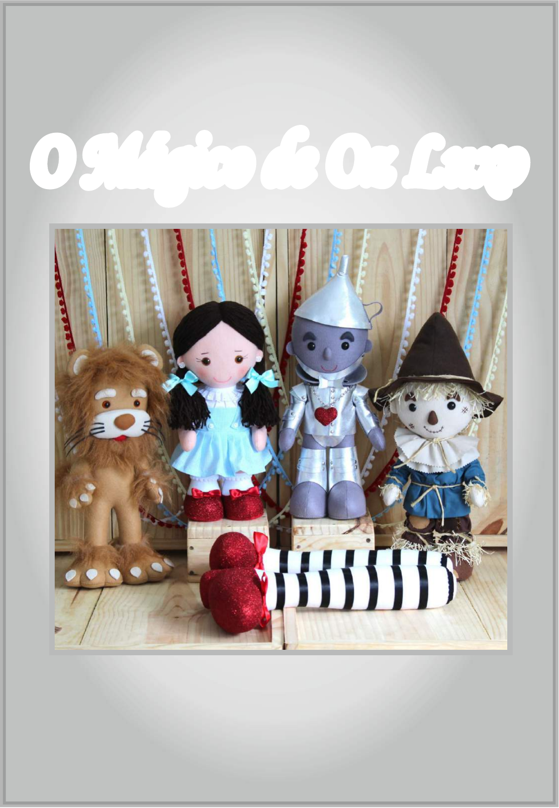 Dellour Art Ateliê Apostila Nº 24 Apostila digital com moldes prontos para impressão em folha A-4. Acompanhada de passo à passo com fotos da confecção dos 4 bonecos. Leão 42 cm, Doroty 40 cm, Homem de Lata 48 cm e Espantalho 48 cm. E ainda molde da perna. Maceió 2017 D ei lz a N ev es O Mágico de Oz Luxo O Mágico de Oz Luxo É expressamente proibida a reprodução total ou parcial desta, por qualquer meio ou processo. O repasse para terceiros sem a prévia autorização da autora é caracterizado crime. O usuário que adquirir esta apostila é livre para vender as peças que com suas próprias mãos confeccionar seguindo os moldes e instruções desta. Lei Nº 9610 de 12.02.98 - DOU 20.02.98 Informamos ainda, que o ateliê não é detentor dos direitos autorais sobre a criação/invenção dos personagens aqui presentes, e sim, detentor dos direitos autorais da criação/invenção dos moldes, dos riscos, dos desenhos destes personagens especificamente. Assim, como da didática presente em toda a apostila. Contamos com a colaboração e compreensão de todos! Aviso Importante!!! O Mágico de Oz Luxo Material Feltro cor pele Feltro vermelho (sapatos) Feltro marrom escuro (cabelo) Feltro branco (meias) Tecido branco (short, camisa e mangas) Tecido xadrez azul e branco (vestido) 6 botões brancos 9mm Olhos de pino e trava / meia pérola 15 mm 2 meias pérolas ou outra coisa para brincos +- 10 mm Bico de tecido (blusa, mangas e short) Lã marrom escuro (cabelo) Fita 20mm azul tifany (laço da trança) Fita vermelha 15mm e 8mm (laço sapato) 2 palitos de churrasco (corpo) Papelão (solado) Fita pom branca (meias) Fita branca (camisa e short) Cordão branco (short) Tinta de tecido com glitter vermelha (sapatos) Glitter fininho (sapato) opcional Fibra, cola quente e linhas nas cores necessárias para as costuras O Mágico de Oz Luxo Passo à Passo Dorothy O Mágico de Oz Luxo Montando o rosto Comece colando a franja. Faça o risco da boca e marcações dos olhos. Na parte de trás, já deve logo fazer a costura central para unir os dois lados. Vamos colar a parte de trás na nuca. Então, posicione a nuca na parte da frente do rosto. nuca Em seguida, posicione o cabelo. Como na foto 5, levante o cabelo e nele passe a cola quente; depois é só baixar e pressionar até secar. Faça a costura da boca, os dois pontos para os cílios. Se for usar olho com pino e trava, ponha agora. Faça um pequeno corte e passe o pino do olho, atrás ponha a trava e pressione. São três níveis de pressão. O terceiro é o que deixa o olho aprofundado. Eu prefiro parar no segundo. Depois faça a sobrancelha. No caso de usar meia pérola ou pérola, são fixadas depois da boneca cheia, então, já deixe as sobrancelhas feitas. O Mágico de Oz Luxo Todas as minhas bonecas e bonecos corto cabeça separada do corpo, depois é que faço essa costura ai da foto para unir corpo e cabeça. No enchimento vc vai perceber que isso dá uma grande diferença. Então, aqui, faça essa costura, lado da frente, lado de trás. Próximas costuras, laterais do corpo, deixando abertura para virar e encher na cabeça. Para esta boneca, que vai receber um cabelo de lã que cobrirá toda a cabeça, deixei uma abertura que pega toda a extensão da franja. A costura entre as pernas, faça primeiro e corte depois. Costurando o corpo O Mágico de Oz Luxo Montando os pés Comece colando o sapato n meia e também o solado de papelão no de feltro. OBS: Usei essas fotos pq acabei não tirando da Dorothy. Faça as costuras. Troque as linhas. Como na foto 4, faça a costura com ponto atrás. Faça pontos bem firmes, juntinhos, pois no enchimento os pés precisam ficar bem cheios. Costure o solado com caseado. Próxima etapa é costurar o short, para em seguida encher. O Mágico de Oz Luxo Costurando o short Primeira coisa a fazer, é costurar a bainha já com o bico. No espaço da costura você vai passar o cordão. Marque o meio, passe a agulha com o cordão de uma extremidade para o meio. Saia com a agulha no meio (furo com a agulha mesmo). Volte com a agulha pelo mesmo buraco até a outra extremidade. Faça um nó nas duas pontas. Costure o gancho. Depois entre as pernas. Faça a costura de cima deixando uma abertura no meio. Por ela passará uma fita. Quando vestir na boneca fará os laços na cintura e nas pernas. O Mágico de Oz Luxo Enchendo Vista o short. Não precisa amarra nada agora. Hora de encher. Para deixar a boneca ainda mais firme, use duas bolas de gude. Ponha um pouco de fibra na ponta do pé e coloque a bola de gude. Continue o enchimento de forma a envolver a bola de gude para que ela não fique a amostra. Siga com o enchimento até pouco antes do fundo. Para dar brilho ao sapato, usei essa tinta com glitter. Ainda não tinha usado. Mas é a mesma coisa daquela outra embalagem e da mesma marca... Para usar, ponha um pouco e vá espalhando com um palito, ou algo com superfície mais plana. Como queria com mais brilho, além dessa tinta usei glitter daquele bem fininho. Então, espalhava um pouco da tinta e despejava com muito cuidado o glitter com uma colher. Voltava a pôr a tinta e depois o glitter... até cobrir todo o sapato. Não precisa pôr no solado. O Mágico de Oz Luxo Enchendo Depois que a tinta secar, e por causa do glitter, coloquei um saco para não ficar espalhando glitter por todo lado. Se usar somente a tinta depois de seca não precisa usar os saquinhos. Ai já pode seguir com o enchimento até o pescoço, dar os laços das pernas. Pode dar o laço da cintura também. O Mágico de Oz Luxo Enchendo a cabeça Casei os dois lados da abertura para diminuí-la. E vamos encher, encher bastante para ficar uma cabeça bem redondinha. OBS: todo o procedimento de enchimento da cabeça você poderá acompanhar no pap do Espantalho. É exatamente do mesmo jeito. O Mágico de Oz Luxo Montando o cabelo Todo esse cabelo da parte da frente + 2 cm da parte de trás tem 60 cm. Então corte vários pedaços neste ta