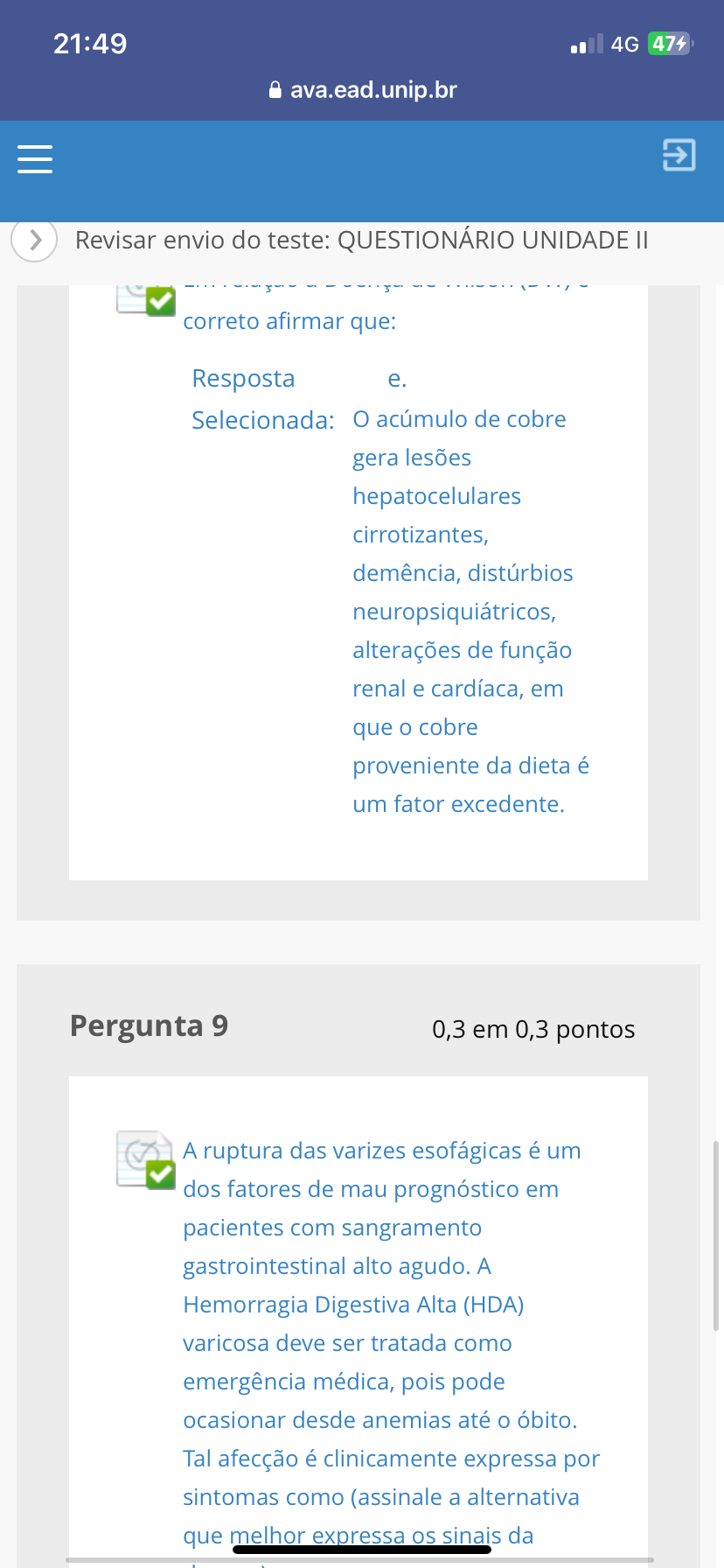21:49 4G 474 ava.ead.unip.br > Revisar envio do teste: QUESTIONÁRIO UNIDADE correto afirmar que: Resposta e. Selecionada: O acúmulo de cobre gera lesões hepatocelulares cirrotizantes, demência, distúrbios neuropsiquiátricos, alterações de função renal e cardíaca, em que cobre proveniente da dieta é um fator excedente. Pergunta 9 0,3 em 0,3 pontos A ruptura das varizes esofágicas é um dos fatores de mau prognóstico em pacientes com sangramento gastrointestinal alto agudo. A Hemorragia Digestiva Alta (HDA) varicosa deve ser tratada como emergência médica, pois pode ocasionar desde anemias até o óbito. Tal afecção é clinicamente expressa por sintomas como (assinale a alternativa que melhor expressa os sinais da