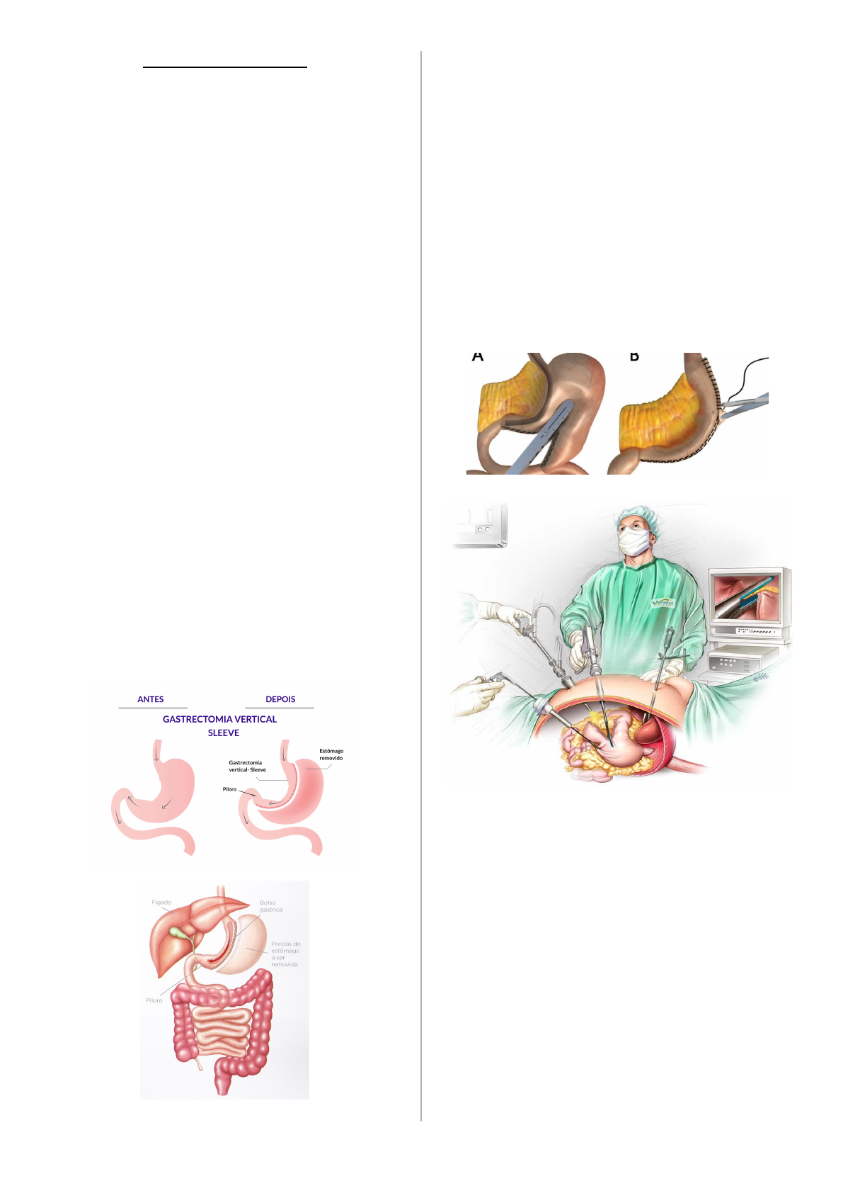 Gastrectomia Vertical: SLIDE 1: INFORMAÇÕES GERAIS ● A gastrectomia vertical, também conhecida como manga gástrica é um procedimento bariátrico que resulta na remoção da curvatura maior e do fundo do estômago, sendo preservados a curvatura menor, o antro e o piloro. Essa ressecção é orientada verticalmente, paralelamente à curvatura menor do estômago. ● Promove a perda de peso ao induzir a anorexia através da remoção da maioria das células produtoras de grelina (peptídeo estimulador do apetite), localizadas no fundo gástrico, além do aumento do GLP-1 (contribui para a perda de peso, melhorando o metabolismo da glicose, aumenta a lipólise, reduzindo a fome e aumentando a saciedade). Além disso, a diminuição do volume do estômago (cerca de 70 a 80%) contribui para uma sensação precoce de saciedade. ● No geral, resulta em excelente perda de peso e remissão da maioria das comorbidades relacionadas à obesidade. Além disso, é considerada menos eficaz , mas menos mórbida do que o bypass gástrico em Y-de-Roux, devido à sua simplicidade técnica e à sua alteração limitada da anatomia normal. SLIDE 2: REALIZAÇÃO DO PROCEDIMENTO ● Esse procedimento geralmente é realizado por vídeo laparoscopia, onde o cirurgião faz de 4 a 6 pequenas incisões no abdômen e através das incisões, insere trocartes (geralmente 5 a 6), que são tubos que permitem a introdução dos instrumentos cirúrgicos e da câmera laparoscópica. Cerca de 75 a 80% do estômago é removido utilizando um dispositivo de grampeamento cirúrgico. A incisão inicia-se a partir de 4 a 6 cm do piloro e segue em sentido vertical em direção ao fundo até atingir o ângulo esofagogástrico. ● A porção removida do estômago é retirada através de uma das incisões, as quais são fechadas com suturas ou grampos cirúrgicos. SLIDES 3: INDICAÇÃO E VANTAGENS DA GASTRECTOMIA VERTICAL ● As indicações para o procedimento são as mesmas às do Bypass gástrico em Y-de-Roux: - IMC > 40 com ou sem comorbidades associadas - IMC entre 35 e 40 com pelo menos uma comorbidade grave relacionada ao peso, incluindo diabetes, apneia obstrutiva do sono, hipertensão e doença arterial coronariana - IMC entre 30 e 35 quando os pacientes possuem diabetes do tipo 2 não controlada ou síndrome metabólica. Vantagens: ● A gastrectomia vertical apresenta um baixo perfil de complicações, mas a literatura indica alguns possíveis efeitos colaterais: ● náuseas pós-operatórias, sangramentos (descrito em até 15% dos casos), estenose (derivam de edema ou hematomas na linha de grampeamento) e vazamentos gástricos (devido à longa linha de grampeamento e alta pressão intraluminal) ● Também há relatos de refluxo gástrico grave e intratável como uma complicação tardia da gastrectomia vertical SLIDE 4: GASTRECTOMIA VERTICAL E BIODISPONIBILIDADE DO ESCITALOPRAM: ● Estudo de coorte prospectivo com 5 pacientes (1,6 e 12 meses após): o principal achado foi que a gastrectomia vertical não exerceu qualquer efeito substancial ou previsível nas concentrações de escitalopram a curto ou longo prazo, em nível de grupo ou individual. ● Apesar de pouco documentada, a diminuição da absorção pode ser devida à diminuição da superfície do estômago é significativamente reduzida, o que diminui a quantidade de ácido clorídrico secretado e aumenta o pH gástrico, levando a uma má dissolução e diminuindo a quantidade de medicamento disponível para absorção, uma vez que o excitalopram é lipossolúveis e depende da acidez estomacal para ser devidamente absorvidos. Referências: https://doi.org/10.1590/S0102-67202011000100011 PUBMED Effects of Sleeve Gastrectomy and Roux-en-Y Gastric Bypass on Escitalopram Pharmacokinetics: A Cohort Study Georgios Schoretsanitis, MD, PhD; Magnus Strømmen, RN, PhD; Hege-Merete Krasbeth, MD; Arne Helland, MD, PhD; Olav Spigset, MD, PhD Escitalopram metabolism primarily involves CYP2C19-mediated N-demethylation,22 whereas CYP3A4 and CYP2D6 seem to be involved to a lesser extent.23,24 Although CYP2C19, CYP2D6, and CYP3A4 contribute to hepatic metabolism, only CYP3A4/5 is highly expressed in the intestinal mucosa.25 https://doi.org/10.1590/S0102-67202011000100011