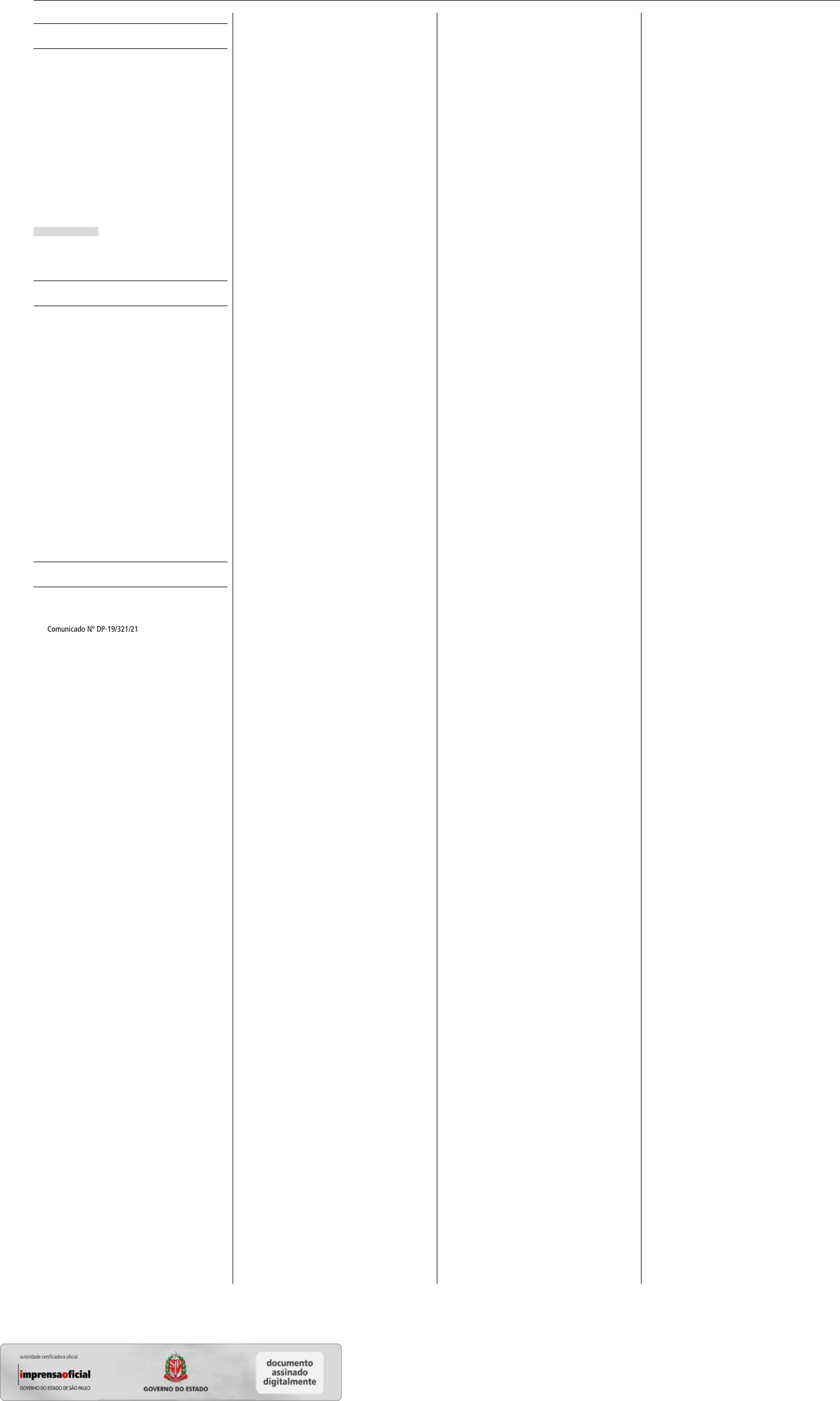 quarta-feira, 12 de maio de 2021 Diário Ofi cial Poder Executivo - Seção I São Paulo, 131 (89) – 161 processo nº 1026362-28.2021.8.26.0053, reinclui a candidata WIDISLAINE BARBOSA DA SILVA, RG 26.746.680-3, INSCRIÇÃO 68271123, no concurso público destinado ao cargo de Soldado PM 2ª Classe, regido pelo Edital nº DP-3/321/19, e a convoca à comparecer no Complexo Administrativo PM, sito na Av. Cruzeiro do Sul, nº 260, Bairro Canindé, São Paulo/SP, para a realização das etapas da AVALIAÇÃO DA CONDUTA SOCIAL, DA REPUTAÇÃO E DA IDONEIDADE e ANÁLISE DE DOCUMENTOS, em 20-7-21, às 08h00, com os formulários de ambas as etapas já preenchidos, com as respectivas cópias dos documentos solici- tados para cada etapa (Capítulo XII, Item 2, com seus subitens; e Capítulo XIII, itens 2 e 3; com seus subitens), destacando que são etapas distintas, bem como deverá atentar para o cumprimento das orientações contidas em cada um dos formulários, uma vez que a entrega incorreta e/ ou insuficiente poderá resultar em inaptidão nas etapas. Para obter os formulários, o candidato deverá acessar o endereço eletrônico https://www.concursos.policiamilitar.sp.gov. br, em seguida o menu “Concursos", no qual deve localizar o link de cada uma das Etapas e realizar download dos arquivos respectivos. Comunicado Nº DP–517/312/21 A Diretora de Pessoal torna público que o candidato FRAN- CO DE SOUZA, RG 44.442.551-2, INSCRIÇÃO 54419360, reinclu- ído no concurso público destinado ao cargo de Aluno-Oficial PM, regido pelo Edital nº DP-1/321/19, em cumprimento à decisão judicial proferida no processo nº 1066321-74.2019.8.26.0053, conforme publicação inserta no DOE n° 15, de 23-1-20, que foi considerado APTO na etapa subsequente e obteve classificação final equivalente à de número 173, devendo acompanhar as demais publicações no DOE. Comunicado Nº DP-128/323/21 A Diretora de Pessoal da Polícia Militar do Estado de São Paulo torna público o resultado dos candidatos das TURMAS 49 a 58 APROVADOS na etapa dos Exames de Saúde, realizada em 11-5-21, de acordo com o Edital nº DP-3/321/19, destinado ao cargo de Soldado de PM de 2ª Classe. TURMA 49 NOME R.G INSCRICAO JOSE DANIEL DA SILVA PEREIRA DO NASCIMENTO - 49278028-6 - 69652295 JOSE OTAVIO MONTEIRO - 48634010-7 - 71339531 JOSIANO VIEIRA GOMES - 54905007-3 - 68491948 JOSIELY THALYNE FONTAO ALVES - 64686156-6 - 68424493 JOYCE CHUNG SI BATISTA - 37441295-9 - 66448905 JOYCE SILVA QUEIROZ - 37891695-6 - 67048838 ================================== TOTAL DE CANDIDATOS APROVADOS.................. 6 TURMA 50 NOME R.G INSCRICAO JULIANA CAROLINA CRISTINA FERREIRA - 486608505-5 - 70402329 JULIANA CRISTINA DE SOUZA OLIVEIRA - 48542947-0 - 71577262 JULIANA MARIA RIBEIRO - 44278858-7 - 69034354 JULIANE GIL DE ALVARENGA - 48597200-1 - 69850976 JULIANNE PANHAN DA SILVA - 574413819-0 - 67899706 JULIANO MARINHO DOS SANTOS - 44890462-7 - 68161077 JULIO CESAR AVILA JUNIOR - 50411430-X - 70914982 JULIO CESAR GOMES DA ROSA - 36193228-5 - 71654836 JULIO CESAR PEREIRA DE OLIVEIRA - 48944794-6 - 68610343 KALINY RAMOS SILVA - 49352553-1 - 70153299 KARINA DE FREITAS PASQUINI - 44879486-0 - 71621490 ===================================== ===================== TOTAL DE CANDIDATOS APROVADOS.................. 11 TURMA 51 NOME R.G INSCRICAO KATTYA ROBERTA MATHIAS DA SILVA - 28234620-X - 67746209 KAYAN VILLON CLETO - 47527526-3 - 66727979 KAYQUE LEANDRO SILVA DOS ANJOS - 58037361-7 - 71374787 KELIANE AGOSTINHA DA SILVA LANA - 44868934-0 - 68373589 KELVYN VILLAR RODRIGUES - 460435504-0 - 70317780 KENNEDY ERIK ROSA - 52776921-6 - 67821030 KETLEY BASSI - 45970172-1 - 68067577 LAIS GARGANO RAMOS - 63498007-5 - 66431093 LAIS SANTOS DE OLIVEIRA - 6173307-0 - 66599270 ================================== TOTAL DE CANDIDATOS APROVADOS.................. 9 TURMA 52 NOME R.G INSCRICAO LARISSA LOUREIRO MARTINS - 45208406-4 - 68029640 LARISSA DE OLIVEIRA - 36418256-8 - 68241232 LARISSA RODRIGUES DE OLIVEIRA RORATO - 38698687-3 - 70923396 LAVINIA SANTIAGO BENEDETTI MORIMOTO - 54062199-7 - 70413193 LEANDRO ALVES DA CRUZ - 48249013-5 - 70872520 LEANDRO AUGUSTO LEITE - 47768517-1 - 70218862 LEANDRO LUIZ OSSUNA - 47097033-9 - 71672575 LEANDRO RODRIGUES DA SILVA - 49230294-7 - 66545463 LEANDRO VERISSIMO BARBOSA - 54618527-7 - 70935238 LEONARDO ANTONIO DA SILVA OLIVEIRA - 47559204-9 - 71017135 LEONARDO ATTUY - 53525512-3 - 68206143 LEONARDO AVEIRO PALMIERI - 37528948-3 - 67378900 LEONARDO DA SILVA GONCALVES DE PAULA - 47391683-6 - 68512368 LEONARDO DA SILVA RODRIGUES - 56530782-4 =================================== TOTAL DE CANDIDATOS APROVADOS.................. 14 TURMA 53 NOME R.G INSCRICAO LEONARDO DE JESUS SILVA ARAUJO - 55126337-4 - 66398150 LEONARDO DE LIMA ALVES - 42231881-4 - 66627478 LEONARDO EMANUEL MILANI MENDONCA - 476368522-0 - 70618100 LEONARDO FELIPINI MARONESI - 42009597-4 - 68899726 LEONARDO GAVA - 47967197-7 - 71105298 LEONARDO GODOY DE OLIVEIRA - 48953902-6 - 70455317 LEONARDO GOMES FERREIRA LOPES - 47074448-0 - 71337849 LEONARDO HENRIQUE NEVES - 54497001-9 - 71007075 LEONARDO HENRIQUE NEVES ALVES - 39253862-3 - 66580129 LEONARDO HENRIQUE VERGILIO FAITAO - 52564005-8 - 68295723 LEONARDO SOUSA DE MELLO - 37284426-1 - 67999026 LETICIA AMARAL - 39961829-6 - 67140890 LETICIA GABRIELA TURRINA DE MELO - 53087469-6 - 70846200 LETICIA PIO HORACIO - 50996581-7 - 68588038 =================================== TOTAL DE CANDIDATOS APROVADOS.................. 14 TURMA 54 NOME R.G INSCRICAO LETICIA SEIFERT - 52363283-6 - 66632790 LILIANE PEREIRA FRANCO - 43678386-1 - 71176667 LINCOLN PEREIRA VISGUEIRA - 386507594-0 - 67848192 LINIKER DA SILVA ARAUJO - 55349529-X - 69454558 LIVIA NISHIHARA SILVA - 359789171-1 - 66713498 LLUAARA DEODORA DE SOUZA COUTINHO - 66049403-6 - 69134693 LUAN DA MOTA OLIVEIRA - 49684069-1 - 70723591 LUAN MARCOS APARECIDO DA SILVA - 475092077-0 - 68411782 LUAN RIBEIRO BARBOSA - 50559206-X - 67512720 LUCAS ALVES NAZARIO LOPES - 48614419-7 - 70370265 L