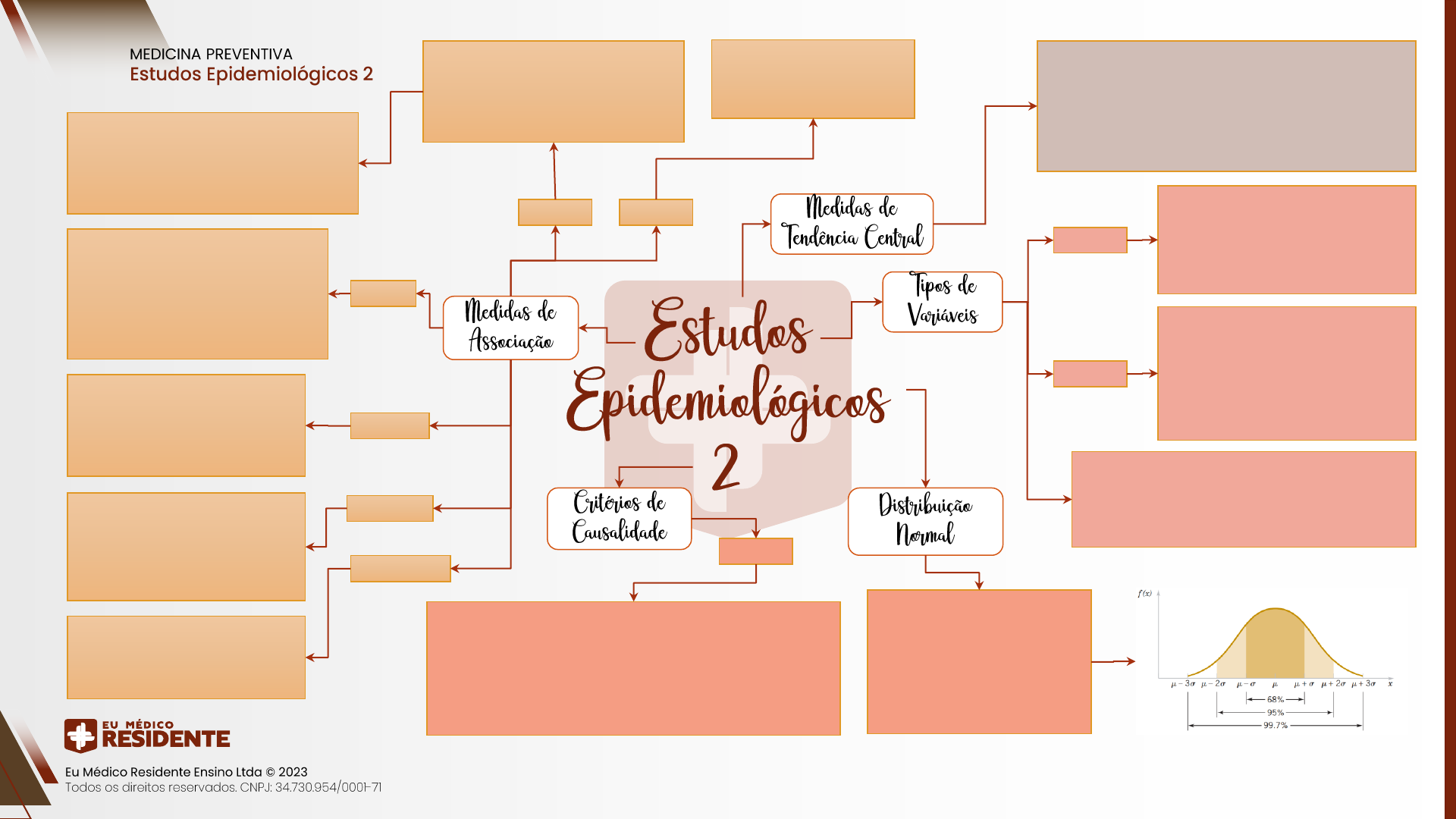 2023 Média: - Soma de todos os números dividido pelo número de informações do conjunto; - É a média aritmética; - Medida MAIS influenciada por fatores extremos; Mediana: - Número em posição central no conjunto; - Sempre que tiver um conjunto de números pares → soma os 2 números centrais e divide por 2; - Medida MENOS influenciada por fatores extremos. Moda: número que mais se repete de um conjunto. Expressam uma qualidade da variável; não possuem um número • Ordinais: quando há sequência, ordem ou hierarquia nos dados estudados. Ex.: escolaridade (1º, 2º, 3º graus), estadiamento de tumor (IA, IB, IIA e IIB); • Nominais: características que não possuem ordem ou sequência nas suas representações. Ex.: sexo, cor dos olhos, estado civil, tipo sanguíneo etc. Curva em formato de sino que mostra resultados aleatórios • Em uma distribuição normal - média, mediana e moda coincidem; • A maioria de uma população gira em torno da média enquanto algumas pessoas irão sofrer um desvio, seja para mais, seja para menos; • Desvios-padrão (DP): - 1DP = 68%; - 2DP = 95%; - 3DP = 99,7%. Qualitativas Quantitativas Representadas por meio de números resultantes de uma contagem ou mensuração. • Contínuas: quando os valores pertencem a um intervalo de mensuração que pode conter frações (“números quebrados”). Ex.: altura (1,66m); peso (57,3kg). • Discretas: valores representam um conjunto de números inteiros (não podem ser fracionados). Ex.: nº de filhos, nº de bactérias por amostra, frequência cardíaca etc. Dependente x Independente • Dependente: depende de algum fator para estar acontecendo, ou seja, depende que tenha uma exposição a algo. Ex.: doença (desfecho) - o câncer de pulmão é dependente do tabagismo. • Independente: não depende de algo (fator de exposição), pelo contrário, ele é a causa e pode mudar o fator dependente. Ex.: gênero. • Mais utilizado em estudo transversal; • Razão de prevalência = Prevalência do evento nos expostos dividido prevalência do evento nos não expostos; Razão de prevalência Risco relativo • Relação da incidência do desfecho entre expostos e não expostos a um fator de risco; • Pode acontecer em qualquer estudo de associação, sendo mais comum em coorte e ensaio clínico; • Cálculo: Incidência expostos / Incidência não expostos; - Incidência expostos = A/A + B; - Incidência não expostos = C/ C + D; Odds ratio • RR = 1 → o estudo não apresentou relação de associação entre fator e efeito; • RR > 1 → possibilidade de o fator ser de risco, já que a exposição aumenta o risco de surgimento do efeito → quem está mais exposto, irá ter mais desfecho do que quem não está exposto; • RR < 1 → possibilidade de o fator ser de proteção, já que a exposição ao mesmo diminui o risco de surgimento de efeito. • Quantas vezes mais chances os expostos têm (em relação aos não expostos) de desenvolver o desfecho; • Pode ser calculado para qualquer estudo, mas é mais comum no caso-controle; • Também é chamado de razão de chance; • Quanto mais rara for uma doença, mais o OR aproxima- se do RR; • O OR é uma estimativa do risco, mas não define o risco tão fortemente quanto o RR; • Cálculo: A x D / B x C (Fórmula do peixinho). Redução do risco relativo • Informa “o quanto o risco foi reduzido” com a nova droga; • Utilizada em casos clínicos; • Avalia “o quanto a nova droga foi capaz de reduzir a doença”; • O RRR avalia a eficácia e efetividade de uma droga; • Cálculo: RRR = 1-RR; Redução absoluta do risco • Significa a diferença entre as incidências da doença entre os que utilizaram a nova droga e os que não utilizaram; • Utilizada em casos clínicos; • Consiste na diferença absoluta entre a maior incidência e a menor; • RAR = Incidência maior – Incidência menor (RAR = Ie – Ine ou RAR = lne – Ie); Número necessário de tratamento • O resultado significa o número de pacientes que devemos tratar com a nova intervenção para que se possa prevenir 1 caso da doença; • Analisa a eficiência da intervenção testada; • Quanto maior o NNT, pior a intervenção; • Cálculo: NNT = 1/RAR. • Temporalidade: causa deve ser anterior a doença • Força de associação: é o único critério que pode ser medido; quanto mais forte uma associação, mais provável que seja causal; • Consistência: a relação deve ser condizente com os achados de outros estudos; • Plausibilidade biológica: a associação deve ter uma explicação plausível segundo história natural; • Gradiente biológico (efeito dose-resposta): efeito dose-resposta (deve ser em gradiente, proporcional). Incidência é maior quanto maior for a exposição; • Especificidade: exposição específica causa a doença; • Analogia: com outra doença ou com outra exposição; • Coerência: o que se busca provar não entra em conflito com o já conhecido; • Evidência de estudos experimentais: mudanças na exposição mudam o padrão da doença. Bradford Hill Slide 1