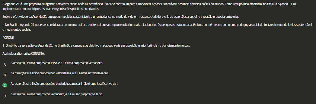 A Agenda é uma proposta de agenda ambiental criada após a Conferência Rio-92 e contribuiu para estabelecer ações sustentáveis nos mais diversos países do Como uma ambiental no Brasil, a Agenda 21 foi implementada em municípios, escolas e organizações públicas ou privadas Sobre a efetividade da Agenda 21 em propor medidas sustentáveis uma mudança no modo de vida em nossa sociedade. avalie as a seguir ea relação proposta entre elas: No Brasil, a Agenda 21 pode ser considerada como uma pedagogia social, de for talecimento de ideias movimentos PORQUE II. mérito da aplicação da Agenda 21 no Brasil não alcançou seu objetivo maior, que seria a proposição e interferência no planejamento no Assinale a alternativa CORRETA: A A asserção uma proposição ea é uma proposição verdadeira As asserções são proposições verdadeiras, e all é uma justificativa da C As asserções são proposições verdadeiras. mas a não uma justificativa da L D A asserção é uma proposição verdadeira. P al é uma proposição falsa