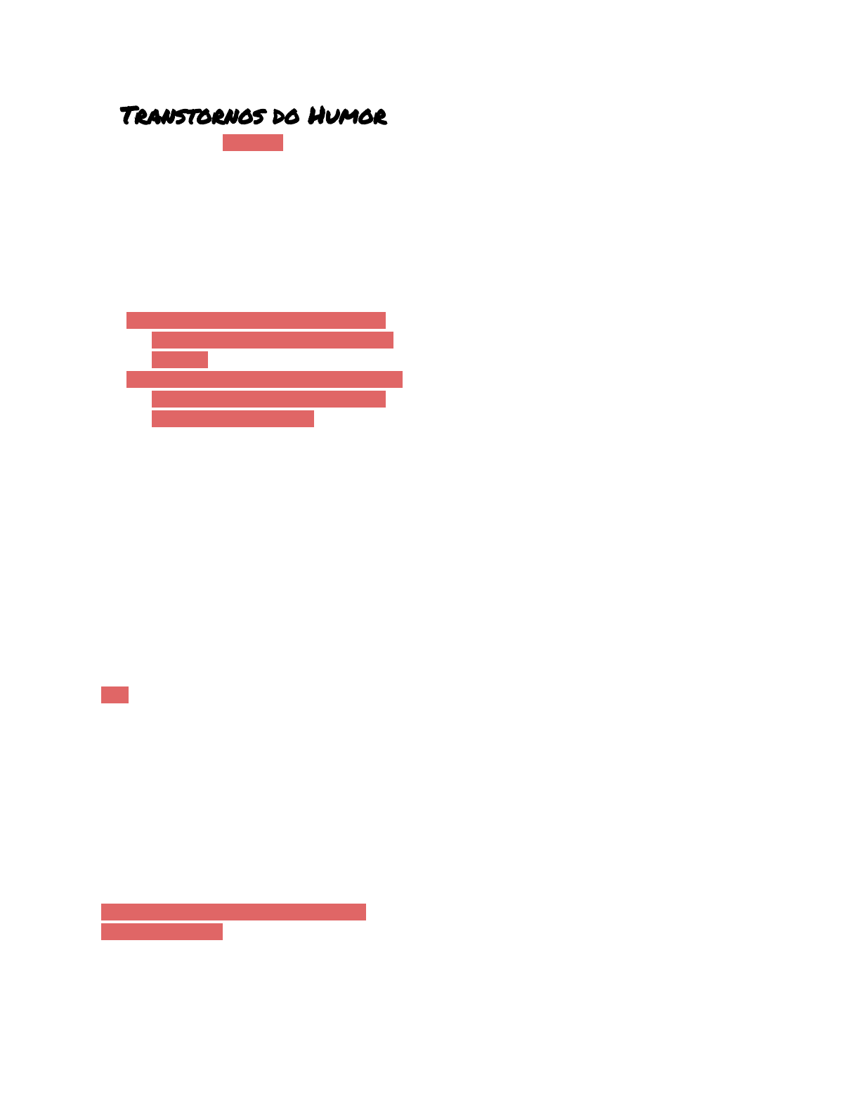 Maurício Szczypior - FPM IV Transtornos do Humor Depressão Epidemiologia → ao longo da vida: mais ou menos de 5 a 15% → predomínio em mulheres: 2:1 → idade de início: 30 anos Quadro clínico + diagnóstico (DSM-V) O paciente deve apresentar pelo menos 5 dos seguintes critérios: 1) humor deprimido: pessoa triste na maior parte do dia, quase todos os dias, deve ser constante 2) perda do interesse / prazer: pessoa não tem mais interesse em realizar atividades que costumava gostar de realizar 3) alteração do peso ou apetite: pode aumentar ou diminuir o apetite 4) insônia ou hipersônia 5) agitação ou retardo psicomotor 6) fadiga: sente que não tem energia, disposição, perda de prazer 7) sentimento de inutilidade ou culpa: “a culpa é minha” 8) redução da capacidade de pensar ou concentrar-se 9) pensamentos sobre morte recorrentes, plano ou tentativa de suicídio OBS: precisa ter pelo menos um dos dois primeiros aspectos clínicos → paciente deprimido é um pct sujeito a infecções ● menor funcionamento da suprarrenal por conta da diminuição do tônus do hipotálamo ● sujeitos a hipertensão → é uma doença de caráter sistêmico → capacidade diminuída de pensar não é sinônimo de demência → tempo de manifestação: precisa ser de pelo menos duas semanas Classificação 1) leve: não impede atividades diárias ● paciente consegue trabalhar e realizar suas atividades diárias ● tratamento: psicoterapia ou antidepressivo ● ver como o paciente responde 2) moderada: intermediária ● tratamento: psicoterapia e antidepressivo 3) grave: muito prejuízo funcional ● paciente só fica no quarto, não realiza suas atividades Antidepressivos Inibidores seletivos da recaptação de serotonina (ISRS) → é a classe de escolha → fluoxetina, citalopram, escitalopram, sertralina, paroxetina ● escitalopram é interessante para um paciente idoso ou para um paciente que usa várias outras medicações ● escitalopram pode aumentar o intervalo QT (tempo de despolarização e repolarização dos ventrículos) ● sertralina é interessante para um paciente cardiopata → bom poder antidepressivo e boa tolerabilidade → efeitos colaterais: é o efeito de início, precede o efeito terapêutico; náusea, queda de apetite e libido, anorgasmia (ausência de orgasmo) Antidepressivos tricíclicos → amitriptilina, nortriptilina, imipramina, clomipramina → essa classe é conhecida por ter bastantes efeitos colaterais; é considerada uma droga suja → efeitos colaterais: boca seca, constipação, hipotensão ortostática, distúrbios da condução cardíaca, ganho de peso, maior risco de virada maníaca ● efeitos anticolinérgicos ● não fazer de modo algum em pacientes com BAVT (bloqueio atrioventricular total)→ impulsos elétricos gerados no nó sinoatrial não conseguem passar para os ventrículos ● evitar em pacientes com risco de suicídio ● é difícil controlar uma intoxicação por tricíclico Maurício Szczypior - FPM IV ● diminui o limiar convulsivo ● arritmia cardíaca ● estados epilépticos OBS: há também os tetracíclicos (ex: maprotilina) Inibidores da recaptação de serotonina e noradrenalina (duais) → venlafaxina, duloxetina → aumentam a NA→ aumentam tônus vascular→ problema de controle pressórico → efeitos colaterais iguais ao dos ISRS, mas com o aumento da PA → a duloxetina é muito usada para neuropatia periférica, artrose, fibromialgia – dores neuropática Atípicos → bupropiona ● efeitos colaterais: redução do limiar convulsivo ● benefícios: baixo risco de disfunção sexual e tabagismo (interessante) → agomelatina: é um agonista da melatonina ● poucos efeitos colaterais ● boa para insônia →mirtazapina ● efeito colateral benéfico: aumenta o apetite ● sedação (dose baixa); se aumentar a dose diminui o efeito sedativo ● usar em paciente que está perdendo peso ● benefícios: não causa disfunção sexual Moduladores da serotonina → a serotonina tem diversos receptores. Esse fármaco vai estimular alguns e bloquear outros → trazodona ● efeitos colaterais: sedação, priapismo (ereção peniana prolongada sem excitação sexual) (não é tão prevalente na prática) ● pode ser utilizada em casos de insônia Inibidores da MAO → tranilcipromina → causam bastantes efeitos colaterais ● efeitos colaterais: aumento da PA, evitar consumo de tiramina (cerveja, leite, queijo, vinho), que é um aminoácido precursor de monoaminas cerebrais (ex: serotonina) (paciente pode desenvolver uma síndrome serotoninérgica) Mania Quadro clínico 1) logorreia: compulsão para falar, fala muito 2) fuga de ideias: há muitas ideias, o que pode gerar uma confusão na ordem das ideias e na expressão delas; não consegue terminar de expressar 3) hipersexualidade: risco de IST aumenta, pois tem muitos parceiros 4) gastos excessivos: paciente entende que não pode frequentar qualquer lugar, não pode comer qualquer coisa, usar qualquer roupa 5) impulsividade: é um paciente que não tem freio 6) delírio de grandeza: é congruente com a história dele; “eu sou a melhor pessoa do mundo” ● paciente arrogante → tempo de aparecimento: pelo menos uma semana ou internação OBS: não confundir com hipomania! ● hipomania é a mania na ausência de prejuízo social ● paciente não interna ● ausência de sintomas psicóticos → tratamento ● hipomania, mania leve ou moderada: antipsicótico ou lítio (estabilizador do humor) ● podem ser utilizados anticonvulsivantes (ex: lamotrigina, valproato, carbamazepina) ● mania grave: antipsicótico + lítio + benzodiazepínico Transtorno bipolar → não precisa ter depressão! → se o paciente tiver um episódio de mania, já pode ser chamado de bipolar (bipolar do tipo I) Maurício Szczypior - FPM IV → hipomania + depressão (bipolar do tipo II) → distimia: depressão leve e contínua por mais de dois anos → ciclotimia: instabil