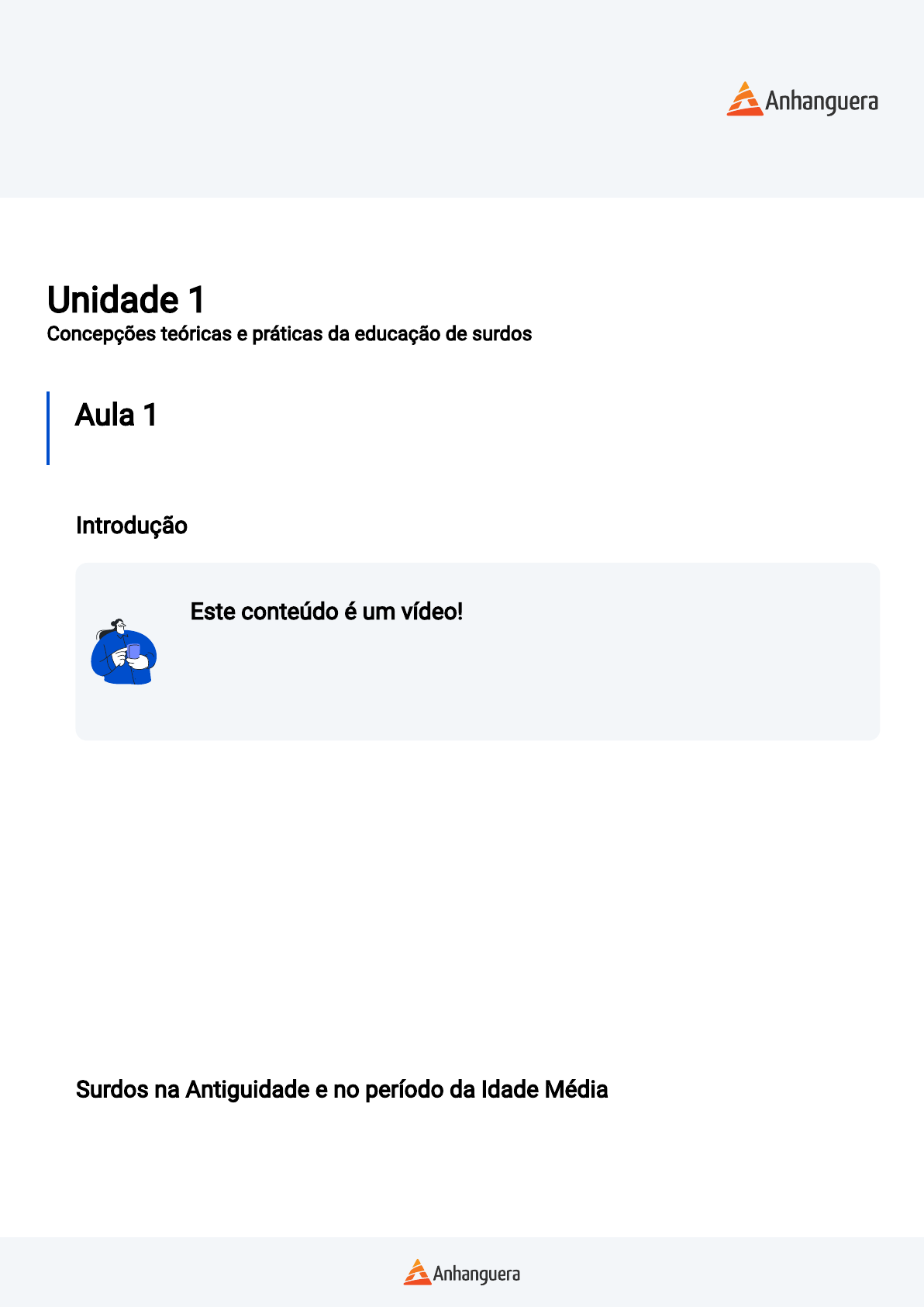 Disciplina LIBRAS - LÍNGUA BRASILEIRA DE SINAIS Unidade 1 Concepções teóricas e práticas da educação de surdos Aula 1 Trajetória histórica, historiogra�a e o embate em torno da comunicabilidade dos surdos Introdução Este conteúdo é um vídeo! Para assistir este conteúdo é necessário que você acesse o AVA pelo computador ou pelo aplicativo. Você pode baixar os vídeos direto no aplicativo para assistir mesmo sem conexão à internet. Olá, estudante! É essencial compreender como ocorreu e se consolidou o processo histórico dos surdos brasileiros e o reconhecimento linguístico desses indivíduos/sujeitos no embate da formação e da comunicabilidade. A preocupação está em identi�car a mentalidade cultural por meio da história e da historiogra�a como legitimidade e, sobretudo, sob o aspecto de uma nova perspectiva cultural-linguística que é a Língua Brasileira de Sinais – Libras. Queremos, deste modo, conceituar e interpretar o indivíduo/sujeito surdo no embate em torno de sua comunicabilidade e de sua realidade educativa, de acordo com cada época e período histórico e historiográ�co. Assim, obtemos consciência necessária para melhorar aplicar comportamentos e condutas nas relações humanas para com os surdos. Bons estudos! Surdos na Antiguidade e no período da Idade Média Disciplina LIBRAS - LÍNGUA BRASILEIRA DE SINAIS Vamos enfatizar o processo histórico dos surdos tanto na Antiguidade quanto na Idade Média de modo a trazermos informações que servirão como referência para a interpretação sobre como esses sujeitos eram conceituados pela sociedade de cada período abordado. Desta forma, compreenderemos como, por meio das mentalidades culturais, religiosas e �losó�cas, se processavam as concepções de surdos diante da conjuntura social em que estavam inseridos. Na Grécia Clássica, a educação se dividia em modelos opostos: aquela exercida no seio da família, na qual ocorre a primeira infância, perpassando pela educação heroica destinada aos adolescentes aristocráticos, do exercício da força, da astúcia e da inteligência. A educação comunitária era o lugar de representação das contradições que fustigavam costumes e ridicularizavam comportamentos por meio dos corpos, chegando ao ideal de formação humana: a Paideia. Vamos perceber que, embora houvesse discussões quanto à formação dos surdos no que diz respeito ao processo de comunicabilidade, esses indivíduos eram vistos como sem valor cultural e linguístico. Já no período da Idade Média, a forte presença da Igreja Católica enquanto instituição constituída vai empreender substancial in�uência e interferir, de forma contundente, na sociedade medieval, como um todo. De certa forma, isso repercute diretamente na formação dos surdos. Levando-se em conta, em perspectiva, a mentalidade medieval, vamos perceber como ela também foi in�uenciada pelo segmento religioso do catolicismo, pelas concepções escolásticas e, mais adiante, pelas artes com a criação de escolas e disseminação do pensamento cristão e �losó�co das concepções aristotélicas, do conhecimento e da harmonia estabelecida entre fé e razão, resgatados por Santo Agostino e Tomás de Aquino. Ao consideramos isso, vamos entender ser indiscutível o fato de que os surdos foram sujeitados a todo tipo de julgamento. Diante do exposto, perceberemos que esse resultado também é veri�cado pela exposição de motivos que nortearam a literatura sobre a qual a demanda social a educação estava direcionada Disciplina LIBRAS - LÍNGUA BRASILEIRA DE SINAIS e a qual público objetivava atender. Nesse sentido, podemos a�rmar que os surdos foram alienados do processo educativo, seja pela negligência ostensiva com que eram tratados, seja pela alienação cultural à qual eram submetidos. Portanto, vistos como uma nódoa social, sua desumanidade relacional, pela ausência de uma moradia ordenada, tanto em sua vida interior quanto ao seu lugar no universo real, não parecia sensibilizar a honra e a plenipotência estrutural à qual estavam submetidos. É como se os surdos tivessem perdido “a bênção completa”, uma vez que, segundo mentalidade de época, poderiam ser portadores de forças malé�cas que indicavam algum poder de oposição à vida terrena que lhe nega locomoção e afetação, enquanto criatura divergente da forma social pré-estabelecida, seja na forma de se mover seja na forma de funcionar. Isso traçou um limite claramente visível em seu processo educacional com re�exos negativos que se arrastaram por séculos. Esses eventos contribuem para entendermos como se desenrolou em convergência e divergência todo o processo educacional/educativo dos surdos até chegar aos dias atuais. Surdos no contexto moderno e contemporâneo Buscamos apresentar, aqui, de modo interpretativo, os contextos moderno e contemporâneo como marcos na trajetória educacional dos surdos diante dos ajustes advindos da civilização Disciplina LIBRAS - LÍNGUA BRASILEIRA DE SINAIS renascentista, que alteraram o comportamento social e cultural com re�exos signi�cativos nos séculos seguintes. A a�rmação de novas exigências geradas com o período moderno não expandiu apenas a própria humanidade do homem, mas o fez adquirir consciência de poder ser o agente transformador de sua própria história. Diante dos novos aspectos multiformes (social, cultural, político, econômico) se evidencia a diferença com o passado e faz brotar uma nova concepção de virtude, uma nova formatação de valores entre as quais está a problemática educativa para dar forma e concretude ao novo ideal de homem. Nesse sentido, nenhuma virtualidade humana pode permanecer na sombra. Desta forma, a multiplicação das relações e conquistas humanas e as novas exigências didáticas, em circulação, torna possível descoberta da infância e faz surgir um novo educador. Assim, o domínio racional do Est