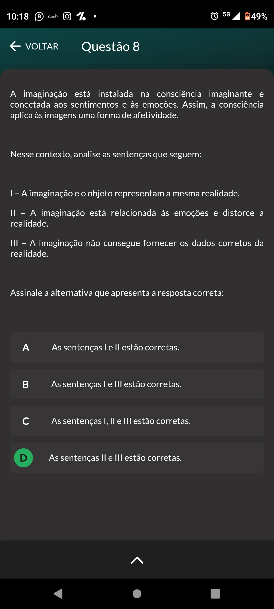 10:18 B 'I. 5G 49% VOLTAR Questão 8 A imaginação está instalada na consciência imaginante e conectada aos sentimentos e às emoções. Assim, a consciência aplica às imagens uma forma de afetividade. Nesse contexto, analise as sentenças que seguem: I - A imaginação e objeto representam a mesma realidade. II - A imaginação está relacionada às emoções e distorce a realidade. III - - A imaginação não consegue fornecer os dados corretos da realidade. Assinale a alternativa que apresenta a resposta correta: A As sentenças I e II estão corretas. As sentenças I e III estão corretas. C As sentenças I, II e III estão corretas. D As sentenças II e III estão corretas.