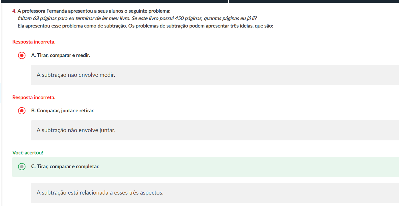 4. A professora Fernanda apresentou a seus alunos seguinte problema: faltam 63 páginas para eu terminar de ler meu livro. Se este livro possui 450 páginas, quantas páginas eu já li? Ela apresentou esse problema como de subtração. Os problemas de subtração podem apresentar três ideias, que são: Resposta incorreta. A. Tirar, comparar e medir. A subtração não envolve medir. Resposta incorreta. B. Comparar, juntar e retirar. A subtração não envolve juntar. Você acertou! C. Tirar, comparar e completar. A subtração está relacionada a esses três aspectos.