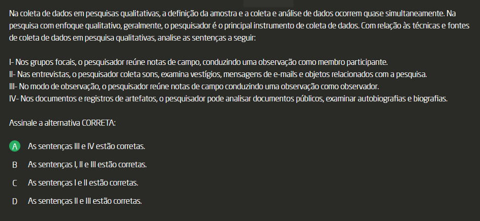Na coleta de dados em pesquisas qualitativas, a definição da amostra e a coleta e análise de dados ocorrem quase simultaneamente. Na pesquisa com enfoque qualitativo, geralmente, pesquisador é principal instrumento de coleta de dados. Com relação às técnicas e fontes de coleta de dados em pesquisa qualitativas, analise as sentenças a seguir: Nos grupos focais, pesquisador reúne notas de campo, conduzindo uma observação como membro participante. II- Nas entrevistas, pesquisador coleta sons, examina mensagens de e-mails e objetos relacionados com a pesquisa. III- No modo de observação, pesquisador reúne notas de campo conduzindo uma observação como observador. IV- Nos documentos e registros de artefatos, pesquisador pode analisar documentos públicos, examinar autobiografias e biografias. Assinale a alternativa CORRETA: A As sentenças III e IV estão corretas. B As sentenças I, II e III estão corretas. C As sentenças I e II estão corretas. D As sentenças II e III estão corretas.