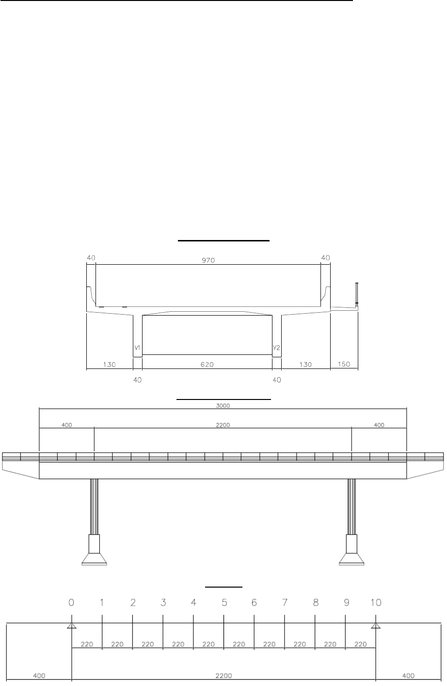 EXERCÍCIO – CONCEITOS GERAIS; TREM-TIPO; LINHA INFLUÊNCIA. Data entrega: 1ª VA 1. Descreva os elementos constituintes das pontes. 2. As pontes podem ser classificadas quanto ao sistema estrutural de sua superestrutura. Escolha um destes sistemas e fale o que você sabe sobre ele. 3. Aponte as vantagens e desvantagens dos processos construtivos de pontes e viadutos. 4. Como é definida a carga móvel utilizada nos dimensionamentos de pontes e viadutos? 5. Qual é a função dos coeficientes de ponderação das cargas móveis? Quantos e quais são eles? 6. Defina, no seu entendimento, o que é trem-tipo. 7. Porque devemos determinar o trem-tipo para as longarinas de uma ponte ou viaduto? 8. Calcule o trem-tipo para a viga V2 da ponte abaixo. Considere a estrutura de concreto armado, a pista de rolamento com três faixas de tráfego e a ponte classe TB-45. Seção transversal Seção longitudinal Seções 9. Qual é a função da linha de influência no dimensionamento da longarina de uma ponte ou viaduto? 10. Como é feito o cálculo do esforço solicitante em uma longarina, devido ao carregamento móvel da ponte? 11. Para a longarina V2 da ponte da questão 08, calcule o valor do esforço cortante e do momento fletor no balanço e nas seções de 0 a 5, localizadas no vão da viga.