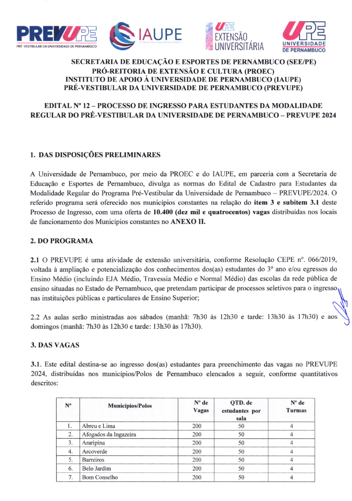 Modalidade Regular do Programa Pré-Vestibular da Universidade de Pemambuco - PREVUPE/2024. O