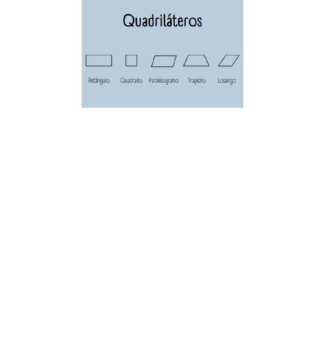 ESCOLA MUNICIPAL ALFREDO AMORIM DISCIPLINA: MATEMATICA PROF(a) .............................................. 6 ANO DATA : 25 – 05 – 2024. ALUNO(A)....................................................................... APOSTILA HABILIDADES: D04 - Identificar quadriláteros observando as posições relativas entre s eus lados (paralelos, concorrentes, perpendiculares) Exemplos de quadriláteros. Quadriláteros são polígonos com quatro lados, como o quadrado, o retângulo, o paralelogramo, o losango e o trapézio. Todo quadrilátero apresenta também quatro vértices e quatro ângulos internos. Resumo sobre quadriláteros • Um polígono com quatro lados é chamado de quadrilátero. • O quadrado, retângulo, paralelogramo, trapézio e losango são exemplos de quadriláteros. • Os quadriláteros apresentam quatro lados, quatro vértices e quatro ângulos internos. • Os tipos de quadriláteros são determinados pelo número de lados paralelos. Elementos dos quadriláteros Os elementos dos quadriláteros são os elementos dos polígonos. Os principais são os lados, vértices e ângulos internos. • Lados são os segmentos de reta que contornam o polígono. • Vértices são os pontos de encontro entre os lados, ou seja, as extremidades do polígono. • Ângulos internos são as aberturas (internas) entre dois lados adjacentes. Cada quadrilátero é formado por quatro vértices, quatro lados e quatro ângulos internos. Vejamos um exemplo. No quadrilátero ABCD, temos: • os vértices A, B, C e D; • os lados AB, BC, CD e DA; • e os ângulos internos A , B , C e D . Classificação dos quadriláteros A classificação dos quadriláteros decorre da quantidade de lados paralelos: • Um quadrilátero com um par de lados paralelos é chamado de trapézio. • Um quadrilátero com dois pares de lados paralelos é chamado de paralelogramo. O losango, o retângulo e o quadrado são casos particulares de paralelogramos. Observação: Os quadriláteros que não possuem lados paralelos não recebem classificação. Quadrilátero convexo x quadrilátero côncavo Os conceitos de quadrilátero convexo e côncavo (não convexo) seguem os conceitos de polígono convexo e côncavo. Considere dois pontos internos a um quadrilátero. Se o segmento formado por esses dois pontos também é interno ao quadrilátero, então o quadrilátero é convexo. Mas se o segmento formado por esses dois pontos não é interno ao quadrilátero, então o quadrilátero é côncavo. No exemplo abaixo, o quadrilátero ABCD (à esquerda) é convexo. Note que X e Y são pontos que pertencem ao quadrilátero e o segmento XY está contido no quadrilátero. Quadrilátero ABCD convexo e quadrilátero MNOP côncavo. Já o quadrilátero MNOP (à direita) é côncavo. Observe que R e S são pontos que pertencem ao quadrilátero, mas o segmento RS não está contido no quadrilátero, pois há pontos do segmento RS que não estão no interior do quadrilátero. 1. Observe as imagens abaixo e responda. Os quadriláteros da imagem são todos a) paralelogramos. b) quadrados. c) retângulos. d) trapézios. 2. Observe o quadrilátero abaixo. Se os ângulos internos  = 105º, B = 96º e C = 35º, então, a medida do ângulo externo X vale a) 124º. b) 84º c) 66º. d) 56º. 3. Um tapete que tem a forma de um retângulo com 6 metros de comprimento por 4 metros de largura será contornado com uma espécie de bico africano. Quantos metros de bico serão necessários para contornar todo o tapete? a) 10m. b) 16m. c) 20m. d) 24 m. 4. Sobre quadriláteros analise as afirmativas a seguir: I – São figuras que possuem quatro lados todos iguais. II – A soma de seus ângulos internos é igual a 360 graus. III – Todo quadrilátero possui duas diagonais. Está correto o que se afirma em: a) I e II apenas. b) II apenas. c) II e III apenas. d) I, II e III. 5. Observe a figura: Quantas diagonais possui essa figura? a) Duas. b) Três. c) Quatro. d) Cinco. 6. Após estudar sobre os quadriláteros, Arthur observou a Bandeira do Brasil e identificou todos os quadriláteros presentes nela. ATIVIDADES As figuras observadas por Arthur foram: a) Círculo e retângulo. b) Losango e quadrado. c) Losango e retângulo. d) Retângulo e paralelepípedo. 7. Observe o quadrilátero abaixo. A medida do ângulo α é a) 58º. b) 72º. c) 80º. d) 88º. 8. O quadrilátero a seguir é um trapézio isósceles. Nele, os valores de x e y são, respectivamente: a) 30º e 45º. b) 40º e 45º. c) 45º e 40º. d) 30º e 90º. 9. Na aula de Matemática, ao explanar sobre quadriláteros e suas propriedades, a professora pediu que seus alunos determinassem os valores dos ângulos x e y representados na figura. Sabendo que a equipe de Lucas acertou o desafio, qual foi a resposta dada por essa equipe? a) x = 63º e y = 117º. b) x = 70º e y = 110º. c) x = 83º e y = 97º. d) x = 97º e y = 83º. 10. Em um paralelogramo, os ângulos internos opostos são congruentes. Aplicando essa propriedade, pode-se afirmar que a medida do menor ângulo do paralelogramo da figura vale a) 35º. b) 65º. c) 80º. d) 100º. 11. Na aula de artes do 4º ano, Pedro fez um desenho utilizando alguns polígonos que ele aprendeu na aula de matemática, como mostra a figura abaixo: Qual polígono Pedro utilizou para representar o sol em seu desenho? a) Quadrado. b) Pentágono. c) Retângulo. d) Hexágono. 12. Os quadriláteros são polígonos que possuem 4 lados, 4 vértices e 4 ângulos. Das figuras abaixo, qual podemos identificar como um quadrilátero? a) Figura I. b) Figura II. c) Figura III. d) Figura IV. 13. Denominamos polígono como uma superfície plana concentrada por uma linha poligonal fechada e reta. De acordo com essa definição, quantas das figuras abaixo são consideradas como um polígono? a) Cinco figuras. b) Quatro figuras. c) Duas figuras. d) Uma figuras. 14. Observe a placa de trânsito abaixo: Essa placa lembra um polígono de quantos vértices? a) 4 vértices. b) 5 v