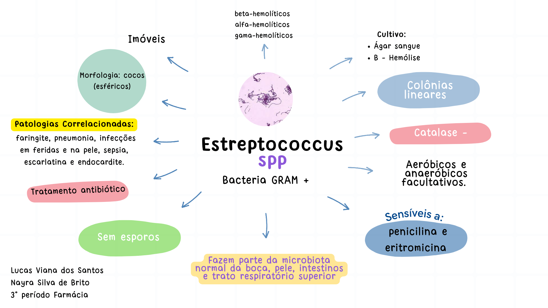 beta-hemolíticos alfa-hemolíticos Imóveis gama-hemolíticos Cultivo: Ágar sangue B - - Hemólise Morfologia: cocos (esféricos) Colônias lineares Patologias Correlacionadas: Catalase - faringite, pneumonia, infecções em feridas e na pele, sepsia, Estreptococcus e endocardite. Aeróbicos e anaeróbicos Bacteria GRAM + facultativos. Tratamento antibiótico Sensíveis a: Sem esporos penicilina e eritromicina Fazem parte da microbiota Lucas Viana dos Santos normal da boca, pele, intestinos e trato superior Nayra Silva de Brito 3° período