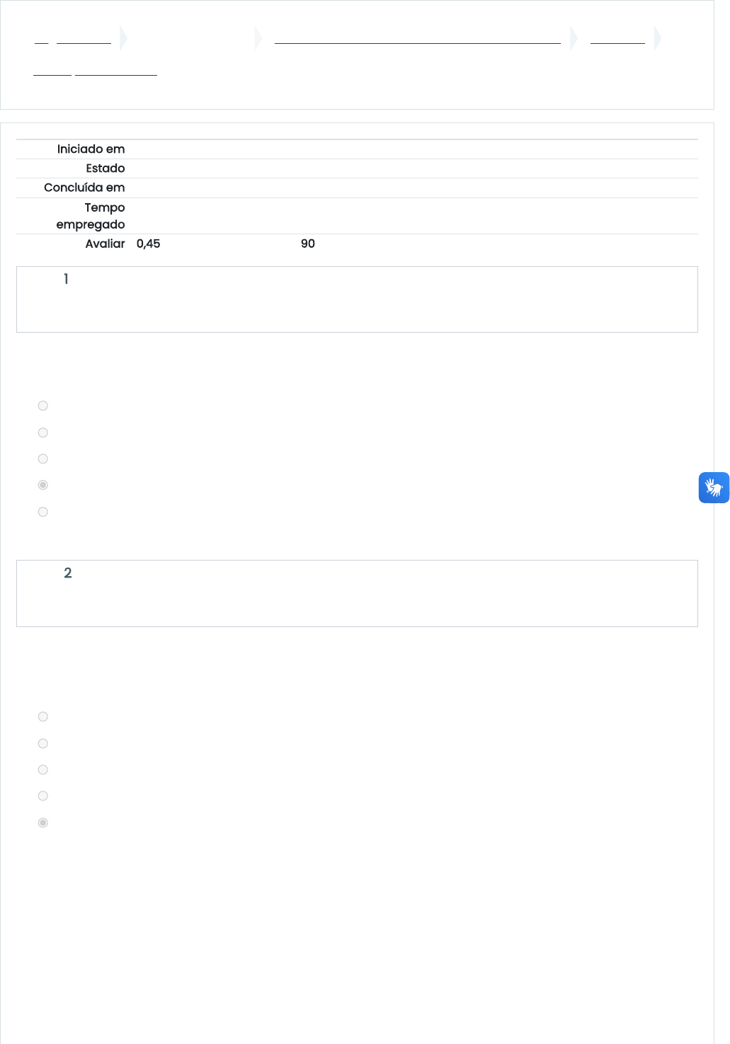 Página inicial Minhas disciplinas 2024/3 - PATOLOGIA VETERINÁRIA GERAL E ESPECIAL UNIDADE I Avaliação - Unidade I Iniciado em sábado, 20 jul 2024, 12:18 Estado Finalizada Concluída em sábado, 20 jul 2024, 12:48 Tempo empregado 30 minutos 22 segundos Avaliar 0,45 de um máximo de 0,50(90%) Questão 1 Completo Atingiu 0,05 de 0,05 Questão 2 Completo Atingiu 0,00 de 0,05 Qual dos seguintes termos é utilizado para descrever um aumento no número de células de um tecido? a. Isquemia b. Necrose c. Hipertrofia d. Hiperplasia e. Apoptose Qual é o termo utilizado para descrever o processo de distinguir entre duas ou mais doenças ou condições semelhantes com base em seus sintomas, características clínicas e exames complementares? a. Diagnóstico etiológico b. Diagnóstico laboratorial c. Diagnóstico diferencial d. Diagnóstico presuntivo e. Diagnóstico clínico 20/07/2024, 12:49 Avaliação - Unidade I: Revisão da tentativa https://ambienteonline.uninga.br/mod/quiz/review.php?attempt=3017629&cmid=800409 1/5 https://ambienteonline.uninga.br/ https://ambienteonline.uninga.br/course/view.php?id=27705 https://ambienteonline.uninga.br/course/view.php?id=27705§ion=5 https://ambienteonline.uninga.br/mod/quiz/view.php?id=800409 Questão 3 Completo Atingiu 0,05 de 0,05 Questão 4 Completo Atingiu 0,05 de 0,05 Questão 5 Completo Atingiu 0,05 de 0,05 Qual é o termo utilizado para descrever o acúmulo de bilirrubina nos tecidos? a. Melanose b. Amiloide c. Porfiria d. Hemossiderose e. Icterícia A deposição anormal de ferro nas células é chamada de: a. Lipofuscina b. Amiloide c. Bilirrubina d. Hemossiderose e. Melanina O termo utilizado para descrever a morte de células de forma não programada é: a. Atrofia b. Isquemia c. Hiperplasia d. Apoptose e. Necrose 20/07/2024, 12:49 Avaliação - Unidade I: Revisão da tentativa https://ambienteonline.uninga.br/mod/quiz/review.php?attempt=3017629&cmid=800409 2/5 Questão 6 Completo Atingiu 0,05 de 0,05 Questão 7 Completo Atingiu 0,05 de 0,05 Questão 8 Completo Atingiu 0,05 de 0,05 Qual é o termo utilizado para descrever a redução no tamanho de um órgão ou tecido devido à perda de células? a. Esteatose b. Necrose c. Atrofia d. Hipoplasia e. Hiperplasia A deposição de proteínas insolúveis e não funcionais nos tecidos é chamada de: a. Amiloide b. Esteatose c. Hemossiderose d. Calcificação e. Lipofuscina Qual é o termo utilizado para descrever a redução ou interrupção do suprimento sanguíneo em um tecido ou órgão? a. Injúria b. Necrose c. Apoptose d. Isquemia e. Anóxia 20/07/2024, 12:49 Avaliação - Unidade I: Revisão da tentativa https://ambienteonline.uninga.br/mod/quiz/review.php?attempt=3017629&cmid=800409 3/5 Questão 9 Completo Atingiu 0,05 de 0,05 Qual é o termo utilizado para descrever a alteração reversível de um tipo de célula em outro tipo de célula em resposta a um estímulo ou lesão crônica? a. Metaplasia 20/07/2024, 12:49 Avaliação - Unidade I: Revisão da tentativa https://ambienteonline.uninga.br/mod/quiz/review.php?attempt=3017629&cmid=800409 4/5 Questão 10 Completo Atingiu 0,05 de 0,05 b. Necrose c. Isquemia d. Hiperplasia e. Atrofia Sobre classificações de lesões, assinale a alternativa correta. a. Lesões podem ser somente focais ou multifocais. b. Lesões podem se apresentar com diversas colorações, como verde, acinzentado, ou vermelho, mas nunca marrom. c. Uma lesão pode ser multifocal e difusa no mesmo tecido e ao mesmo tempo. d. Lesões sempre são macias, pois não é fisicamente possível uma lesão ser firme. e. Lesões podem ser focais, multifocais ou difusas. Atividade anterior ◄ Slides Videoaula 3 Seguir para... Próxima atividade Videoaula 1 ► Manter contato UNINGÁ https://www.uninga.br Mobile : 0800 800 5009 Baixar o aplicativo móvel. 20/07/2024, 12:49 Avaliação - Unidade I: Revisão da tentativa https://ambienteonline.uninga.br/mod/quiz/review.php?attempt=3017629&cmid=800409 5/5 https://ambienteonline.uninga.br/mod/resource/view.php?id=800408&forceview=1 https://ambienteonline.uninga.br/mod/page/view.php?id=800410&forceview=1 https://www.uninga.br/ tel:Mobile : 0800 800 5009 https://www.facebook.com/uninga.edu.br/ https://www.youtube.com/channel/UCFfrZpSpL4DflIFl78P2TSQ https://www.instagram.com/uningaoficial/?hl=pt https://api.whatsapp.com/send?phone=44%2099710-2250 https://download.moodle.org/mobile?version=2020061502.11&lang=pt_br&iosappid=633359593&androidappid=com.moodle.moodlemobile