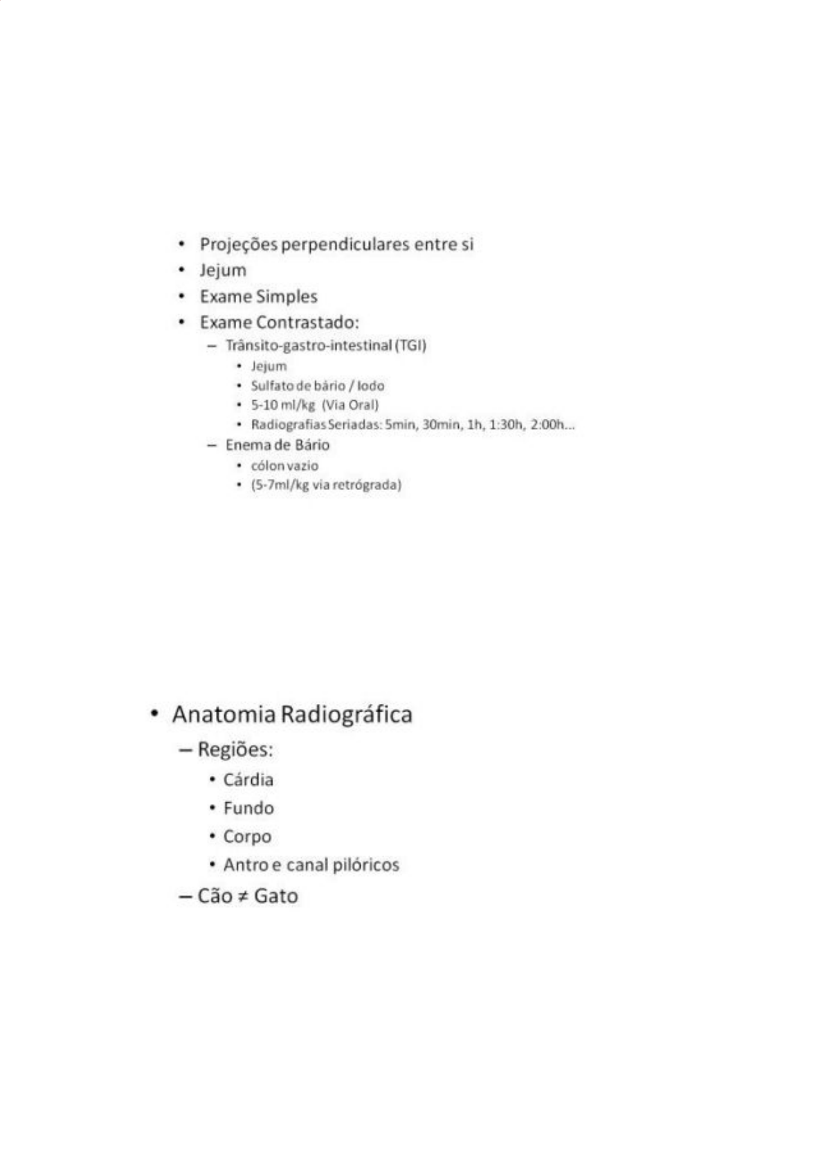 Estômago e alças intestinais - DIGESTÓRIO 2 ● Nome dado ao exame contrastado do estômago e do intestino é transitogastrointestinal com bário ● Avaliação apenas do estômago-gastrografia ESTÔMAGO Compressão abdominal (mais usado para exame urinário): podem ser usados cabos de borracha transparentes próprios para isso ou pas de madeira,trazendo um raio x pouco atenuado, mas é possível ver o contorno (usado quando se quer separar as alças que contenham conteúdo pastoso ou gasoso, graças a mobilidade das alças) em que o animal não esta em jejum. Existe uma pequena diferença de posicionamento na cavidade abdominal entre o cão e o gato, enquanto o estômago (“antopilori”) do cão fica bem do lado direito enquanto que no gato ele encontra-se mais centralizado. Lembrar que o estômago tem uma região fundica, cranial e a esquerda, o corpo e o antro pilórico e o esfíncter pilórico, passando a se chamar duodeno. CORPO ESTRANHO Corpos estranhos segue a sequência do esôfago que podem ser radiopatos ou radiotransparentes, em que os radiopacos serão mais facilmente identificáveis na radiografia simples. Os corpos estranhos no estômago, por ser um órgão um pouco grande, podendo ter um corpo estranho dentro dele, porém não necessariamente obstruindo-o. E causará obstrução, quando pela contração ele tentar progredir e não conseguir passar e ficar entalado. Caso seja uma obstrução parcial, passara, contudo com dificuldade. Quando feito a radiografia, espera-se encontrar a identificação do corpo estranho caso ele seja identificável e uma dilatação do estômago em graus variados conforme o grau de obstrução, caso haja obstrução. Ex: um pedaço de plástico no estômago (corpo estranho), ele não está obstruindo nem contraindo a parede do estômago. Porém por vezes posso ter corpos estranhos de tamanhos maiores ou uma superfície mais rugosa ou espiculada que podem estar não obstruindo mas irritando a mucosa do estômago ( às vezes o animal tem sintomatologia, como vômito, porém não aparece radiograficamente).Ou seja uma radiografia normal, ainda assim pode ter de um corpo estranho!!! Posso fazer o contraste para a identificação do corpo estranho, ocorrendo falha de preenchimento e se tiver obstrução o contraste vai está retido no estômago e não vai progredir rapidamente para o duodeno. Observar que essa falha de preenchimento é uma falha de tudo que está no estômago, não simplesmente do corpo estranho, o contraste identifica tudo (ex: se tiver ração vai ficar cheio das bolinhas da ração). Ou seja a falha de preenchimento é de qualquer estrutura que tenha tamanho e preencha um volume e que não dissolva para o contraste se dissolver. TORÇÃO O estômago encontra-se torcido, na grande maioria das vezes quando ocorre ele torce 180°. Então o antro político que está embaixo vai ser encontrado na porção superior e o fundo que era para estar em cima vai estar embaixo. Como ele é uma víscera longa e com a parede elástica, ele quando está com alimento acaba se distendendo muito (ex: aquelas bexigas que o povo faz desenho de cachorro, flor etc), é possível ver a dobra que a bexiga fez que é de radiopacidade água (que é dobra de parede), chamada de linha de compartimentalização gástrica, dividindo o estômago em dois compartimentos. Importantes aspectos de manifestações clinicas de torção: se o diagnostico for feito rapidamente, a chance de sobrevida é grande. Abdome distendido: difícil perceber, apesar de no exame aparecer um som “timpânico” em todos os lugares distendido que se encontra. Radiograficamente vai ser uma distensão anormal do estomago com preenchimento predominantemente gasoso. Distenção simples: uma única cavidade preenchida de gás Torção: existe a compartimentalização e distenção ainda maior ALÇAS INTESTINAIS Observar se estão distribuídas de forma homogênea na cavidade abdominal, principalmente na região mais ventral, observar o diâmetro da alça comparando com a vértebra e a costela (formas de comparação). Olhar a radiopacidade do conteúdo e o aspecto. Em animais jovens e raquíticos é mais difícil observar as alças, pois os mesmos não possuem gordura no mesentério com a parede. No transitogastrointestinal vai ser observado a coluna de contraste, se existe alguma falha de preenchimento (pouco usado, mais usado ultrassom). Dentro da avaliação do intestino, a radiografia tem uma grande importância no diagnostico de obstruções. Quando existe uma obstrução do tipo torção com muito gás, ele impende a passagem do som, o que impende um bom resultado da ultrassom (por isso que na torção gástrica, caso exista duvida não se deve encaminhar o animal para uma ultrassom). OBSTRUÇÃO INTESTINAL ● Corpo estranho (tricobezoato); ● Intussuscepção-quando um segmento de alça adentra para outro segmento e obstrui a passagem; ● Hérnia- por si so não obstrui, mas se passar muito segmento pode causar uma obstrução interna; ● Tumores: que cresçam que podem obstruir parcial ou total; ● Massa na parede das alças; ● Alteração na válvula íleo-colica Obstrução não tão grave como a torção. Se houver obstrução é necessário retirar a massa e fazer exame histológico, caso não esteja não é necesssario. É sematológico. Na duvida depende da pessoa que esta atendendo e da técnica, como a ultrassom, traz a resposta à causa. O raio x da a resposta, porem não a causa. Ps: intestino grossso tem maior distenção -Intestino grosso: lumem maior em comparação com o delgado; *radiopacidade depende do conteúdo Aspectos radiográficos: ENTERITE INTESTINO GROSSO Alterações: