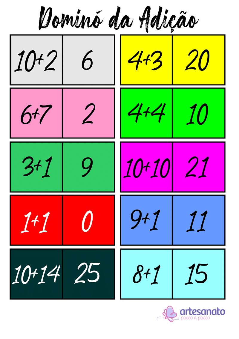 Domino da Adição 10+2 6 4+3 20 6+7 2 4+4 10 3+1 9 10+10 21 1+1 9+1 11 10+14 25 8+1 15 passo a passo