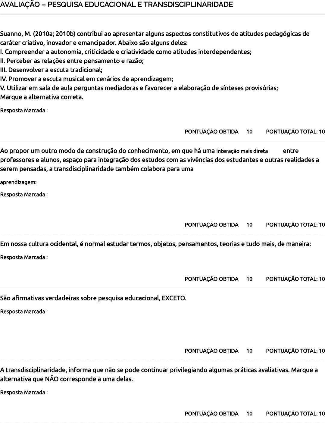 AVALIAÇÃO – PESQUISA EDUCACIONAL E TRANSDISCIPLINARIDADE PONTUAÇÃO TOTAL: 10PONTUAÇÃO OBTIDA 10 Suanno, M. (2010a; 2010b) contribui ao apresentar alguns aspectos constitutivos de atitudes pedagógicas de caráter criativo, inovador e emancipador. Abaixo são alguns deles: I. Compreender a autonomia, criticidade e criatividade como atitudes interdependentes; II. Perceber as relações entre pensamento e razão; III. Desenvolver a escuta tradicional; IV. Promover a escuta musical em cenários de aprendizagem; V. Utilizar em sala de aula perguntas mediadoras e favorecer a elaboração de sínteses provisórias; Marque a alternativa correta. Resposta Marcada : I, IV e V são corretas. PONTUAÇÃO TOTAL: 10PONTUAÇÃO OBTIDA 10 Ao propor um outro modo de construção do conhecimento, em que há uma interação mais direta entre professores e alunos, espaço para integração dos estudos com as vivências dos estudantes e outras realidades a serem pensadas, a transdisciplinaridade também colabora para uma aprendizagem: Resposta Marcada : Mais signi�cativa por colocar o aprendiz em uma posição ativa na qual exercita suas ideias e opiniões, além de sua habilidade de pesquisa e comunicação. PONTUAÇÃO TOTAL: 10PONTUAÇÃO OBTIDA 10 Em nossa cultura ocidental, é normal estudar termos, objetos, pensamentos, teorias e tudo mais, de maneira: Resposta Marcada : Segregada. PONTUAÇÃO TOTAL: 10PONTUAÇÃO OBTIDA 10 São a�rmativas verdadeiras sobre pesquisa educacional, EXCETO. Resposta Marcada : E no que se refere ao professor, não existem ganhos que perpassam as suas realizações pessoais, uma vez que a pesquisa se con�gura como satisfação pessoal, abrangendo uma totalidade gerando diferentes graus de transformações nos vários grupos contidos pela área pela qual se desenvolve a pesquisa. PONTUAÇÃO TOTAL: 10PONTUAÇÃO OBTIDA 10 A transdisciplinaridade, informa que não se pode continuar privilegiando algumas práticas avaliativas. Marque a alternativa que NÃO corresponde a uma delas. Resposta Marcada : Formativa. 06/06/2024, 18:04 Course Status – Faculdade Facuvale https://ava.faculdadefacuvale.universaeducacional.com.br/course-status/ 1/2 100 / 100 PONTUAÇÃO TOTAL: 10PONTUAÇÃO OBTIDA 10 Sobre currículo é incorreto a�rmar. Resposta Marcada : Não recomenda-se a construção de um currículo como expressão da vida, como expressão do encontro de processos vitais e cognitivos, já que vida e aprendizagem se separam. PONTUAÇÃO TOTAL: 10PONTUAÇÃO OBTIDA 10 Empreender uma discussão acerca da ação pedagógica amparada nos fundamentos da interdisciplinaridade e da transdisciplinaridade preside a elucidação de alguns dos seus aspectos. Marque um que não corresponde a um deles. Resposta Marcada : Descobrimento. PONTUAÇÃO TOTAL: 10PONTUAÇÃO OBTIDA 10 Como Ludwig (2009) concebe a pesquisa? Resposta Marcada : Como uma atividade racional e sistemática que se propõe dar respostas a determinados problemas próprios de qualquer área do conhecimento humano. PONTUAÇÃO TOTAL: 10PONTUAÇÃO OBTIDA 10 Por que a pesquisa na formação inicial é mais valorizada do que na prática docente? Resposta Marcada : Os iniciantes estão desejosos por novos conhecimentos e descobrindo novos horizontes em suas vidas, tanto pessoal, quanto vislumbrando um campo pro�ssional efetivo. PONTUAÇÃO TOTAL: 10PONTUAÇÃO OBTIDA 10 O termo transdisciplinaridade foi citado inicialmente por: Resposta Marcada : Jean Piaget. Total 06/06/2024, 18:04 Course Status – Faculdade Facuvale https://ava.faculdadefacuvale.universaeducacional.com.br/course-status/ 2/2