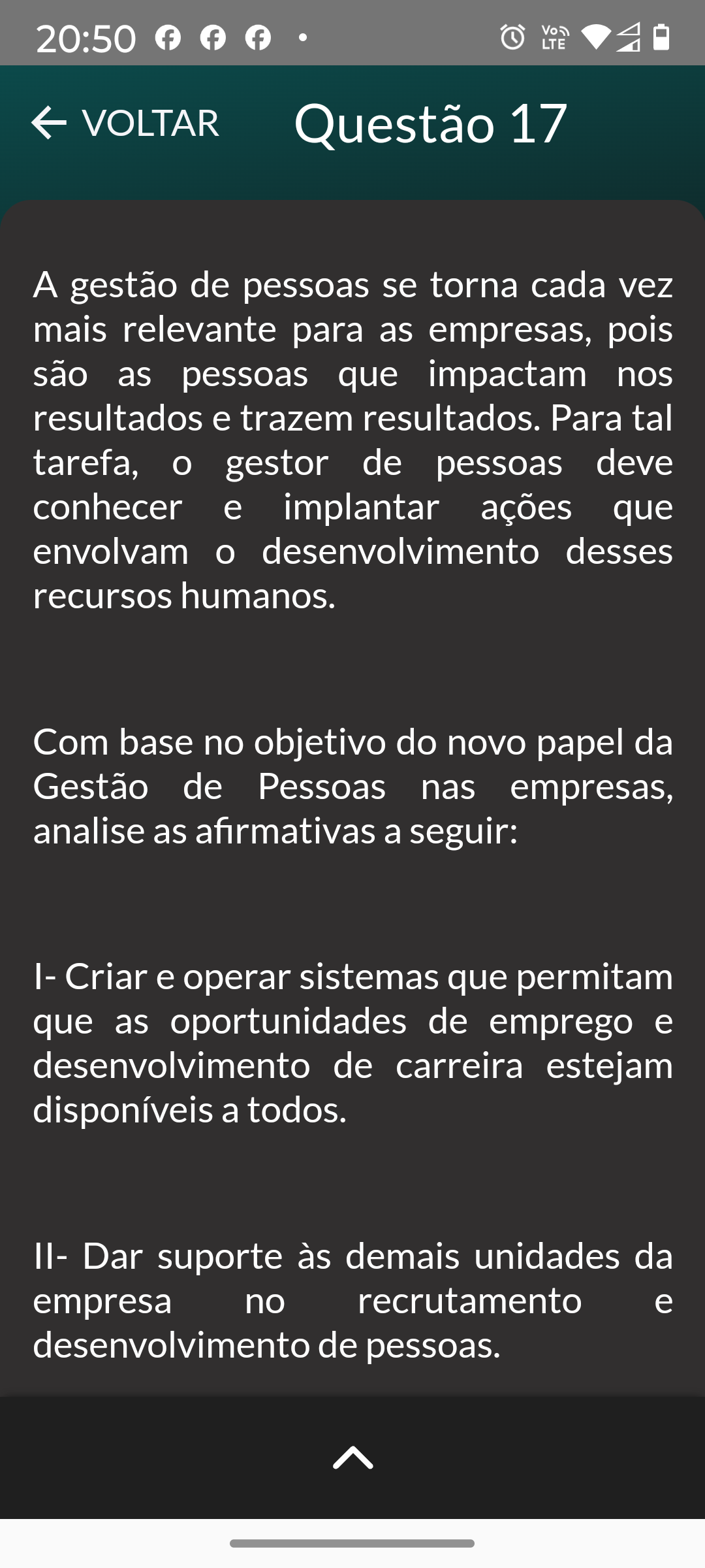 20:50 f f LTE VOLTAR Questão 17 A gestão de pessoas se torna cada vez mais relevante para as empresas, pois são as pessoas que impactam nos resultados e trazem resultados. Para tal tarefa, O gestor de pessoas deve conhecer e implantar ações que envolvam O desenvolvimento desses recursos humanos. Com base no objetivo do novo papel da Gestão de Pessoas nas empresas, analise as afirmativas a seguir: Criar e operar sistemas que permitam que as oportunidades de emprego e desenvolvimento de carreira estejam disponíveis a todos. II- Dar suporte às demais unidades da empresa no recrutamento e desenvolvimento de pessoas.