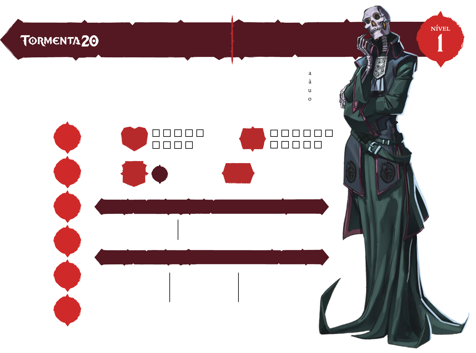 Caveiro osteon circense arcanista 1 0 1 0 1 5 2 FOR força con constituição sab sabedoria des destreza int inteligência car carisma Outrora um mago itinerante, Caveiro apresentava-se em exibições de prestidigitação e espetáculos de luzes de aldeia em aldeia. Contudo, quando suas andanças o levaram a uma terra onde a magia era proibida, ele foi condenado à morte. A execução foi rápida, mas não permanente. Reerguido do túmulo quando um poderoso necromante realizou um ritual naquele mesmo reino, ele está tentando retomar sua “vida” e espera um dia ter seu próprio espetáculo de magia e variedades. 10+Def defesa destreza (+1)11 pm pontos de mana 11pv pontos de vida 9 nível Deslocamento9m Ataques Perícias adaga alcance corpo a corpo ou curto (9m) arremessada 1d20+1 para acertar (corpo a corpo e arremessada) | crítico com 19 ou 20 dano 1d4 corte (crítico 2d4) acrobacia +3 atuação +5 conhecimento +7 diplomacia +4 enganação +4 fortitude +1 iniciativa +3 jogatina +4 perícias em negrito são seus testes de resistência misticismo +7 nobreza +7 reflexos +4 vontade +2 O K it In tr o d u tó ri o d e To rm en ta 20 é u m a pu bl ic aç ão p ar a di st rib ui çã o liv re , a ut or iz ad a pe la Ja m bô E di to ra , d et en to ra d os d ire ito s. Armadura Óssea (poder de osteon). Você recebe redução de corte, frio e perfuração 5. Memória Póstuma (poder de osteon). Você é treinado em Acrobacia. Natureza Esquelética (poder de osteon). Você é uma criatura do tipo morto-vivo. Re- cebe visão no escuro e imunidade a efeitos de cansaço, metabólicos, de trevas e de veneno. Além disso, não precisa respirar, alimentar-se ou dormir. Por fim, efeitos mágicos de cura de luz causam dano a você e você não se beneficia de itens da categoria alimentação, mas dano de trevas recupera seus PV. Preço da Não Vida (poder de osteon). Você precisa passar oito horas sob a luz de estrelas ou no subterrâneo. Se fizer isso, recupera PV e PM por descanso em condições normais (osteon não são afetados por condições boas ou ruins de descanso). Para cada dia que não faz isso, você deve fazer um teste de Fortitude (CD 15+1 para cada teste anterior). Se falhar, fica fraco, se falhar novamente fica debilitado. Uma terceira falha o deixa inconsciente. A quarta falha é letal. Essas condições só podem ser curadas passando oito horas sob a luz de estrelas ou no subterrâneo. Caminho de Arcanista (poder de arcanista). Você é um mago. Você lança magias através de estudo e memorização de fórmulas arcanas. Você só pode lançar magias memorizadas; suas outras magias não podem ser lançadas, mesmo que você tenha pontos de mana para tal. Para memorizar magias, você precisa estudar seu grimório por uma hora. Quando faz isso, escolhe metade das magias que conhece (por exemplo, como conhece 4 magias, escolhe 2). Essas serão suas magias memorizadas. Você pode memorizar magias uma vez por dia. Caso não possa estudar (por não ter tempo, por ter perdido o grimório...), não poderá trocar suas magias memorizadas. Um grimório tem redução de dano 10 e metade dos seus PV, independente do seu material ou forma. Você pode refazer um grimório perdido ou destruído com uma semana de trabalho e T$ 100. Seu atributo-chave para magias é Inteligência. Proficiências. Nenhuma. Adaga. Esta faca afiada é usada por muitos habitantes do Reinado, embora seja favorita de ladrões e assassinos, por ser facilmente escondida (fornece +5 em testes de Ladi- nagem para ocultá-la). Quando ataca com uma adaga, você pode usar sua Destreza em vez de Força nos testes de ataque. Uma adaga pode ser arremessada em alcance curto (9m). Esta arma simples é empunhada com uma mão, causa 1d4 pontos de dano de perfuração e tem crítico 19/x2. Bolas coloridas. Este conjunto de três boli- nhas coloridas para malabarismo fornece +1 em Atuação. Corda. Um rolo com 10 metros de corda de cânhamo, o mesmo tipo usado em navios. Essência de mana. Esta poção feita de ervas raras e compostos alquímicos recupera energia pessoal. Beber a essência de mana é uma ação padrão e recupera 1d4 pontos de mana. Mochila. Uma bolsa de lona com tiras para ser carregada nas costas. Traje de viajante. Inclui botas, calças ou saias, cinto, camisa de linho e capa com capuz. A roupa padrão de aventureiros. � +3 PV, +6 PM e +1 em todas as perícias. � Você aprende a magia Seta Infalível de Talude. Seta Infalível de Talude (Evocação) Você pode gastar uma ação padrão e 1 PM para disparar duas setas de energia contra criaturas em alcance médio (30m). Cada seta causa 1d4+1 pontos de dano de essência, e você pode lançá-las em alvos diferentes ou concentrá-las num mesmo alvo. Caso você possua um bônus no dano de magias, como pelo poder Arcano de Batalha, ele é aplicado em apenas uma seta (o bônus vale para a magia, não cada alvo). � Você recebe um poder à sua escolha entre Arcano de Batalha ou Raio Arcano. Arcano de Batalha. Quando lança uma magia, você soma sua Inteligência nas rolagens de dano. Raio Arcano. Você pode gastar uma ação padrão para causar 1d8 pontos de dano de essência num alvo em alcance curto. O alvo pode fazer um teste de Reflexos (CD Inteligência) para reduzir o dano à metade. O raio arcano conta como uma magia para efeitos de habilidades e itens que beneficiem suas magias. Adaga Mental (Encantamento) Você pode gastar uma ação padrão e 1 PM para manifestar e disparar uma adaga imaterial contra uma criatura em alcance curto (9m). A vítima sofre 2d6 pontos de dano psíquico e fica atordoada por uma rodada. Se passar em um teste de Vontade, ela sofre apenas metade do dano e evita a condição. Uma criatura só pode ficar atordoada por esta magia uma vez por cena. Armadura Arcana (Abjuração) Você pode gastar uma ação padrão e 1 PM para criar uma película protetora invisível, mas tangível, ao seu redor por uma cena. Essa película fornece +5 na
