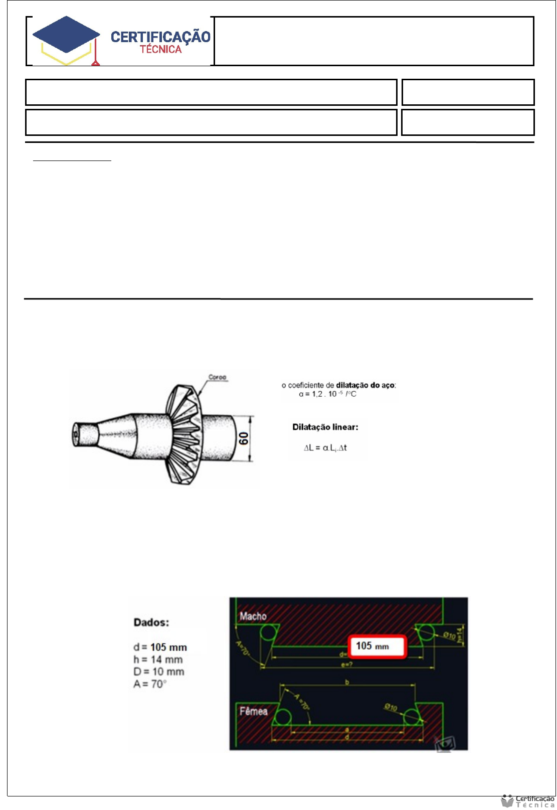 Prática em Funções e Trigonometria Básica para Mecânica Data: Aluno (a): Avaliação Prática INSTRUÇÕES: · Esta Avaliação contém 4 (quatro) questões, totalizando 10 (dez) pontos; · Baixe o arquivo disponível com a Atividade Pratica; · Você deve preencher dos dados no Cabeçalho para sua identificação: · Nome / Data de entrega. · As respostas devem ser digitadas abaixo de cada pergunta; · Ao terminar grave o arquivo com o nome Atividade Prática; · Quando solicitado · Envio o arquivo pelo sistema no local indicado; · Em caso de dúvidas consulte o seu Tutor. 1) Se o diâmetro do furo da cora é 0,03 milímetros menor do que o diâmetro do eixo, encontre qual é a temperatura a que o diâmetro do furo da coroa deve ser submetido para montar o conjunto. Lembrando que o material do conjunto é de aço e o diâmetro do eixo é de 60 milímetros 2) Problema relacionado ao “Rabo de Andorinha”. Considerando a imagem abaixo e os dados fornecidos, aplique as formulas e encontre os valores de a, b , e 3) Qual o valor da medida faltante X 4) Temos uma peço circular de 10 milímetros de raio e precisa de 4 furos iguais e mesma distância entre eles. Calcule qual será esta distância. Prática em Funções e Trigonometria Básica para Mecânica Prática em Funções e Trigonometria Básica para Mecânica image3.png image4.png image5.png image6.png image7.png image1.png image2.png image9.jpeg image8.png