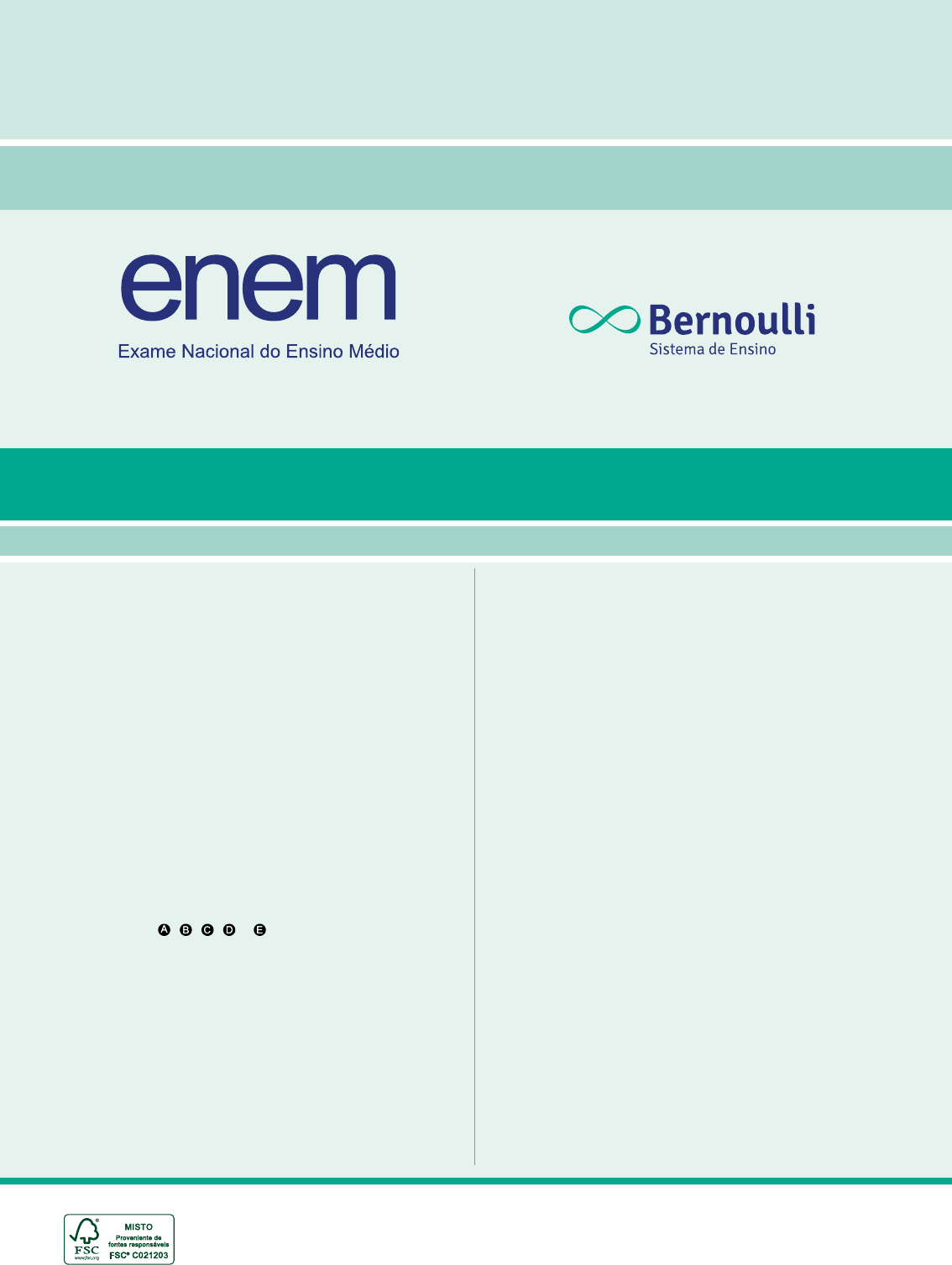 PROVA DE CIÊNCIAS DA NATUREZA E SUAS TECNOLOGIAS PROVA DE MATEMÁTICA E SUAS TECNOLOGIAS 1 Este CADERNO DE QUESTÕES contém 90 questões numeradas de 91 a 180, dispostas da seguinte maneira: a. as questões de número 91 a 135 são relativas à área de Ciências da Natureza e suas Tecnologias; b. as questões de número 136 a 180 são relativas à área de Matemática e suas Tecnologias. 2 Confira se o seu CADERNO DE QUESTÕES contém a quantidade de questões e se essas questões estão na ordem mencionada na instrução anterior. Caso o caderno esteja incompleto, tenha qualquer defeito ou apresente divergência, comunique ao aplicador da sala para que ele tome as providências cabíveis. 3 Escreva e assine seu nome nos espaços próprios do CARTÃO-RESPOSTA com caneta esferográfica de tinta preta. 4 Não dobre, não amasse nem rasure o CARTÃO-RESPOSTA, pois ele não poderá ser substituído. 5 Para cada uma das questões objetivas, são apresentadas 5 opções identificadas com as letras , , , e . Apenas uma responde corretamente à questão. 6 Use o código presente nesta capa para preencher o campo correspondente no CARTÃO-RESPOSTA. 7 Com seu RA (Registro Acadêmico), preencha o campo correspondente ao código do aluno. Se o seu RA não apresentar 7 dígitos, preencha os primeiros espaços e deixe os demais em branco. 8 No CARTÃO-RESPOSTA, preencha todo o espaço destinado à opção escolhida para a resposta. A marcação em mais de uma opção anula a questão, mesmo que uma das respostas esteja correta. 9 O tempo disponível para estas provas é de cinco horas. 10 Reserve os 30 minutos finais para marcar seu CARTÃO-RESPOSTA. Os rascunhos e as marcações assinaladas no CADERNO DE QUESTÕES não serão considerados na avaliação. 11 Quando terminar as provas, acene para chamar o aplicador e entregue este CADERNO DE QUESTÕES e o CARTÃO-RESPOSTA. 12 Você poderá deixar o local de prova somente após decorridas duas horas do início da aplicação e poderá levar seu CADERNO DE QUESTÕES ao deixar em definitivo a sala de provas nos últimos 30 minutos que antecedem o término das provas. 13 Você será excluído do Exame, a qualquer tempo, no caso de: a. prestar, em qualquer documento, declaração falsa ou inexata; b. agir com incorreção ou descortesia para com qualquer participante ou pessoa envolvida no processo de aplicação das provas; c. perturbar, de qualquer modo, a ordem no local de aplicação das provas, incorrendo em comportamento indevido durante a realização do Exame; d. se comunicar, durante as provas, com outro participante verbalmente, por escrito ou por qualquer outra forma; e. portar qualquer tipo de equipamento eletrônico e de comunicação durante a realização do Exame; f. utilizar ou tentar utilizar meio fraudulento, em benefício próprio ou de terceiros, em qualquer etapa do Exame; g. utilizar livros, notas ou impressos durante a realização do Exame; h. se ausentar da sala de provas levando consigo o CADERNO DE QUESTÕES antes do prazo estabelecido e / ou o CARTÃO-RESPOSTA a qualquer tempo. LEIA ATENTAMENTE AS INSTRUÇÕES SEGUINTES *de acordo com o horário de Brasília 2024 ESTA PROVA SOMENTE PODERÁ SER APLICADA A PARTIR DO DIA 15/06/2024, ÀS 13H00*. Código da Prova: 8X Simulado Extra – Prova II EXAME NACIONAL DO ENSINO MÉDIO CIÊNCIAS DA NATUREZA E SUAS TECNOLOGIAS Questões de 91 a 135 QUESTÃO 91 Um eletricista realizará a substituição de uma resistência queimada do chuveiro de uma residência alimentada por uma tensão de 110 V. Após verificar as especificações do aparelho, ele percebe que a informação referente à resistência elétrica está apagada, mas identifica que as diferentes temperaturas de operação do chuveiro são representadas por 0,5 A, 1 A e 2 A. Considerando que a resistência queimada corresponde à configuração de maior temperatura, qual deve ser o valor, em ohm, da nova resistência? A. 27 B. 55 C. 110 D. 220 E. 440 QUESTÃO 92 O termo “isômero” vem do grego e significa iso (igual) e mero (parte), pois os compostos que apresentam isomeria têm a mesma fórmula molecular, mas fórmulas estruturais diferentes. Um dos tipos de isomeria plana é a metameria, também chamada de isomeria de compensação, em que os isômeros se diferem apenas na posição do heteroátomo presente na cadeia carbônica da molécula. Disponível em: <www.teses.usp.br>. Acesso em: 9 mar. 2024 (Adaptação). Entre os pares de substâncias representados a seguir, qual apresenta o tipo de isomeria descrito? A. OHH3C e O CH3H3C B. OH e CH3 O C. CH3H3C e CH2H3C D. CH3H3C NH2 e CH3H2N E. CH3H3C NH e CH3H3C NH QUESTÃO 93 Mais de um terço dos norte-americanos têm colesterol alto, aumentando o risco de derrame e doenças cardíacas. O que comemos tem um papel importante na manutenção da saúde cardiovascular, então, seguindo essa lógica, ingerir alimentos ricos em colesterol pode aumentar seus níveis. Mas não é bem assim. “Acho que para muitas pessoas isso faz sentido, mas não é o que estudos mostram”, diz a diretora do Laboratório de Nutrição Cardiovascular da Tufts University, nos Estados Unidos. A quantidade de colesterol na comida ingerida não é, necessariamente, maior do que a quantidade encontrada nos vasos sanguíneos. Disponível em: <www.cnnbrasil.com.br>. Acesso em: 12 mar. 2024. A diferença entre os resultados de estudos e a concepção popular sobre esse lipídio é justificada pelo(a) A. eliminação da maior parte dessa substância junto com as fezes. B. degradação acentuada dessa molécula por células especializadas. C. absorção diferenciada dos alimentos de origem vegetal no intestino. D. capacidade do organismo em sintetizá-lo a partir de outros nutrientes. E. uso de seus produtos metabólicos para formar proteínas citoplasmáticas. QUESTÃO 94 Os semicondutores são materiais que aumentam sua condutividade elétrica a partir do aumento de temperatura ou pelo processo de dopagem, 