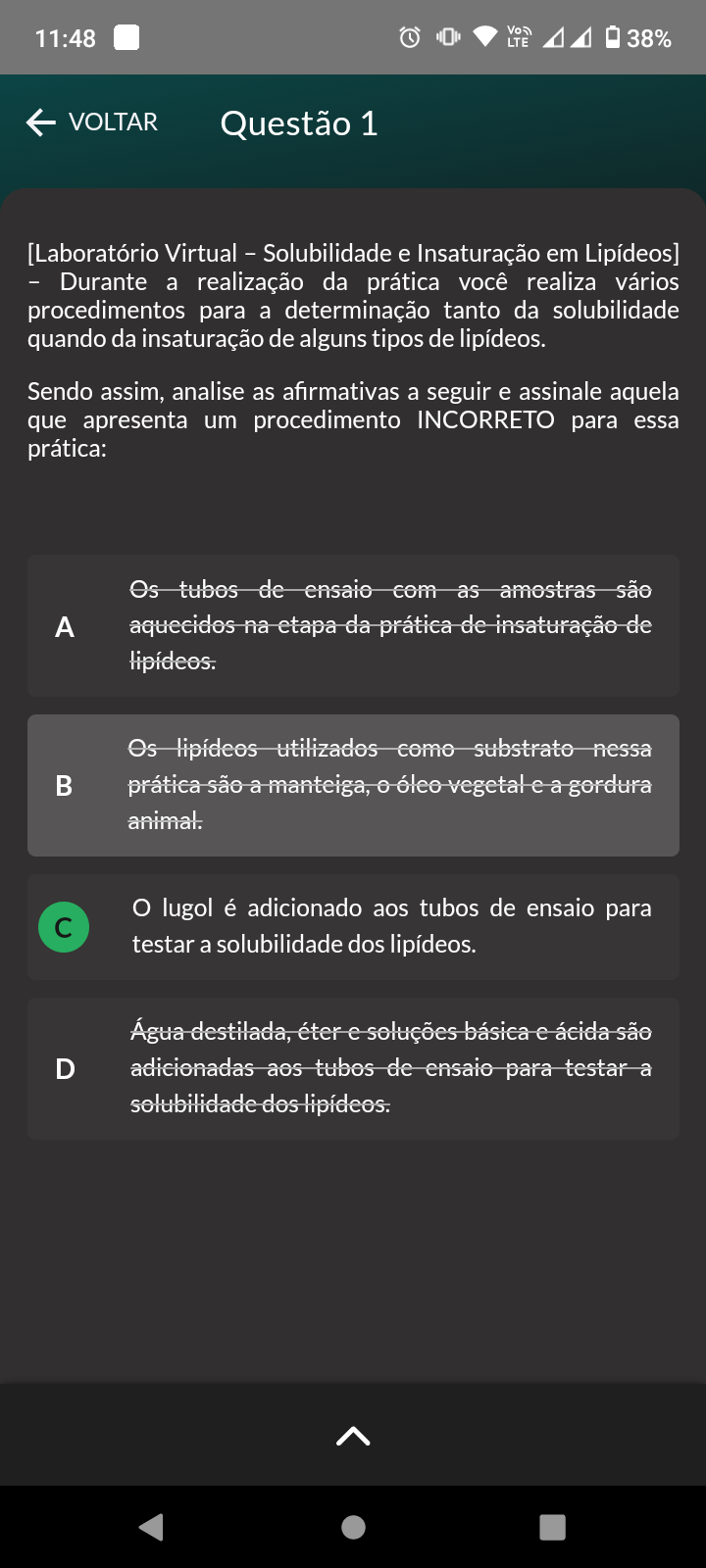 11:48 LTE 38% VOLTAR Questão 1 [Laboratório Virtual - Solubilidade e Insaturação em Lipídeos] - Durante a realização da prática você realiza vários procedimentos para a determinação tanto da solubilidade quando da insaturação de alguns tipos de lipídeos. Sendo assim, analise as afirmativas a seguir e assinale aquela que apresenta um procedimento INCORRETO para essa prática: Os tubes de ensaio com as amostras são A aquecidos na etapa da prática de insaturação de Os utilizados substrato nessa prática são a manteiga, vegetal e a gordura animal. O lugol é adicionado aos tubos de ensaio para C testar a solubilidade dos lipídeos. Água destilada, éter e soluções básica e ácida são D adicionadas aos tubes de para testar a solubilidade lipídees.