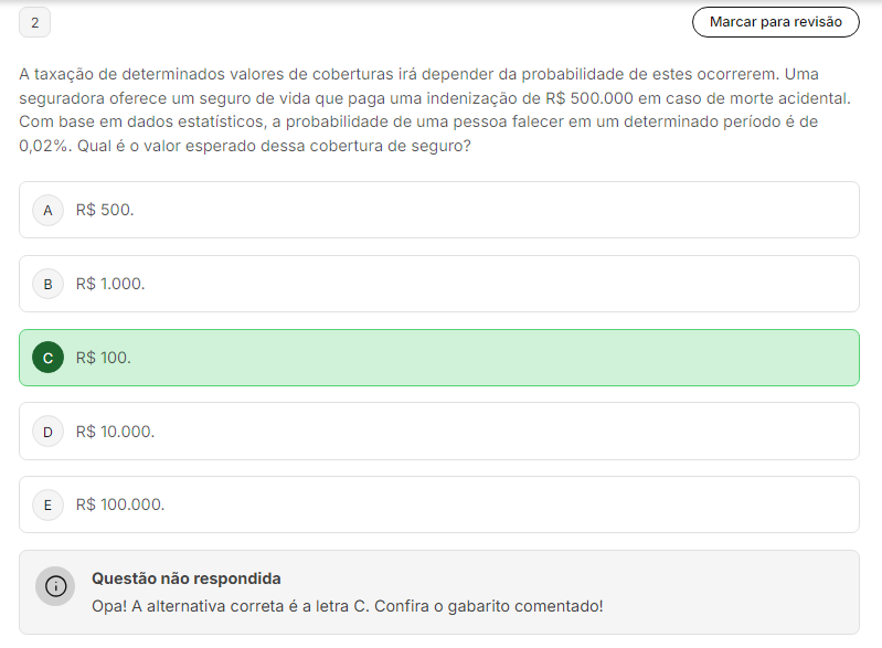 2 Marcar para revisão A taxação de determinados valores de coberturas irá depender da probabilidade de estes ocorrerem. Uma seguradora oferece um seguro de vida que paga uma indenização de R$ 500.000 em caso de morte acidental. Com base em dados estatísticos, a probabilidade de uma pessoa falecer em um determinado período é de Qual é valor esperado dessa cobertura de seguro? A R$ 500. B R$ 1.000. C R$ 100. D R$ E R$ 100.000. Questão não respondida Opa! A alternativa correta é a letra C. Confira gabarito comentado!