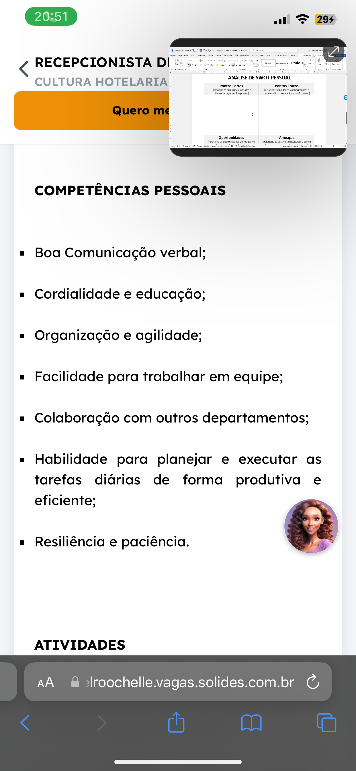 20:51 294 RECEPCIONISTA DI Título ANÁLISE DE SWOT PESSOAL CULTURA HOTELARIA Pontos Fortes Pontos Fracos (Relacione qualidades virtudes conhecimentos diferenciais que você ainda não possui) Quero me Oportunidades Ameacas (Relacione dificuldades COMPETÊNCIAS PESSOAIS Boa Comunicação verbal; e educação; Organização e agilidade; Facilidade para trabalhar em equipe; Colaboração com outros departamentos; Habilidade para planejar e executar as tarefas diárias de forma produtiva e eficiente; Resiliência e paciência. ATIVIDADES AA elroochelle.vagas.solides.com.br
