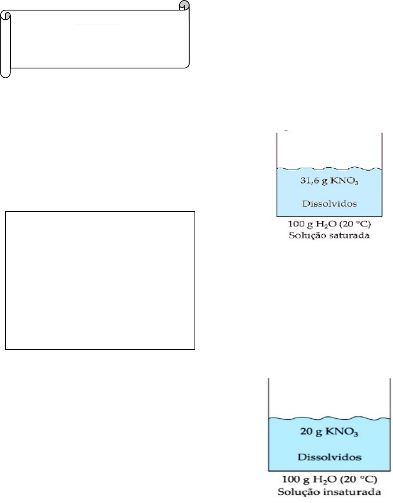 PARTE 1 SOLUÇÕES, COLOÍDES E SUSPENSÕES: TEORIA 1) Conceito de Soluções: São misturas homogêneas de duas ou mais substâncias. Em uma solução, geralmente, a substancia em menor quantidade é chamada de soluto, e em maior quantidade de solvente. 2) CONCEITO DE COEFICIENTE DE SOLUBILIDADE. Coeficiente de solubilidade (C.S): É a quantidade máxima de soluto (geralmente em gramas) capaz de ser dissolvida em uma quantidade padrão (geralmente 100g, 1000g ou 1 L) de solvente, em determinadas condições de temperaturas e pressão (em geral 25°C e 1 atm). Exemplo: C.S do NaCl = 36g/100g de H2O (20°C, 1atm) 3) Classificação quanto á relação entre as quantidades de soluto e solvente: É de acordo com o coeficiente de solubilidade do soluto. a) Solução diluída: Quando a quantidade de soluto é pequena comparada à quantidade de solvente. Ex: Soro fisiológico (Cloreto de Sódio 0,9%) Mst = 0,9 g Msv = 99,1g Msl = 100g b) Solução concentrada: Quando a quantidade de soluto é considerável comparada à quantidade de solvente. Ex: Solução com teor de ácido sulfúrico (H2SO4) de 92%. Msl = 100% Mst = 92% c) Solução saturada: É quando uma quantidade padrão de solvente dissolve uma quantidade máxima de soluto a uma determinada temperatura, ou seja, a solução saturada contém exatamente a quantidade de soluto estabelecido pelo CS (solução estável). Solução em equilíbrio com corpo de chão, necessariamente é uma solução saturada. Na solução saturada o soluto dissolvido e o não dissolvido estão em equilíbrio dinâmico entre si. Consideraremos a solubilidade do nitrato de potássio para o exemplo a seguir. C.S. KNO3 = 31,6g/100g de H2O a 20ºC e 1 atm. d) Solução insaturada ou não- saturada: Quando uma quantidade padrão de solvente dissolve menor quantidade de soluto na mesma temperatura da solução saturada. Contém menos soluto que o estabelecido pelo coeficiente de solubilidade. Consideraremos a solubilidade do nitrato de potássio para o exemplo a seguir. C.S. KNO3 = 31,6g/100g de H2O a 20ºC e 1 atm. e) Solução supersaturada: Quando uma quantidade padrão de solvente dissolve uma quantidade de soluto maior que a respectiva solução saturada nas mesmas condições, ou seja, a quantidade de soluto está acima do permitido pelo coeficiente de solubilidade a uma dada temperatura. Apresenta corpo de fundo ou corpo de chão ou precipitado que não está em equilíbrio com a solução, a solução supersaturada é instável, e a mínima perturbação do sistema faz com que o excesso de soluto precipite, tornando-se uma solução saturada com presença de corpo de fundo. Consideraremos a solubilidade do nitrato de potássio para o exemplo a seguir. C.S. KNO3 = 31,6g/100g de H2O a 20ºC e 1 atm. 4) Classificação das soluções quanto ao estado físico: a) Solução Sólida: Soluto e Solvente estão sólidos. O soluto é o agente disperso e o solvente é o agente dispersante. Ex: Liga metálica de ouro 12. (50% de ouro) Liga metálica de ouro 18. (75% de ouro) Liga metálica de ouro 24. (100% de ouro) b) Solução gasosa: Mistura de gases solúveis entre si. Ex: Ar atmosférico. Os principais gases componentes do ar são o nitrogênio – N2 (80%) e o oxigênio – O2 (19%). O 1% restante é composto de gases em pequenas quantidades como ozônio (O3), gás metano (CH4), monóxido de carbono (CO), dióxido de carbono (CO2), vapor de água (H2O), entre outros. c) Solução líquida: Apesar de apresentar o aspecto totalmente líquido, nem todos os seus componentes estão inicialmente nesse estado físico ou de agregação. Existem três tipos básicos de soluções líquidas, que serão detalhadas a seguir: c.1). Líquido + Líquido: o primeiro tipo de solução líquida é formado por todos os seus componentes no estado líquido. Exemplo: o álcool etílico: uma mistura de álcool etílico e água. A água oxigenada (H2O2) c.2) Líquido + Sólido: Essa é a solução mais comum de todas, pois é produzida quando se dissolve um sólido em um solvente que, normalmente, é a água. Exemplos: • Soro fisiológico: solução formada por água e cloreto de sódio – NaCl (sal de cozinha); • Álcool iodado: iodo dissolvido em álcool; • Água sanitária: hipoclorito de sódio (NaClO), dissolvido em água; • Suco: misturamos dois sólidos (suco em pó e açúcar) com a água; • Soro caseiro: sal e açúcar solubilizados em água. c.3) Líquido + Gás: Esse tipo de solução necessita de alguns aspectos importantes para solubilizar o gás no líquido. • O aumento da pressão é um fator que ajuda o gás a passar para o estado líquido e se dissolver no solvente líquido (Lei de Henry). • A diminuição da temperatura aumenta a solubilidade do gás. Exemplos: Refrigerante (CO2) Concentração de O2 em água de rios, lagos etc. 5) PROPRIEDADES COLIGATIVAS. Volatilidade Temperatura de Ebulição e Fusão Pressão de Vapor Mudanças de estados físicos através da mudança de Temperatura e Pressão. 6) QUAL A DIFERENÇA ENTRE A PRESSÃO ATMOSFÉRICA E A PRESSÃO DE VAPOR? Pressão atmosférica: É a pressão que o ar da atmosfera exerce sobre a superfície do planeta. Essa pressão pode mudar de acordo com a variação de altitude, ou seja, quanto maior a altitude menor a pressão e, consequentemente, quanto menor a altitude maior a pressão exercida pelo ar na superfície terrestre. Pressão de vapor: A pressão de vapor é uma medida da tendência de evaporação de um líquido, essa tendência do liquido evaporar refere-se a sua Volatilidade. Assim, quanto mais volátil for o liquido, maior será sua pressão de vapor. Quanto maior a temperatura, maior a pressão de vapor. 7) QUAL A RELAÇÃO DO PONTO DE EBULIÇÃO COM A PRESSÃO ATMOSFÉRICA? O ponto de ebulição da água ao nível do mar (pressão atmosférica igual a 1 atm ou 760 mmHg e altitude igual a zero) é igual a 100ºC. Em cidades acima do nível do mar: Menor é a pressão atmosférica, meno