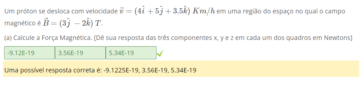 Um próton se desloca com velocidade = 3.5k) Km/h em uma região do espaço no qual o campo magnético é = T. (a) Calcule a Força Magnética. [Dê sua resposta das três componentes X, y e Z em cada um dos quadros em Newtons] -9.12E-19 3.56E-19 5.34E-19 Uma possível resposta correta é: -9.1225E-19, 3.56E-19, 5.34E-19