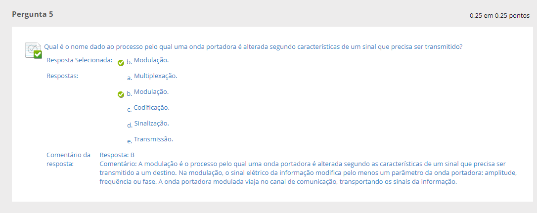 Pergunta 5 0,25 em 0.25 pontos Qual é nome dado ao processo pelo qual uma onda portadora é alterada segundo características de um sinal que precisa ser transmitido? Resposta Selecionada: b. Modulação. Respostas: a. Multiplexação. b. Modulação. Codificação. d. Sinalização. e. Transmissão. Comentário da Resposta: B resposta: Comentário: A modulação é processo pelo qual uma onda portadora é alterada segundo as características de um sinal que precisa ser transmitido a um destino. Na modulação, sinal elétrico da informação modifica pelo menos um parâmetro da onda portadora: frequência ou fase. A onda portadora modulada viaja no canal de comunicação, transportando os sinais da informação.