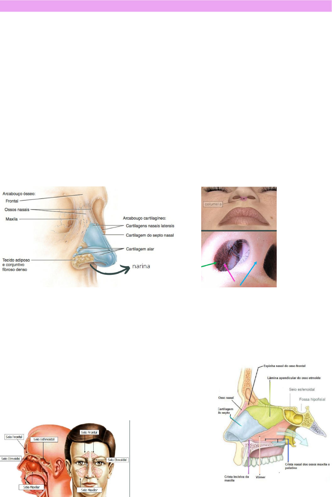 · TRATO RESPIRATÓRIO SUPERIOR: Nariz, cavidade nasal, cavidade oral, laringeSISTEMA RESPIRATÓRIO · TRATO RESPIRATÓRIO INFERIOR: Traquéia, brônquios, pulmão. · Vias aéreas superiores (condutoras): Nariz, cavidade nasal, cavidade oral, laringe, traquéia. · Vias aéreas inferiores (respiratória): Brônquios, pulmão. · NARIZ: - Raiz, dorso, asa, narina (abertura), ápice - Dividido em parte externa e parte interna. Função das estruturas interiores a parte externa: • Aquecimento | Umedecimento | Filtração do ar • Muco envolve e neutraliza agentes patológicos • Ar é aquecido pra favorecer as trocas gasosas • Detecção dos estímulos olfatórios – ODOR · Parte externa - Sustentação óssea: Frontal, ossos nasais (2), maxila (2) - Cartilagem hialina: cartilagem do septo nasal, processos laterais da cartilagem nasal, cartilagens alares - Recoberto por músculo e pele - Columela - Não cartilagínea · Parte interna ▪ Coanas – onde termina a cavidade nasal e começa a faringe · CAVIDADE NASAL: - Vestíbulo do nariz: dentro das narinas - Vibrissas · Septo nasal: • Cartilagem hialina • Parte óssea: Osso vômer; Lâmina perpendicular do osso etmoide; Osso Maxila; Osso palatino · Seios paranasais: aberturas de drenagem de muco. • Ductos nasolacrimais • Seios Frontal | Esfenoidal | Etmoidal | Maxilar · Parte lateral da cavidade nasal: ▪ Concha nasal são divididas em: superior, média e inferior ▪ Separadas por meatos: superior, médio e inferior • Área de Kiesselbach: Anastomoses (Entrelaçamento de capilares) – suscetível à sangramento nasal. • Epitélio olfatório: Pseudoestratificado ciliado (concha nasal superior) ▪ Células caliciforme - muco · FARINGE: • Inicia nas coanas até a cartilagem cricóidea (da laringe) • Comum ao sistema respiratório e digestório • Deglutição (M. Esquelético) e passagem do ar e alimentos • Tonsilas: ▪ Faríngea – Amidalas; ▪ Palatina – Adenoide; ▪ Lingual · Nasofaringe: ▪ Porção superior – Posterior a cavidade nasal até o palato mole ▪ Comunicações: coanas, óstio faríngeo da tuba auditiva e orofaringe ▪ Trocas de ar com as tubas auditivas para equilíbrio de pressão nesses órgãos · Orofaringe: ▪ Porção intermediária – Posterior a cavidade oral – Do palato mole até o osso hióide ▪ Comunicações: boca - Fauces, nasofaringe e laringofaringe · Laringofaringe: ▪ Porção Inferior ▪ Do osso hioide ao esôfago ▪ Se comunica com a orofaringe e com o esôfago (altura da cartilagem cricóidea) · Músculos da faringe: - CONSTRITORES - camada muscular circular externa. M. Constritor Superior; Médio; Inferior - Função: contração durante a deglutição - peristaltismo - LONGITUDINAIS - camada muscular interna. M. Palatofaríngeo; Estilofaríngeo; Salpingofaríngeo - Função: elevação durante a deglutição e fala · LARINGE: • Supraglote; Glote (região das cordas vocais); Subglote • Conecta a Faringe com a Traqueia. Trinagular • Constituída de Cartilagens, músculos e ligamentos • Passagem de ar durante a respiração • Epiglote: Impede que o alimento substâncias estranhas entren nas vias respiratórias ▪ Produz som • CARTILAGENS: 3 Pares e 3 ímpares · Epiglote: Fixo na cartilagem tireóidea. Durante a deglutição a faringe alarga e a laringe tampa a glote – se elevam · Cartilagem Tireóidea (Pomo-de-adão): cartilagem hialina; Forma parede anterior da laringe (triangular); Puberdade · Cartilagem Cricóidea: Cartilagem hialina; Parede inferior da laringe; Ponto de referência para traqueostomia · Cartilagem Aritenóidea: Mais triangular; Amplitude e mobilidade · Cartilagem corniculada: Cartilagem elástica; Associadas a mobilidade da faringe para produção do som. · Cartilagem Cuneiforme: Cartilagem elástica; Sustentam as pregas vocais e as faces laterais da epiglote · Ligamento Cricotireóideo · Ligamento Cricotraqueal · PREGAS VOCAIS: • Prega vocal falsa – Prega Vestibular (Superior) • Prega vocal verdadeira – Prega Vocal (Inferior) · Músculos da laringe: - EXTRÍNSECOS: se ligam ao osso hioide. Movem a cartilagem tiróidea. M. Estilo-hióideo; Digástrico; Milo-hióideo - INTRÍNSECOS: camada muscular interna. Produzir a fonação. M. Cricotiróideo; Tireoaritenóideo; Vocal;.... · TRAQUÉIA: • Da laringe até T5 – Posicionada a frente do esôfago. • Se conecta a Cartilagem cricóidea pelo Ligamento Cricotraqueal • Semirrígido; 16 a 20 anéis de cartilagem hialina em formato de C – Incompletos • Unidos por tecido conjuntivo – Ligamentos anulares • Inervada pelo N. Vago • Irrigada pelas A. Tireóideas Inferiores • Carina da Traqueia – Último anel onde ocorre a bifurcação para formar os brônquios - altura da T5. Contém barorreceptores. Reflexo de tosse ▪ Última barreira de defesa • M. Traqueal ▪ Contrai quando há passagem do bolo alimentar para dar mais espaço ao esôfago · BRÔNQUIOS: • Brônquios lobares que se subdividem em Brônquios segmentares • Brônquios Principais; ▪ Brônquios Lobares; Brônquios Segmentares; Bronquíolos; Bronquíolos Terminais. • BRÔNQUIOS PRINCIPAIS: • Semelhantes a traqueia – Configuração em forma de C (Semianéis) • Brônquio Principal Direito: Mais vertical e menor. 3 ramificações: Superior, Médio e Inferior • Brônquio Principal Esquerdo: Mais longo. 2 ramificações: Superior e Inferior · BRONQUÍOLOS: • Formados por divisões dos brônquios segmentares • Nos bronquíolos terminais se encontram os alvéolos pulmonares ▪ Não tem cartilagem · ALVÉOLOS: Altamente vascularizados para eficiência da hematose · PULMÃO: • Órgão principal da respiração – Coniforme • Separada pelo mediastino (onde fica o coração) • Envolvido pela pleura • Tecido esponjoso elástico ▪ Face Costal: face em contato com as costelas. Entre pulmões e as costelas ▪ Face Mediastinal: em contato com o coraçã