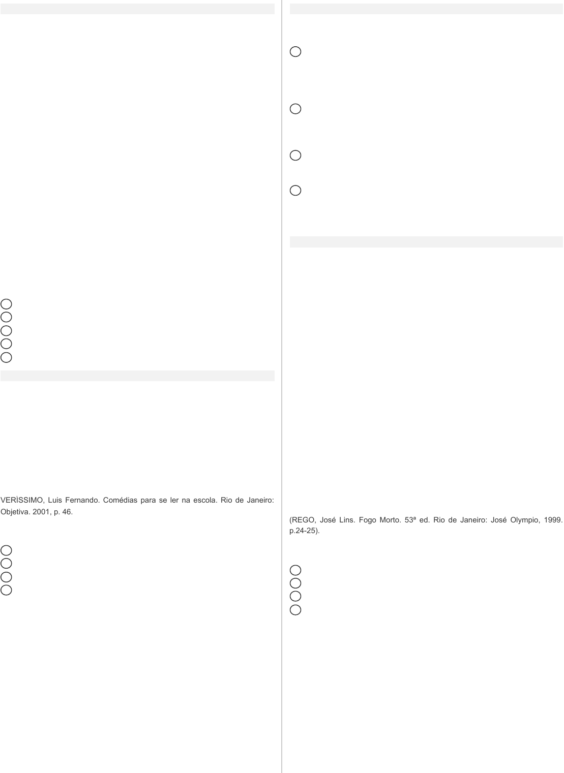 Simulado 10 questões UNITINSQuestão 1 O Arcadismo, também conhecido como Setecentismo ou Neoclassicismo, é o movimento que compreende a produção literária brasileira na segunda metade do século XVIII. Nesse período, aconteceram profundas mudanças no contexto histórico mundial que caracterizaram o período. Leia o poema de Cláudio Manuel da Costa, representante desse período literário. Já me enfado de ouvir este alarido, Com que se engana o mundo em seu cuidado; Quero ver entre as peles, e o cajado, Se melhora a fortuna de partido. Canse embora a lisonja ao que ferido Da enganosa esperança anda magoado; Que eu tenho de acolher-me sempre ao lado Do velho desengano apercebido. Aquele adore as roupas de alto preço, Um siga a ostentação, outro a vaidade; Todos se enganam com igual excesso. Eu não chamo a isto já felicidade: Ao campo me recolho, e reconheço, Que não há maior bem, que a soledade. Que alternativa apresenta característica do Arcadismo presente no poema? a Despreocupação formal na poesia. b Idealização da mulher e da natureza. c Linguagem rebuscada caracterizada pelo uso de antíteses. d Denúncia da realidade política, social e econômica brasileira. e Idealização da vida no campo. UFRNQuestão 2 Leia o fragmento a seguir, extraído da crônica “Vivendo e...”, de Luis Fernando Veríssimo. Na verdade, deve-se revisar aquela antiga frase. É vivendo e desaprendendo. Não falo daquelas coisas que deixamos de fazer porque não temos mais as condições físicas e a coragem de antigamente, como subir em bonde andando – mesmo porque não há mais bondes andando. Falo da sabedoria desperdiçada, das artes que nos abandonaram. A alteração que o autor faz no ditado popular “Vivendo e aprendendo” evidencia certo sentimento de a nostalgia. b revolta. c incompreensão. d arrependimento. ACAFEQuestão 3 Sobre a obra Fazenda Modelo de Chico Buarque, é CORRETO afirmar: a Juvenal é responsável por regular a reprodução na fazenda, atividade que visa resguardar a saúde de touros e bezerros, como se confirma no trecho: “A inconveniência concretiza-se no desenvolvimento do animal que, além de sofrer o impacto da desmama, encontra pastagens”. b o livro Fazenda Modelo apresenta uma crítica aos costumes e liberalidade da época em que foi escrito, como se comprova no trecho “E tem mais: a indisciplina reinava, imperava o mal. Campeavam as libertinagens. Elogiava-se a loucura.” c o trecho: “Mesmo o magoado, o chateado e o doente, até os mais doloridos apreciaram o programa assim que começou” ilustra as vantagens da vida oferecida aos animais na Fazenda Modelo. d “Ninguém é de ninguém / Na vida tudo passa / Ninguém é de ninguém / Até quem nos abraça”. Esses versos ilustram a ideia de liberdade que havia na fazenda antes da implementação da “Fazenda Modelo”. UVAQuestão 4 TEXTO [1] – Pode deixar o tabuleiro aí mesmo. Já estava com fome. – Sinhá Mariana manda dizer ao senhor para desculpar. Hoje é dia de guarda, e o povo da casa-grande está no jejum. – Este povo vai todo pro céu. Estão pensando que Deus Nosso Senhor gosta de gado magro. Deus gosta é de [5] ver gado de sedenho abrindo. O que foi que a velha mandou hoje? Esta história de bacalhau não é comigo. – Todo mundo está no bacalhau, mestre Zé. – Não venho trabalhar aqui para comer isto. – Os brancos estão comendo, mestre. – Quero lá saber de branco. Quero é a minha barriga cheia. [10] O moleque abriu os dentes numa risada gostosa. – Mestre, o velho anda com essa leseira de reza que não acaba mais. – É o que eles querem. Estão pensando que oficial é cachorro. Pensam que me machucam, não me chamando para comer na casa-grande. Não sou o pintor Laurentino que vive por aí contando prosa. O mestre José Amaro, menino, tem a sua bondade, também. Tenho trabalhado para senhor de engenho de muitas posses, gente de mesa [15] de banquete, e nunca vi este luxo aqui no Santa Fé. Pertence à mesma Escola que Lins do Rego: a Artur Azevedo. b Monteiro Lobato. c José de Alencar. d Jorge Amado. VERÍSSIMO, Luis Fernando. Comédias para se ler na escola. Rio de Janeiro: Objetiva. 2001, p. 46. (REGO, José Lins. Fogo Morto. 53ª ed. Rio de Janeiro: José Olympio, 1999. p.24-25). Texto base 1 Fabiano recebia na partilha a quarta parte dos bezerros e a terça dos cabritos. Mas como não tinha roça e apenas se limitava a semear na vazante uns punhados de feijão e milho, comia da feira, desfazia-se dos animais, não chegava a ferrar um bezerro ou assinar a orelha de um cabrito. [...] Consumidos os legumes, roídas as espigas de milho, recorria à gaveta do amo, cedia por preço baixo o produto das sortes. Resmungava, rezingava, numa aflição, tentando espichar os recursos minguados, engasgava-se, engolia em seco. Transigindo com outro, não seria roubado tão descaradamente. Mas receava ser expulso da fazenda. E rendia-se. [...] Pouco a pouco o ferro do proprietário queimava os bichos de Fabiano. E quando não tinha mais nada para vender, o sertanejo endividava-se. Ao chegar a partilha, estava encalacrado, e na hora das contas davam-lhe uma ninharia. Com referência ao fragmento de texto apresentado, extraído da obra Vidas secas, de Graciliano Ramos, e aos aspectos sociais a ele relacionados, julgue o próximo item. UnBQuestão 5 PARA RESPONDER À QUESTÃO, LEIA O TEXTO BASE 1 A seca do sertão nordestino é considerada um problema climático, mas não social. a Certo b Errado UnirGQuestão 6 Os contos “Miss Dollar” e “Linha reta e linha curva”, inseridos na coletânea Contos fluminenses, de Machado de Assis, desenvolvem seus enredos com base na temática da a união motivada pelo desejo de ascensão social. b infidelidade conjugal punida com desfecho trágico. c história de amor contemplada com um final feliz. d loucura causada por uma paixão impossível. UCPELQuestão 7 Sobre Francisco Lobo da Costa e sua obra, analise as afirmaç