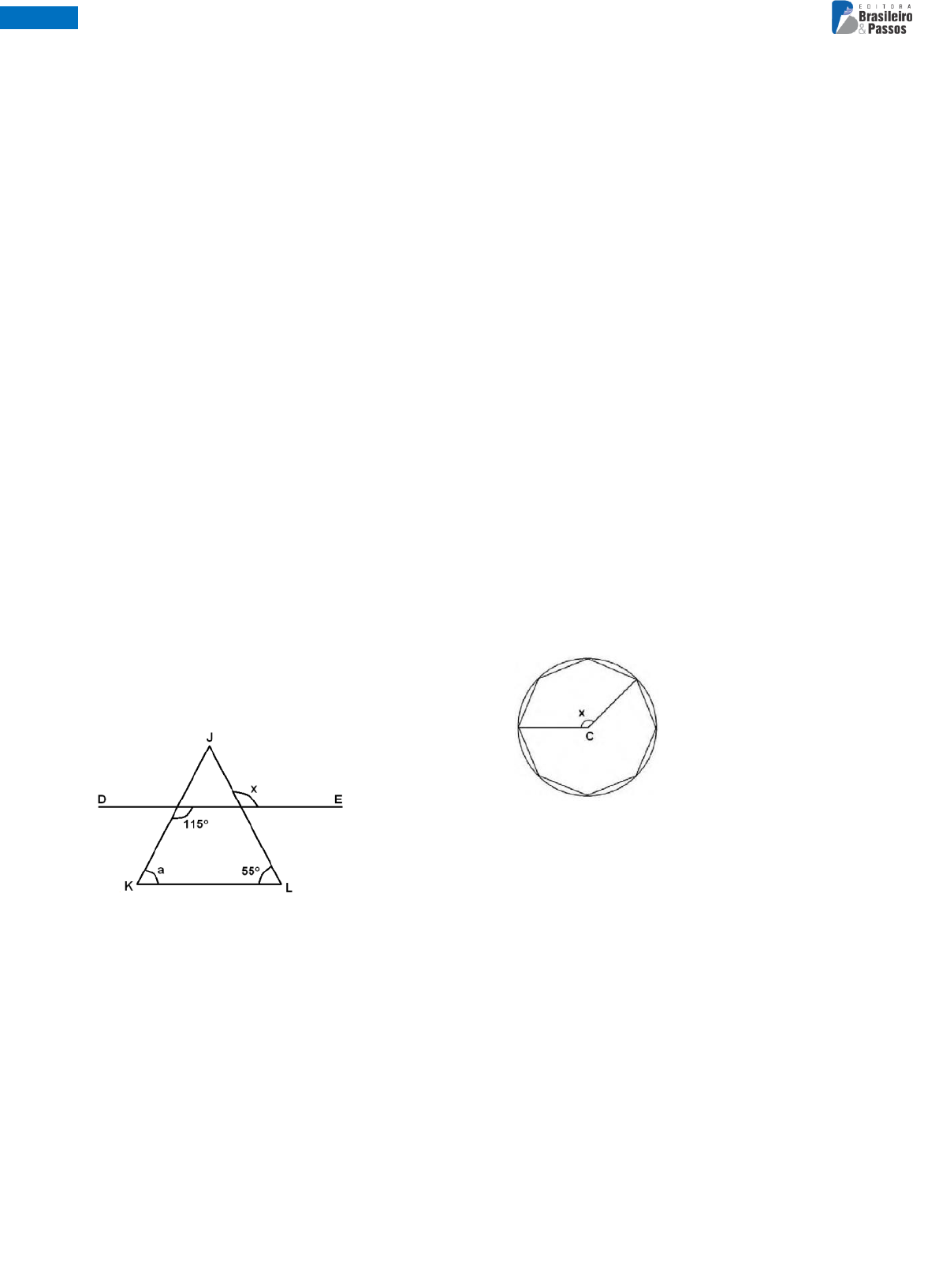 www.romulopassos.com.br MENTORIA IDECAN 1 23º Simulado IDECAN para Teresina-PI Raciocínio Lógico Quinta-feira, às 14h Geometria Básica Razão e Proporção 1 (COREN-MA/IDECAN/2013) No triângulo a seguir, o lado KL é paralelo ao segmento DE. A soma dos valores dos ângulos “x” e “a” é a) 170°. b) 180°. c) 185°. d) 190°. e) 195°. 2 (COREN - MA/IDECAN/2013) A figura mostra um octógono regular inscrito em uma circunferência de centro C. O valor de x é a) 120°. b) 125°. c) 135°. d) 140°. e) 145°. 3 (TCM-RJ/IBFC/2016) Sabe-se que a soma dos ângulos internos de um polígono é igual a 1260°. Se esse polígono é regular, então cada ângulo externo desse polígono é igual a: a) 140°. b) 40°. c) 126°. d) 54°. www.romulopassos.com.br 2 MENTORIA IDECAN 4 (IBGE/CESGRANRIO/2016) Considere as seguintes definições: 1 - Um triângulo é chamado de escaleno quando os seus lados possuem comprimentos diferentes. 2 - Um triângulo é chamado de isósceles quando há dois de seus lados com o mesmo comprimento. 3 - Um triângulo é chamado de equilátero quando todos os seus lados possuem o mesmo comprimento. De acordo com as definições apresentadas, um triângulo não é escaleno quando, e apenas quando, ele a) é isósceles. b) é isósceles, mas não é equilátero. c) não é isósceles. d) não é equilátero, nem é isósceles. e) não é equilátero. 5 (COREN-MA/IDECAN/2013) Observe os triângulos abaixo. Esses dois triângulos são semelhantes. Sendo assim, a soma dos valores de x e y é a) 32. d) 38. b) 34. e) 40. c) 36. 6 (IBGE/IDECAN/2022) Considere as seguintes afirmações abaixo: I. A soma dos ângulos internos de um triângulo é sempre igual a 180°. II. Em todo triângulo, qualquer ângulo externo é igual à soma dos dois ângulos internos não adjacentes a ele. III. Em todo triângulo, cada lado é menor que a soma dos outros dois. Assinale o item correto: a) Somente I está correta. b) Somente II está correta. c) Somente I e II estão corretas. d) Somente II e III estão corretas. e) Todas as afirmações estão corretas. 7 (SES-DF/IDECAN/2014) Observe a figura a seguir. Qual é o valor de x? a) 20°. b) 40°. c) 45°. d) 90°. e) 180°. 8 (IBGE/IDECAN/2022) Sabendo que o triângulo abaixo possui base no lado BC̅̅̅̅ e sabendo ainda que ele é isósceles. Determine o valor do ângulo x e assinale o item correto com base no valor de x. a) O triângulo é retângulo. b) O triângulo é equilátero. c) O valor de x é 45°. d) O triângulo é escaleno. e) O valor de x é 30°. 9 (Prefeitura de Santo André-SP/Vunesp/2024) Em um triângulo ABC, o ponto M divide o lado AB em duas partes de mesma medida, e os pontos P e Q estão sobre os lados desse triângulo, de modo que MP = MQ = MA, conforme mostra a figura. A medida do ângulo β é www.romulopassos.com.br 3 MENTORIA IDECAN a) 38°. b) 39°. c) 40°. d) 41°. e) 42°. 10 (CEFET-RJ/CESGRANRIO/2014) Observe os triângulos retângulos ACB e ECD. Os ângulos  e Ê, assinalados na Figura abaixo, têm medidas iguais e maiores do que 45°. Se AB = DE = 30 cm e BE = 42 cm, qual é a medida, em cm, do segmento DA? a) 2. b) 6. c) 12. d) 14. e) 18. 11 (CREFITO - 8ª Região/IDECAN/2013) Na figura a seguir ABCD é um quadrado, ABC e FGH são triângulos retângulos semelhantes, cujas hipotenusas medem, respectivamente, z e x. O valor da hipotenusa x do menor triângulo é a) 8 √3. b) 9 √2. c) 6 √3. d) 7 √2. e) 4 √3. 12 (SPTrans/Vunesp/2024) Do polígono ABCDEF, representado na figura a seguir, são fornecidas medidas de alguns de seus segmentos: AB = 4; BC = 3; AD = 12; EF = 25; AF = 7. A medida do contorno desse polígono é, em unidades de comprimento, igual a a) 76. b) 68. c) 64. d) 58. e) 55. 13 (CRF-SP/IDECAN/2018) Analise as afirmativas a seguir. I. Um ângulo agudo e um ângulo obtuso de um paralelogramo sempre são complementares. II. Toda propriedade do losango vale para o quadrado. III. Toda propriedade do losango vale para o paralelogramo. IV. O quadrado tem as propriedades do paralelogramo, do retângulo e do losango. Estão corretas apenas as afirmativas a) I e II. b) I e IV. c) II e III. d) II e IV. 14 (CRF-TO/CRF-TO/2015) Quantos metros de arame são necessários para cercar, com três fileiras de arame, o terreno desenhado abaixo: www.romulopassos.com.br 4 MENTORIA IDECAN a) 60. b) 54. c) 42. d) 36. 15 (COREN-MA/IDECAN/2013) As figuras a seguir apresentam perímetros de mesma medida. Se a segunda figura é um retângulo, então sua área é igual a a) 20 cm². b) 24 cm². c) 28 cm². d) 30 cm². e) 32 cm². 16 (CNEN/IDECAN/2014) A seguir estão representados um triângulo equilátero e um quadrado, cujos perímetros são iguais. Se a diferença entre os lados dessas 2 figura s é igual a 3 cm, então, o perímetro de cada uma delas mede a) 24 cm. d) 36 cm. b) 28 cm. e) 40 cm. c) 32 cm. 17 (Prefeitura de São João do Polêsine - RS/FUNDATEC/2023) Qual o perímetro de um triângulo retângulo cujos catetos medem 8 cm e 6 cm? a) 10 cm. d) 24 cm. b) 12 cm. e) 48 cm. c) 22 cm. 18 (Prefeitura de Lins-SP/Vunesp/2024) O lado maior de um retângulo tem 19 cm a mais de comprimento do que seu lado menor. Se o perímetro desse retângulo é igual a 77 cm, a medida do lado menor, em cm, está compreendida entre a) 1 e 5. b) 5 e 9. c) 9 e 13. d) 13 e 17. 19 (Prefeitura de São José dos Campos - SP/FGV/2023) Um jardim tem a forma de um quadrilátero ABCD no qual os ângulos de vértices A e D são retos. Sabe-se que AB = 11m, BC = 15m e CD = 20m. A área desse jardim, em m², é igual a a) 160. b) 168. c) 175. d) 186. e) 192. 20 (Prefeitura de Coqueiral-MG/FUNDATEC/2024) Um losango tem área de 216 cm2 e a diagonal maior é o triplo da medida da diagonal menor. Determine a medida, em centímetros, da diagonal maior. a) 6√2 cm. b) 12 cm c) 18√2 cm. d) 36 cm. e) 72 cm. 21 (IBGE/IBFC/2022) Ao analisar a cobertura territorial sobre sua responsabilidade, o coordenador riscou no mapa um retângul