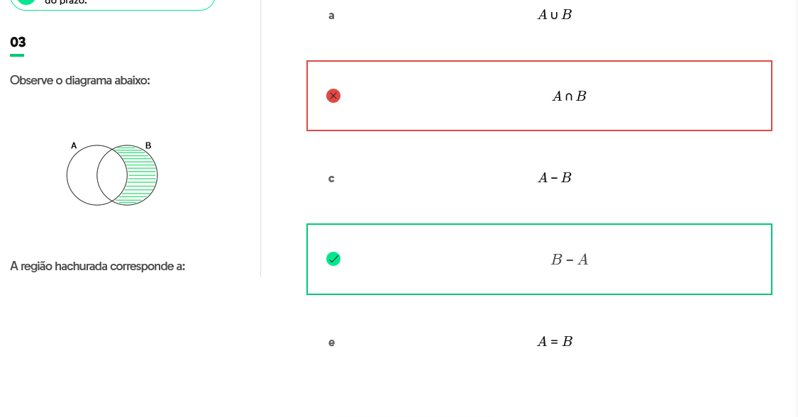 a AuB 03 Observe diagrama abaixo: AnB A B c A B B A A região hachurada corresponde a: e A = B