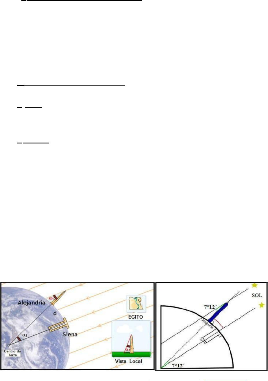 UFRGS – Disciplina: Universidade Federal do Rio Grande do Sul GEO 05013 – Cartografia Geral I – IGEO – Departamento de Geodésia Professor: Gilberto Gagg – Versão Preliminar 43 4. FORMA E DIMENSÕES DA TERRA A curiosidade do homem primitivo fez com que ele se interessasse pelo planeta em que vivia. Na observação de alguns fenômenos, surgiram superstições, ritos e cultos. De início foram usadas apenas observações astronômicas no estudo da geometria terrestre, e junto com as consequentes descobertas, permitiram na melhor compreensão dos eventos, resultando várias culturas e civilizações. Nos seus trabalhos de rotina, a Geodésia (ciência que estuda a forma e dimensões da Terra, seu campo gravitacional e as variações temporais) adota sistematicamente o elipsoide de revolução como modelo geométrico para representar a Terra. Para chegar a esta solução, o homem passou por várias iniciativas pois desde a origem da humanidade, há especulações sobre a forma da Terra. 4.1 Formas da Terra: breve histórico Ao longo da história,considerou-se a terra de várias formas: plana, esférica, elipsoidal, geoidal. a) Plana: até o século IV AC, os sábios da época acreditavam que a Terra era plana, com forma retangular, circundada pelos mares. No limite das águas com o espaço, havia seres mitológicos, o que inibia as aventuras marítimas. Anaxímenes defendia que a Terra era retangular, e que flutuava sobre um oceano infinito, o qual era mantido no espaço por um colchão de ar. b) Esférica: vários estudiosos começaram a defender a esfericidade da Terra: -Tales de Mileto (625-547 a.C): foi o primeiro defensor da esfericidade terrestre, afirmando também que a mesma girava em torno do Sol. - Pitágoras de Samos (580-500 a.C): foi filósofo e matemático grego, fundador da escola de Crotona, introduziu a idéia da Terra esférica. - Aristóteles (384-322 a.C): filósofo e matemático, admitia a esfericidade da Terra, considerando-a imóvel. Introduziu os primeiros conceitos referentes à força de gravidade terrestre, e trouxe argumentos positivos sobre a esfericidade terrestre, que são: 1) o contorno circular da sombra projetada pela Terra nos eclipses da Lua; 2) a variação do aspecto do céu estrelado com a latitude; 3) a diferença no horário de observação de um mesmo eclipse para observadores situados em diferentes meridianos. - Eratóstenes (276 -175 a.C): matemático, astrônomo e geógrafo grego. Foi diretor da Biblioteca de Alexandria. Investigou as medidas da Terra e calculou o meridiano terrestre. Cabe aqui uma explanação mais detalhada do seu experimento. Eratóstenes provou a esfericidade da Terra, calculando sua circunferência, a partir da diferença de latitudes entre 2 cidades egípcias: Alexandria e Syene (atual Assuan, situada às margens do Rio Nilo, suposta situar-se sobre o Trópico de Câncer, já que a tradição preconizava que “no dia de solstício de verão, o astro-rei iluminava o fundo de um poço”). Ao mesmo tempo, não estava a pico em Alexandria, fazendo surgir a projeção de uma sombra que fazia um ângulo de 7°12´ com a vertical. Ele usou um gnômon (vara), obtendo para a distância zenital meridiana do Sol (no solstício de verão), na cidade de Alexandria, o valor de 1/50 da circunferência (7°12´). Veja figura ilustrativa do experimento abaixo. Figura 4.1: Experimento de Eratóstenes - Fonte: www.filosofia-irc.org e www.profeblog.es http://www.filosofia-irc.org/ http://www.profeblog.es/ UFRGS – Disciplina: Universidade Federal do Rio Grande do Sul GEO 05013 – Cartografia Geral I – IGEO – Departamento de Geodésia Professor: Gilberto Gagg – Versão Preliminar 44 Para prosseguir no experimento, era preciso conhecer a distância Alexandria-Syene, o que não era difícil, face aos trabalhos de agrimensura dos egípcios no vale do Rio Nilo, e que era de 5.000 estádias (300 milhas ou cerca de 787,5 km).Considerando finalmente que as duas cidades estão situadas num mesmo meridiano, Eratóstenes obteve para o comprimento do arco de 1°, o valor de 694,4 estádias, que corresponde para a circunferência equatorial, a 250.000 estádias ou 39.375km. Foi o primeiro matemático da antiguidade que encontrou um valor tão próximo do real (40.074,15km), e que perdurou por muitos séculos. Hoje sabe-se que Syene está a 3° a leste de Alexandria. Figura 4.2 – Cidades de Alexandria e Aswan. Fonte: https://www.tripsinegypt.com e https://images.memphistours.com/ - João Picard (1620 - 1682): astrônomo francês que introduziu várias melhorias no instrumental de medidas angulares, e que mediu o arco de meridiano de Paris e Amiens, em função do qual, calculou o raio da Terra, obtendo 6275 km. Foi quem realizou a primeira medida da era moderna para dimensões da Terra. c) Elipsoidal: esta fase inicia-se com as investigações teóricas de Newton (1642 - 1727), que foi um físico e matemático inglês, cujas especulações não admitiam harmonização entre o movimento de rotação e a forma perfeitamente esférica do planeta. Outrossim, considerava, como conseqüência da força centrífuga, um eixo polar mais curto (achatamento polar), abrindo perspectivas para a era elipsoidal. Já Cassini (1625 - 1712): foi um astrônomo francês, diretor do Observatório de Paris, que ao prosseguir os trabalhos de triangulações iniciados por Picard, concluiu que o comprimento de um arco de meridiano decresce com o aumento da latitude, resultando para a Terra um achatamento equatorial e alongamento nos polos. A contradição entre a teoria de Newton ( apoiado por Huygens) e as conclusões de Cassini originaram uma polêmica entre as duas escolas européias: os adeptos de uma Terra achatada e os adeptos de uma Terra alongada, controvérsia esta fundamental para o início da Geodésia Moderna. Para esclarecer a dúvida, a Academia de Ciências de Paris patrocinou a medição de dois arcos de meridiano: um próximo do Equador e out