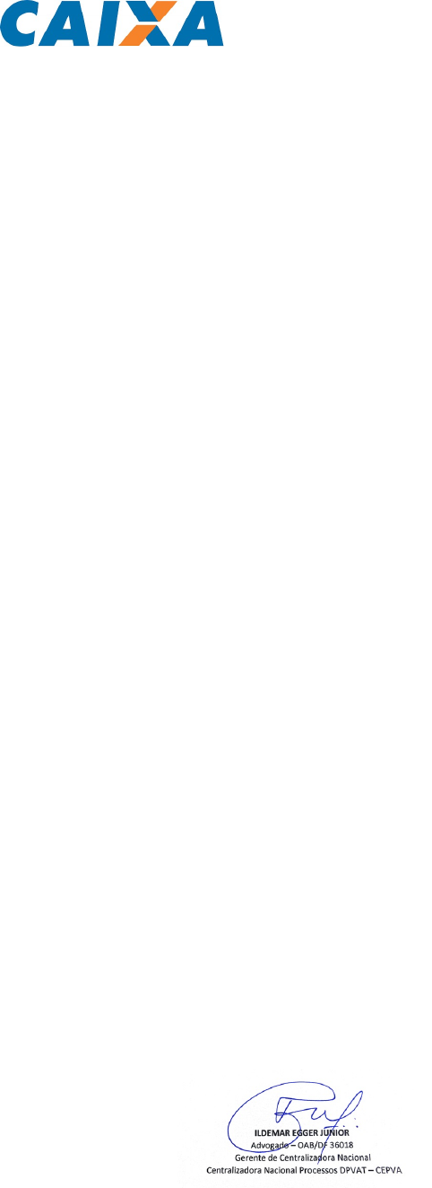 SUBSTABELECIMENTO Processo: 50058275820244036332 Nome Parte: ALEX LIMA DOS SANTOS Foro: JUIZADO ESPECIAL FEDERAL CIVEL Comarca: GUARULHOS Vara: 1 Outorgante: CAIXA ECONÔMICA FEDERAL E/OU EMGEA Outorgado: DIEGO PEREIRA AVELINO, Brasileiro, solteiro, advogado, inscrito na OAB/RS nº 71.463, residente e domiciliado na rua Federico Otávio Domingos Barbosa, 50/808 'D', bairro São Sebastião, Porto Alegre/RS., inscrito(a) na 71463 OAB/RS; LETÍCIA MOREIRA NUNES, brasileira, solteira, advogada, inscrita na OAB/RS 57.769, CPF nº 956.539.530-91, residente e domiciliada na rua São Mateus, nº 1.100, ap. 703, bairro Jardim do Salso, Porto Alegre - RS., inscrito(a) na 57769 OAB/RS; LUIZ HENRIQUE CABANELLOS SCHUH, ADVOGADO, inscrito(a) na 18.673 OAB/RS; RAFAEL DE CAMPOS, ADVOGADO, inscrito(a) na 71.374 OAB/RS; REINALDO MIRICO ARONIS, ADVOGADO, inscrito(a) na 35.137 OAB/PR; ARTUR OLIVEIRA MAUCH, ADVOGADO, inscrito(a) na 70.063 OAB/RS; CAROLINE NUNES DA ROCHA, Brasileira, solteira, advogada, inscrita na OAB/RS 125.428, residente e domiciliada na Rua Catarino Andreatta, nº 326, Vila Nova, Porto Alegre/RS., inscrito(a) na 125428 OAB/RS; MARIANA MARTINS DE CAMARGO, Brasileira, solteira, advogada, inscrita na OAB/RS 132291, residente e domiciliada na rua Francisco Alves, 57, ap 802, bairro Tamandaré, Esteio/RS, inscrito(a) na 132291 OAB/RS Substabeleço aos advogados supra indicados, com reservas de iguais e parcialmente, os poderes gerais para o foro que me foram conferidos pela Caixa Econômica Federal e Empresas do Conglomerado CAIXA, para o fim específico de representá-la no processo em epígrafe até os seus ulteriores termos, bem como em eventuais atos deprecados, processos dependentes e incidentes processuais conexos, em curso ou a serem ajuizados, podendo atuar, em conjunto ou separadamente, em qualquer juízo ou instância, ressalvado o acompanhamento de recursos nos Tribunais Superiores e Turma Nacional de Uniformização, podendo praticar todos os atos necessários para o bom e fiel desempenho deste mandato, inclusive transigir em qualquer Juízo e perante Administradores Judiciais, bem como representar em Recuperações Judiciais e Extrajudiciais (Lei nº. 11.101/2005), em quaisquer Assembleias Gerais de Credores em primeiras, segundas ou extraordinárias convocações, com poderes especiais para participar, discutir, propor, deliberar e votar assuntos da pauta ordinária ou extraordinária, ficando vedados os poderes para substabelecer, de receber citação, devendo qualquer alvará de levantamento de valores ser emitido em nome da CAIXA ECONÔMICA FEDERAL. Brasilia, 8 de agosto de 2024 1