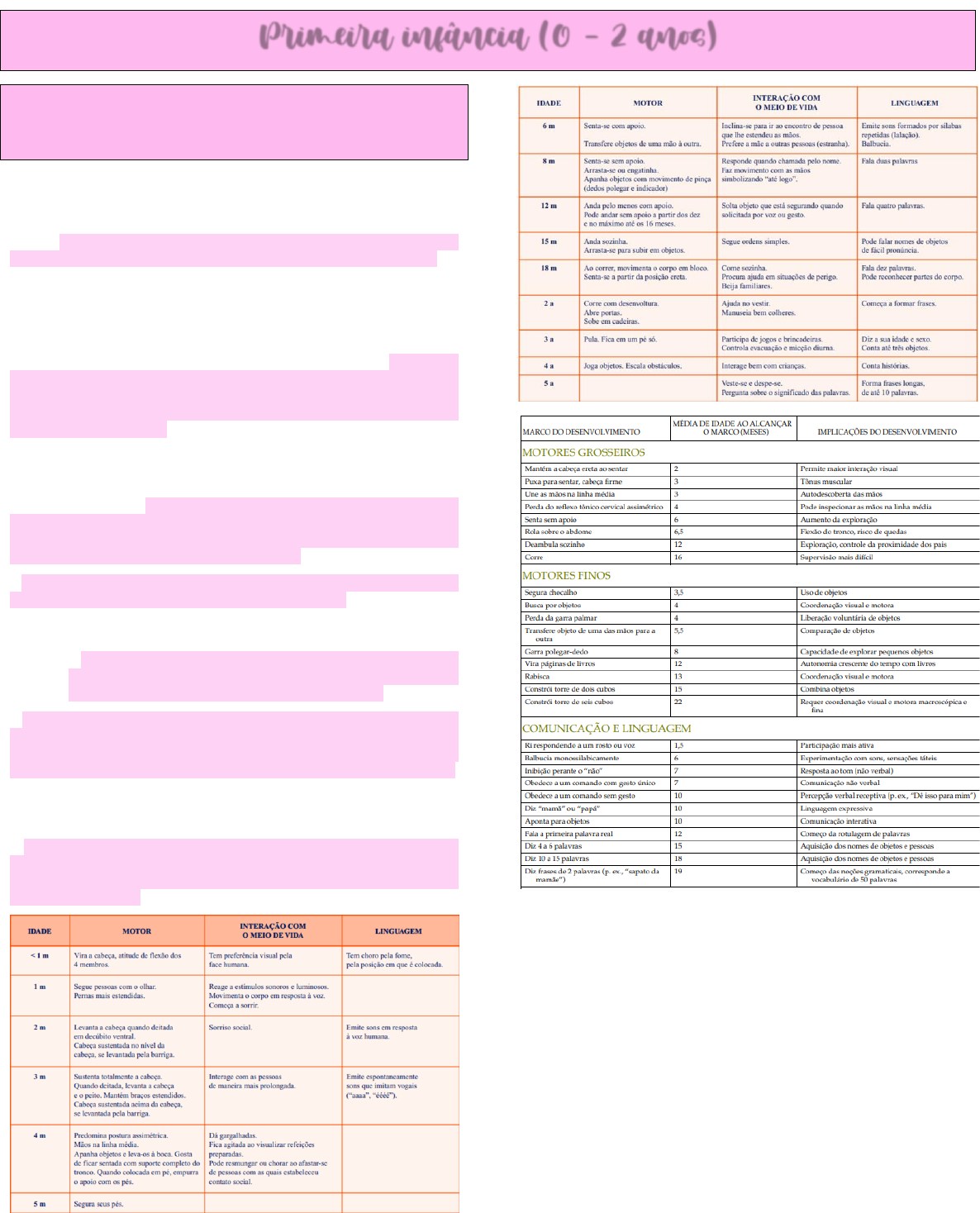 Primeira infância (0 – 2 anos) Marcos de desenvolvimento (neuropsicomotor) de crianças de 0 até 2 anos de idade e sua importância no diagnóstico de possíveis distúrbios relacionados. → AVALIAÇÃO - O período pré-natal e o primeiro ano de vida fornecem uma plataforma para crescimento e desenvolvimento notáveis, definindo a trajetória de vida de uma criança. A plasticidade neural, a capacidade de o cérebro ser moldado pelas experiências, tanto positivas como negativas, está em seu pico. - O volume cerebral total duplica no primeiro ano de vida e aumenta mais 15% durante o segundo ano. O volume total do cérebro no lactente com 1 mês de vida é aproximadamente 36% do volume de adulto, mas com 1 ano de idade é de cerca de 72% (83% aos 2 anos) - A aquisição de habilidades aparentemente “simples”, como a deglutição, reflete uma série de processos complicados e altamente coordenados envolvendo vários níveis de controle neural distribuídos entre vários sistemas fisiológicos cuja natureza e relações amadurecem durante todo o primeiro ano de vida. Uma aprendizagem substancial das ferramentas básicas da linguagem (fonologia, segmentação de palavras) ocorre durante a infância. - O processamento da fala em pessoas mais velhas requer redes neuronais precisas e definidas; o cérebro infantil apresenta uma organização estrutural e funcional semelhante à dos adultos, sugerindo que o processamento neurológico estrutural da fala possa orientar os bebês a descobrir as propriedades de sua língua nativa. - A mielinização do córtex começa entre o sétimo e oitavo mês da gestação e continua até a adolescência e juventude. Ocorre da região posterior para a anterior, viabilizando a maturação progressiva das vias sensoriais, motoras e finalmente das vias associativas. - Dada a importância do ferro, do colesterol e de outros nutrientes para o processo da mielinização, são importantes reservas adequadas desses durante toda a infância - A ingestão alimentar inadequada, interações insuficientes com os cuidadores ou com o ambiente em geral podem alterar os processos dependentes da experiência que são fundamentais para o desenvolvimento da estrutura e função do cérebro durante a infância. Embora alguns desses processos possam ser retardados, à medida que os períodos de plasticidade vão se concluindo nas fases de rápido desenvolvimento infantil, podem ocorrer déficits mais permanentes - Todos os parâmetros de crescimento devem ser traçados, utilizando as tabelas da Organização Mundial da Saúde, que mostram como as crianças desde o nascimento até 72 meses de vida “devem” crescer em circunstâncias ideais → IDADE DE 0 – 2 MESES - No lactente nascido a termo, no momento de nascimento a mielinização está presente no tronco cerebral dorsal, pedúnculos cerebelares e perna posterior da cápsula interna. A substância branca cerebelar adquire mielina por volta do primeiro mês de vida e está bem mielinizada aos 3 meses de idade. A substância branca subcortical do córtex parietal, frontal posterior, temporal e calcarina está parcialmente mielinizada aos 3 meses de idade. - Nesse período, o bebê experimenta um tremendo crescimento. Alterações fisiológicas possibilitam o estabelecimento de rotinas de alimentação eficazes e de um ciclo de sono-vigília previsível. As interações sociais que ocorrem à medida que os pais e os bebês realizam essas tarefas definem as bases para o desenvolvimento cognitivo e emocional. Desenvolvimento físico - O peso de um recém-nascido inicialmente pode diminuir 10% abaixo do peso ao nascer durante a primeira semana, como resultado da eliminação do excesso de fluido extravascular e da ingestão nutricional limitada. - A nutrição melhora à proporção que o colostro é substituído por um maior teor de gordura do leite materno, na medida em que as crianças aprendem sobre como se acoplar à mama e a sugar de maneira mais eficiente, e as mães tornam-se mais à vontade com as técnicas de amamentação. - Os lactentes recuperam ou excedem o peso ao nascer por volta da segunda semana de vida e devem crescer cerca de 30 g/dia durante o primeiro mês. Esse é o período mais rápido de crescimento pós-natal. Os braços ficam pendentes ao lado do corpo. Os movimentos dos membros consistem basicamente em contrações descontroladas, com abertura e fechamento das mãos aparentemente sem propósito. - O sorriso ocorre involuntariamente. O olhar, os giros da cabeça e a sucção são mais bem controlados e podem, portanto, ser utilizados para demonstrar a percepção e a cognição infantis. A preferência da criança em se voltar para a voz da mãe é uma evidência da memória de reconhecimento. Seis estados comportamentais foram descritos - Inicialmente, o sono e a vigília estão uniformemente distribuídos ao longo de 1 dia de 24 h. A maturação neurológica explica a consolidação do sono em blocos de 5 ou 6 h, com breves períodos de vigília para a alimentação. O aprendizado também ocorre; bebês cujos pais são consistentemente mais interativos e estimuladores durante o dia aprendem a concentrar seu sono durante a noite. Desenvolvimento cognitivo - Os bebês podem diferenciar entre padrões, cores e consoantes. Podem reconhecer expressões faciais (sorrisos) como semelhantes, mesmo quando esses aparecem em rostos diferentes. Podem também combinar propriedades abstratas dos estímulos, como contorno, intensidade ou padrão temporal, por meio de modalidades sensoriais. - Lactentes aos 2 meses de idade podem discriminar padrões rítmicos na língua nativa versus língua não nativa. Os bebês parecem buscar ativamente por estímulos, como se estivessem satisfazendo uma necessidade inata de dar sentido ao mundo. - Esses fenômenos apontam para a integração de estímulos sensoriais no sistema nervoso central. Os cuidados pelos pais e cuidadores fornecem estímulos visuais, táteis,