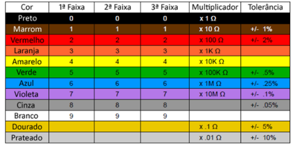 <p>Lista sobre código de resistores</p><p>1) Encontre o valor nominal, máximo e mínimo dos códigos de cores abaixo.</p><p>a) Marrom, Marrom, Marrom, Dourado;</p><p>b) Amarelo, Violeta, Vermelho, Prata;</p><p>c) Laranja, Laranja, Marrom, Dourado;</p><p>d) Cinza, Verde, Verde, Marrom;</p><p>e) Vermelho, Verde, Laranja, Dourado;</p><p>f) Amarelo, Violeta, Verde, Dourado;</p><p>g) Azul, Cinza, Dourado, Marrom;</p><p>h) Violeta, Amarelo, Amarelo, Dourado.</p><p>2) Segundo o código de cores, um resistor com as faixas (1ª , 2ª e 3ª ) de cores vermelho, amarelo e</p><p>laranja, possui uma resistência, em Ω, de</p><p>3) Segundo o código de cores, um resistor com as faixas (1ª , 2ª e 3ª ) de cores violeta, azul e</p><p>laranja, possui uma resistência, em Ω, de</p><p>4) Encontre o valor nominal, máximo e mínimo dos códigos de cores abaixo.</p><p>a) Marrom, Violeta, Marrom, Vermelho e Dourado;</p><p>b) Amarelo, Amarelo, Vermelho e Preto Prata;</p><p>c) Laranja, Verde, Marrom, Vermelho e Dourado;</p><p>d) Cinza, Marrom, Verde, Amarelo e Marrom;</p><p>e) Azul, Verde, Amarelo, Cinza e Dourado;</p><p>f) Branco, Preto, Vermelho, Verde e Dourado;</p><p>g) Azul, Amarelo, Branco, Marrom e Marrom;</p><p>h) Violeta, Amarelo, Amarelo, Laranja e Verde.</p><p>5) Encontre o valor nominal, máximo e mínimo dos códigos de cores abaixo.</p><p>a) Cinza, Violeta, Verde, Vermelho; Dourado; vermelho;</p><p>b) Azul, Amarelo, Verde, Preto, Prata; marrom;</p><p>c) Laranja, cinza, violeta, Vermelho, Dourado; laranja;</p><p>d) Cinza, branco, Azul, Amarelo, Marrom; Amarelo;</p><p>e) Azul, Cinza, Amarelo, Azul, Dourado; Violeta;</p><p>f) Marrom, Amarelo, Laranja, Verde, Dourado; Azul;</p><p>g) Azul, Amarelo, Branco, Marrom, Marrom; Laranja;</p><p>h) Violeta, Azul, Preto, Vermelho; Verde; Marrom;</p><p>Resistores de 4 e 5 faixas:</p><p>Resistores de 6 faixas:</p>