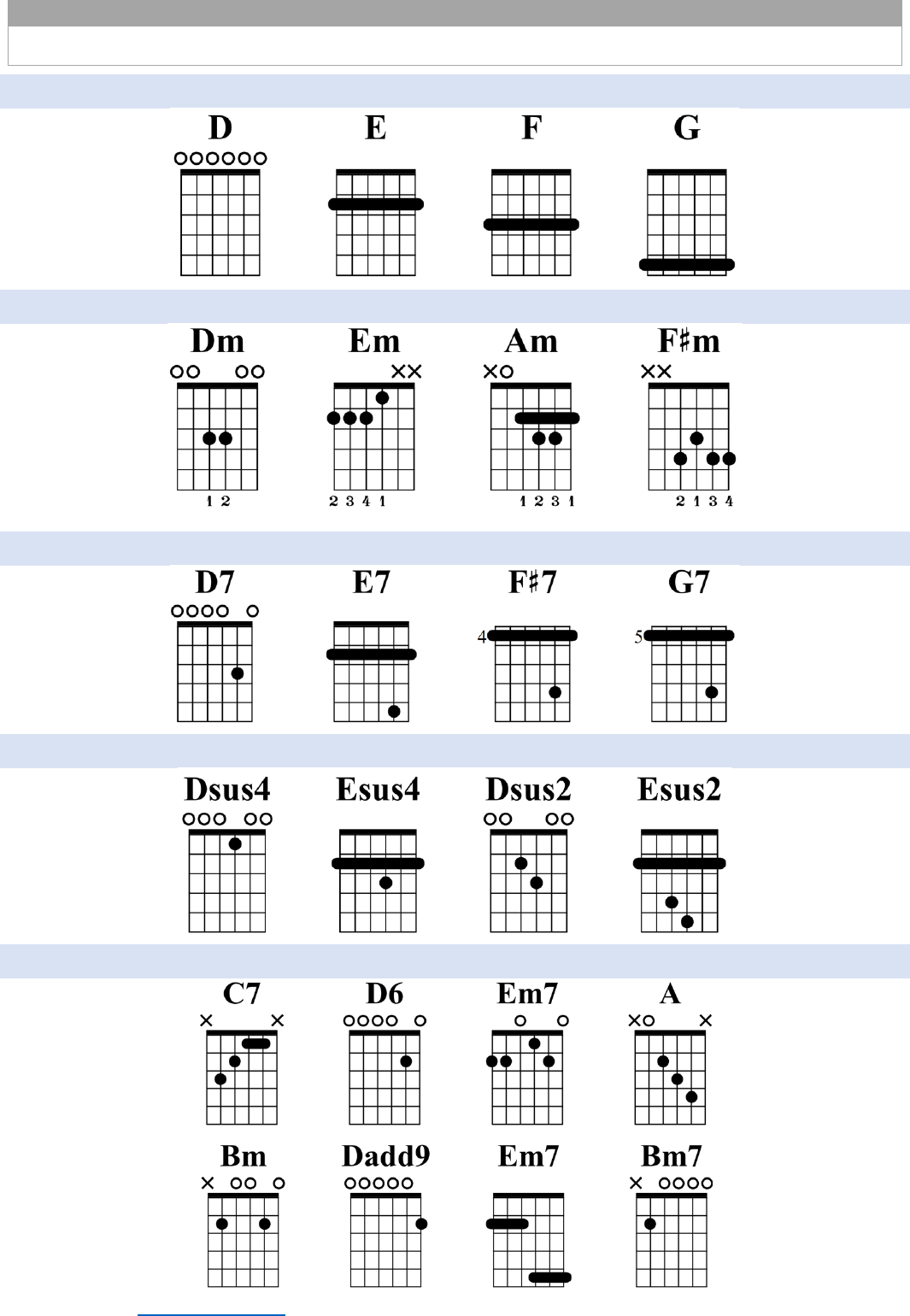 <p>Downloaded from guitargearfinder.com</p><p>Tuning Name 6th String (thickest) 5th String 4th String 3rd String 2nd String 1st String (thinnest)</p><p>Open D D2 A2 D3 F#3 A3 D4</p><p>MAJOR CHORDS (MOVEABLE SHAPE)</p><p>MINOR CHORDS (SOME SHAPES ARE MOVEABLE)</p><p>SEVENTH CHORDS (MOVEABLE SHAPE)</p><p>SUSPENDED CHORDS (MOVEABLE SHAPES)</p><p>OPEN CHORDS</p><p>OPEN D TUNING</p><p>https://guitargearfinder.com/</p>