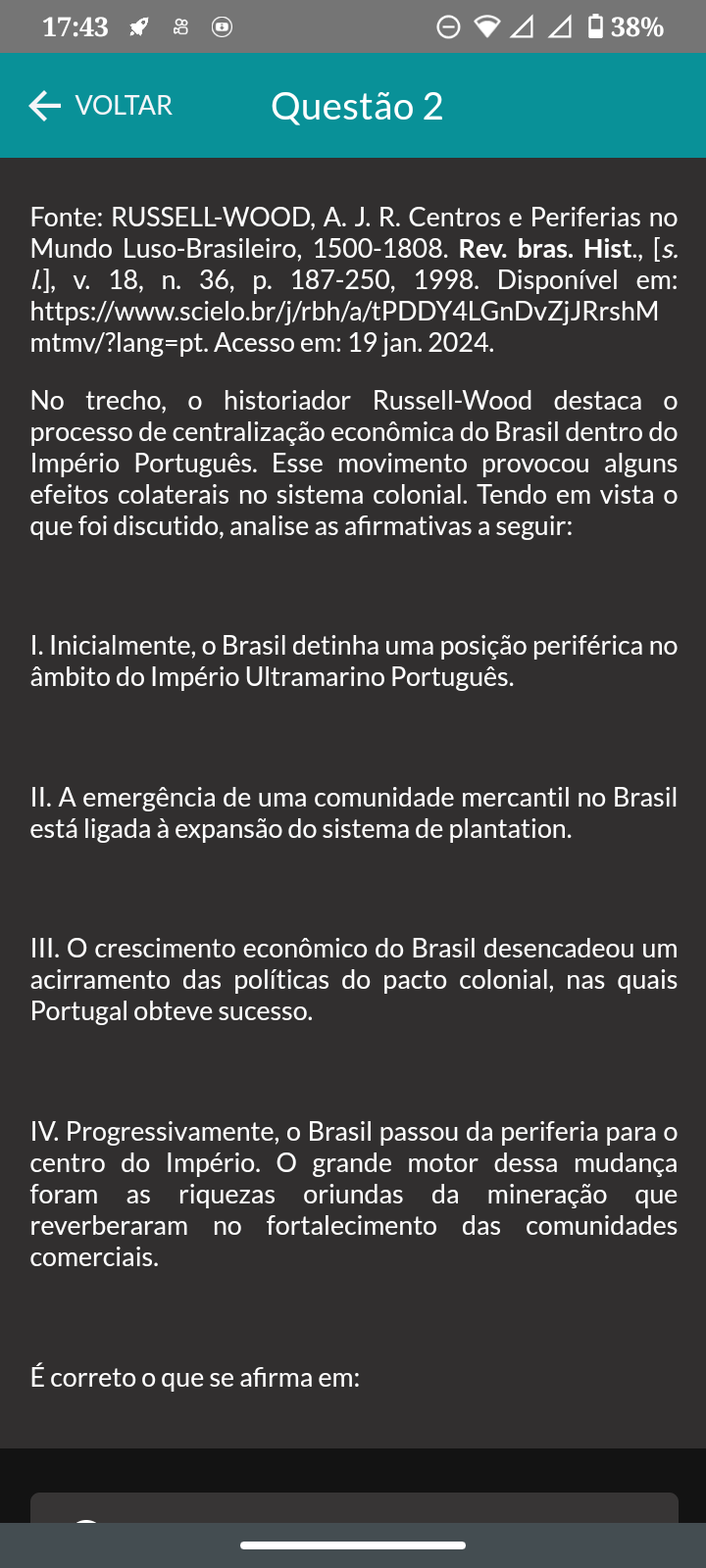 <p>17:43 38% VOLTAR Questão 2 Fonte: A. J. R. Centros e Periferias no Mundo Luso-Brasileiro, 1500-1808. Rev. bras. Hist., [s. V. 18, n. 36, p. 187-250, 1998. Disponível em: https://www.scielo.br/j/rbh/a/tPDDY4LGnDvZjJRrshM mtmv/?lang=pt. Acesso em: 19 jan. 2024. No trecho, historiador Russell-Wood destaca processo de centralização econômica do Brasil dentro do Império Português. Esse movimento provocou alguns efeitos colaterais no sistema colonial. Tendo em vista que foi discutido, analise as afirmativas a seguir: I. Inicialmente, O Brasil detinha uma posição periférica no âmbito do Império Ultramarino Português. II. A emergência de uma comunidade mercantil no Brasil está ligada à expansão do sistema de plantation. III. O crescimento econômico do Brasil desencadeou um acirramento das políticas do pacto colonial, nas quais Portugal obteve sucesso. IV. Progressivamente, Brasil passou da periferia para centro do Império. O grande motor dessa mudança foram as riquezas oriundas da mineração que reverberaram no fortalecimento das comunidades comerciais. É correto que se afirma em:</p>